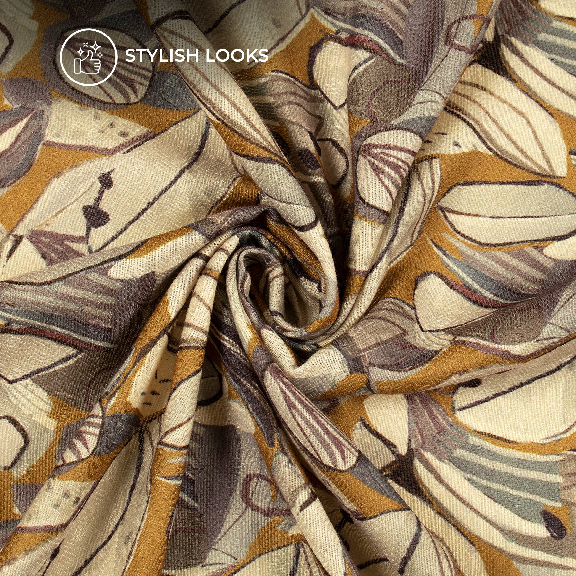 Murstard Yellow Leaf Digital Print Blend Pashmina Fabric