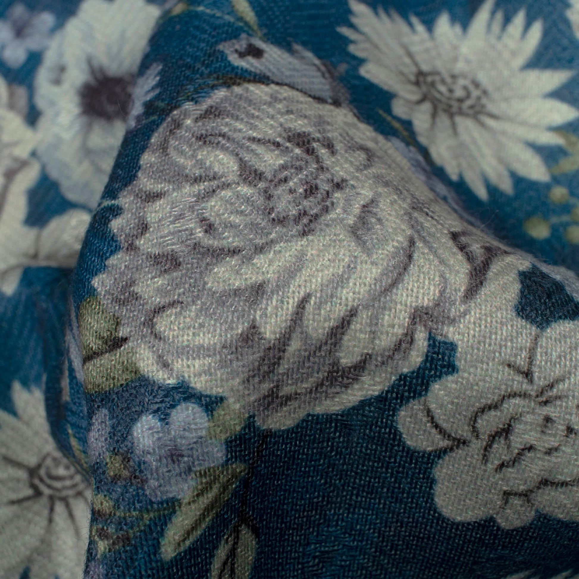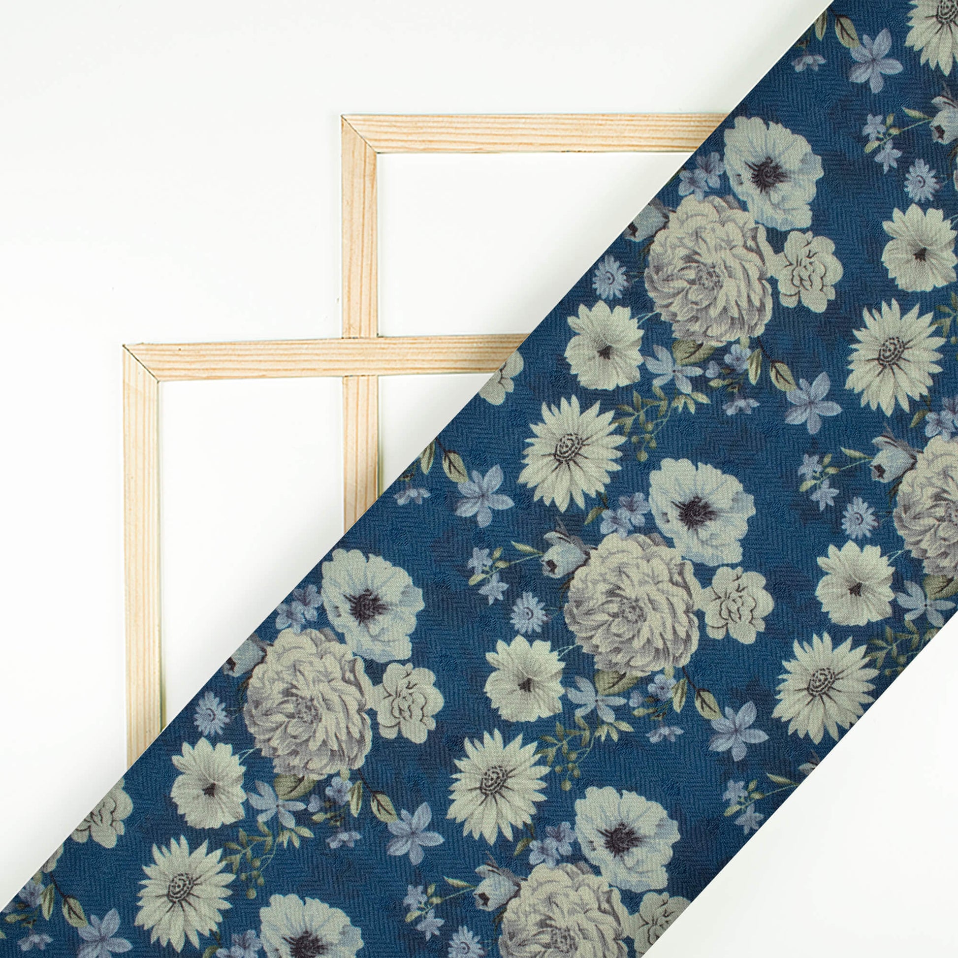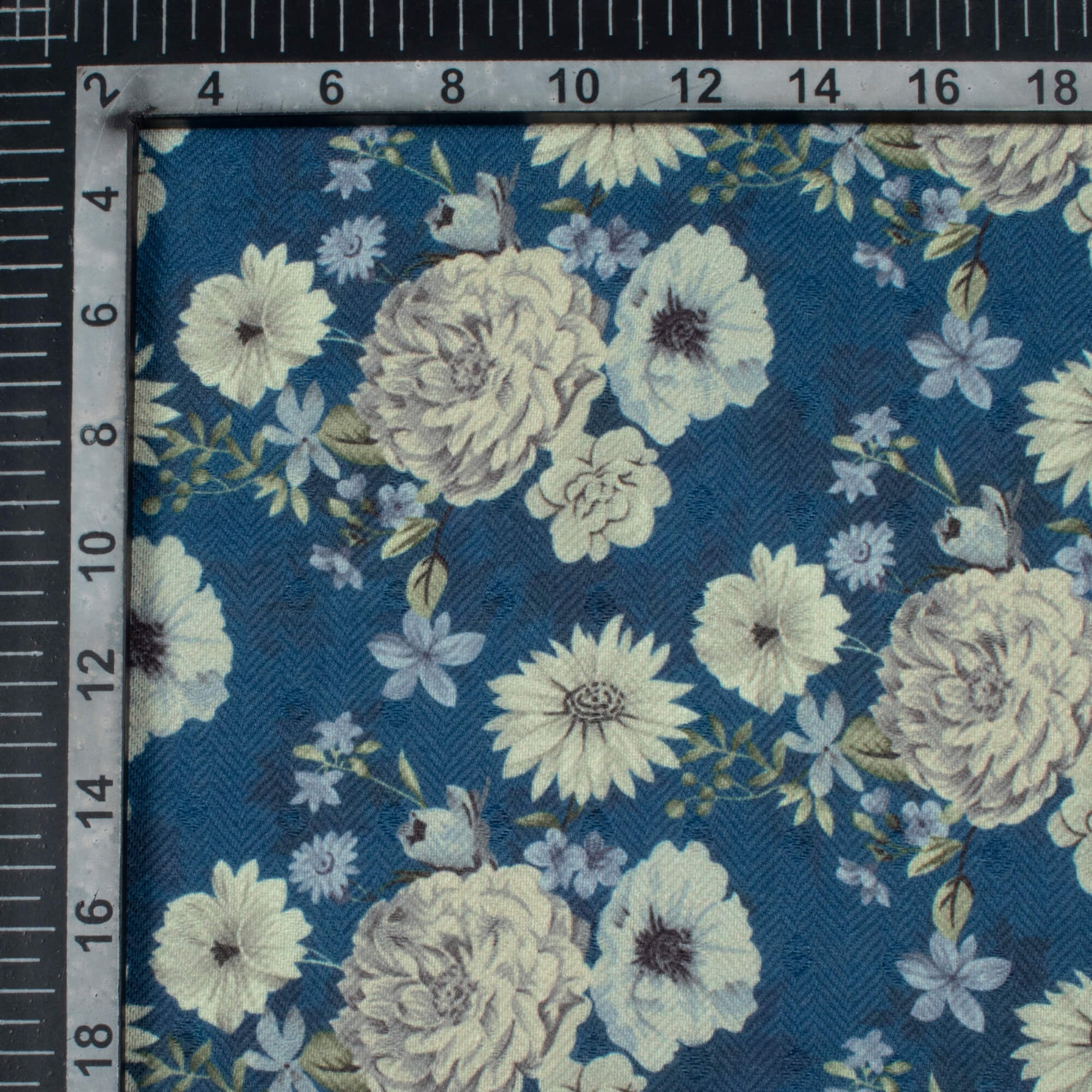 Navy Blue And Cream Floral Pattern Digital Print Elegant Blend Pashmina Fabric