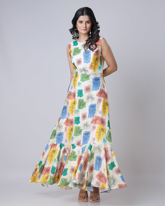 Beige Abstract Floral Pre-Draped Gown Saree With Pleated Pallu Beige Abstract Floral Pre-Draped Gown Saree With Pleated Pallu
