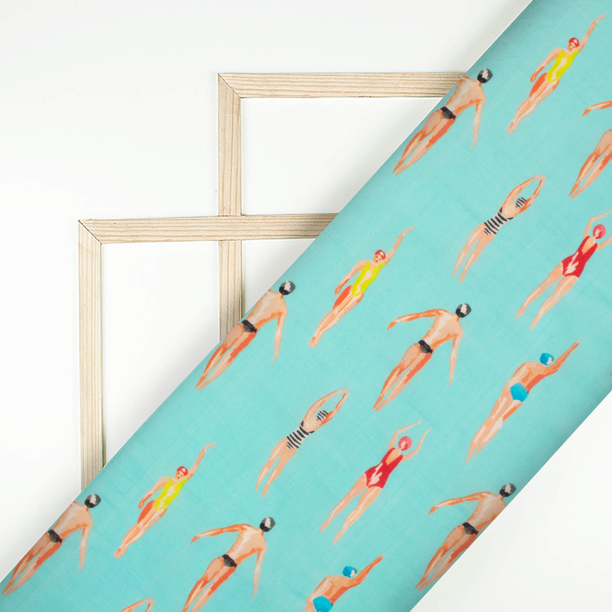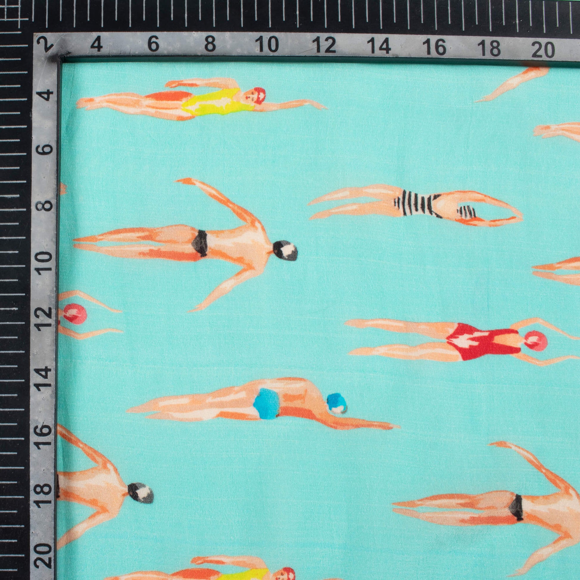 Baby Blue And Blood Red Quirky Pattern Digital Print Viscose Natural Crepe Fabric
