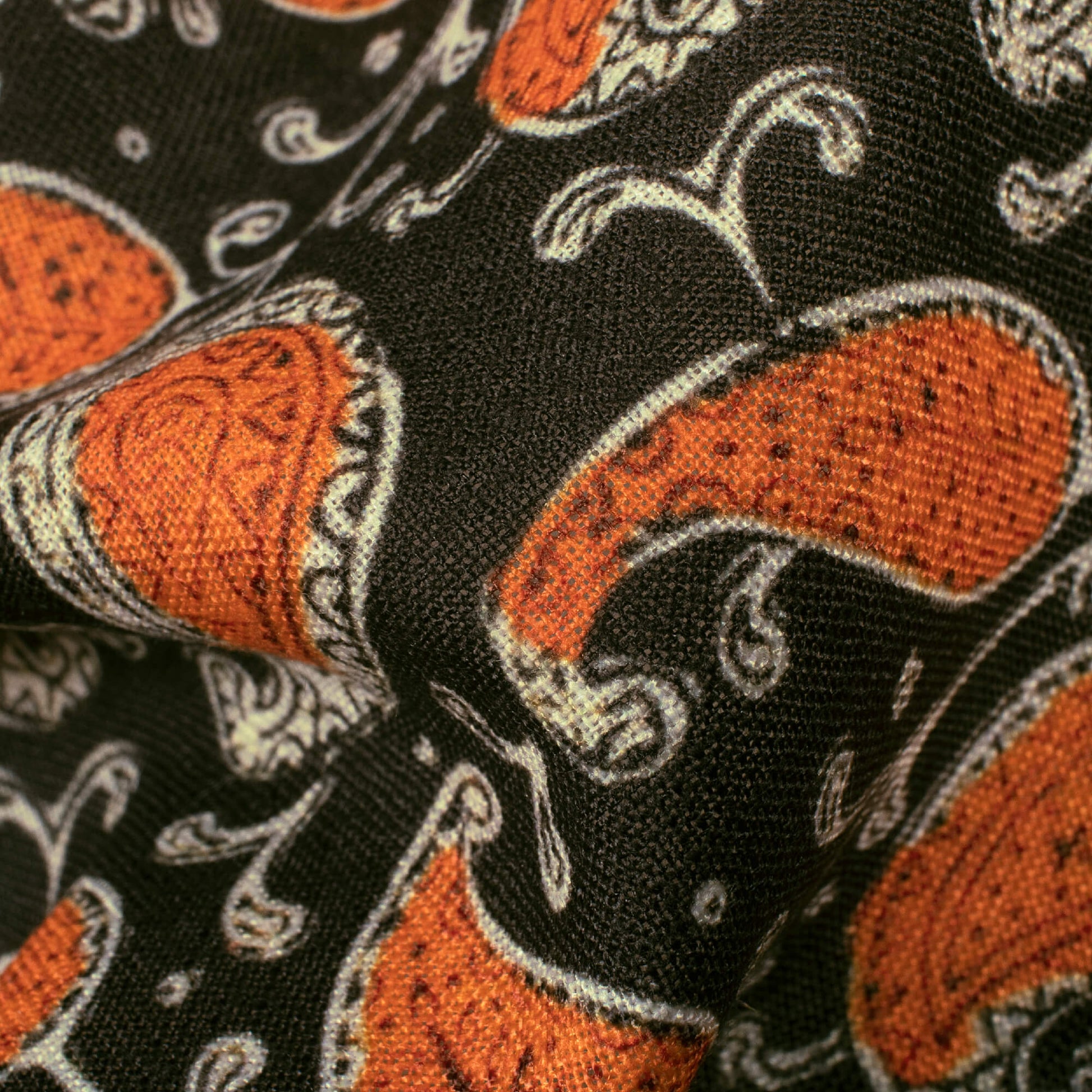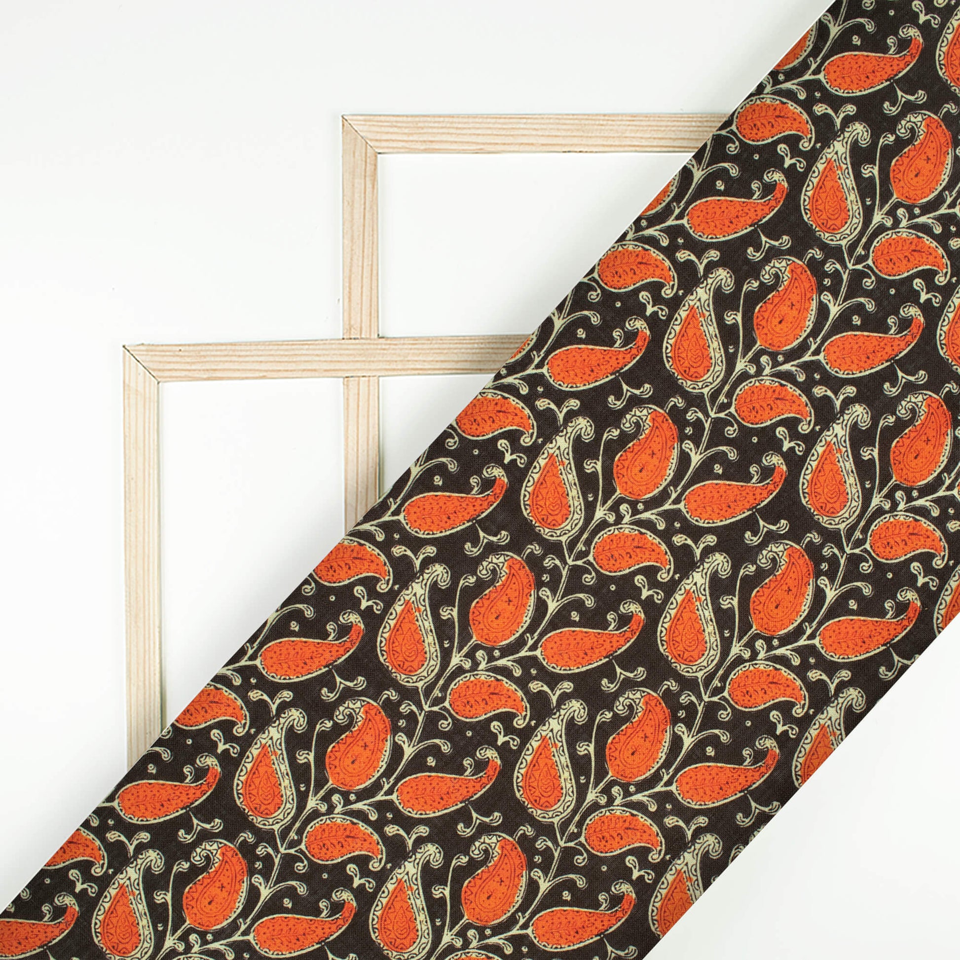 Black And Dark Orange Paisley Pattern Digital Print Linen Textured Fabric (Width 56 Inches)