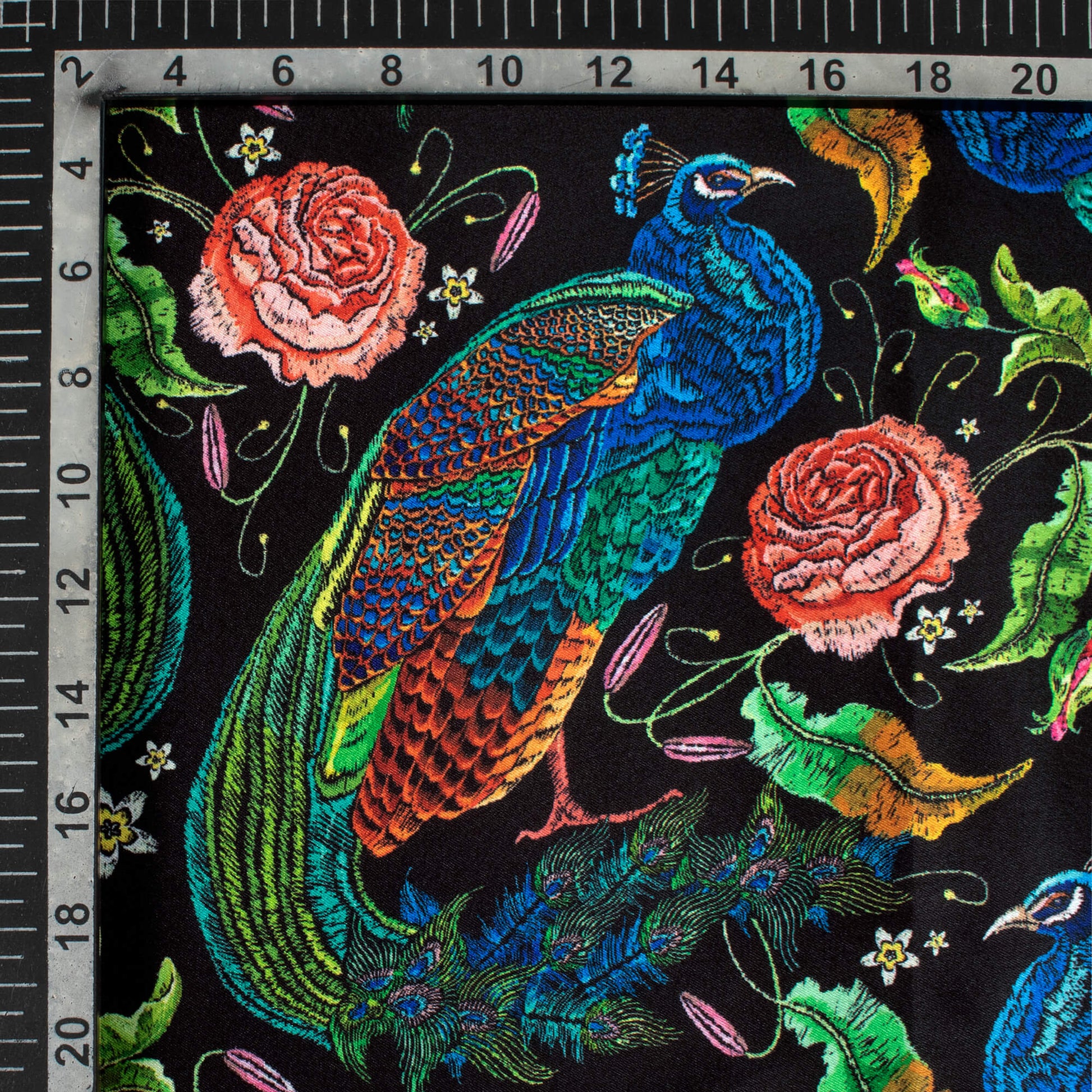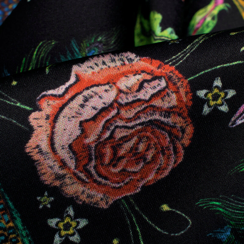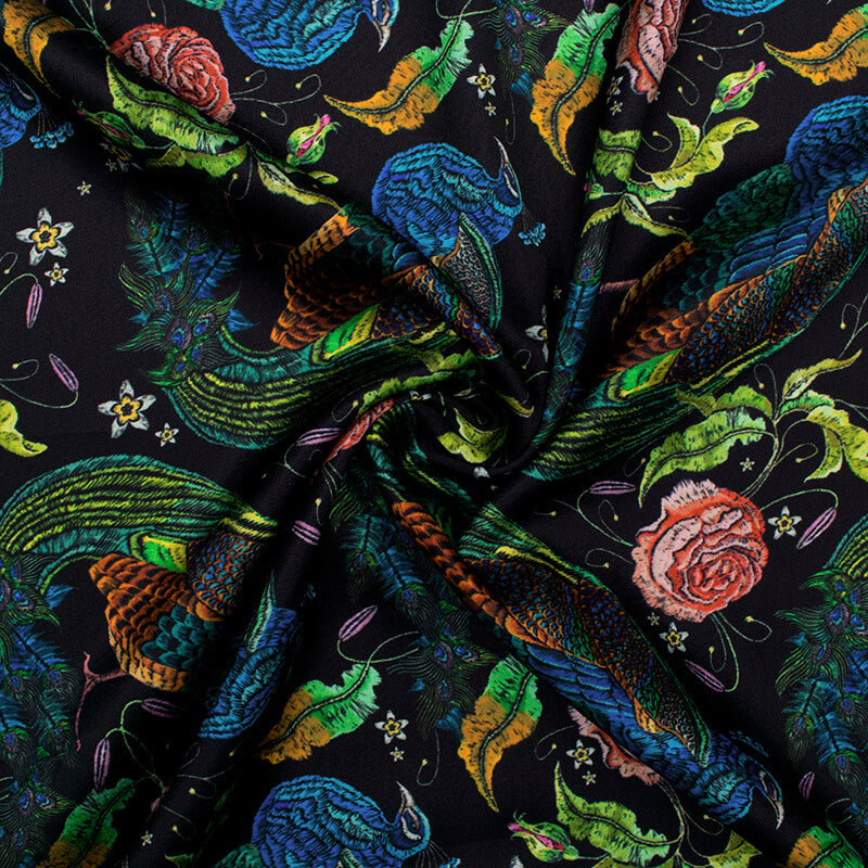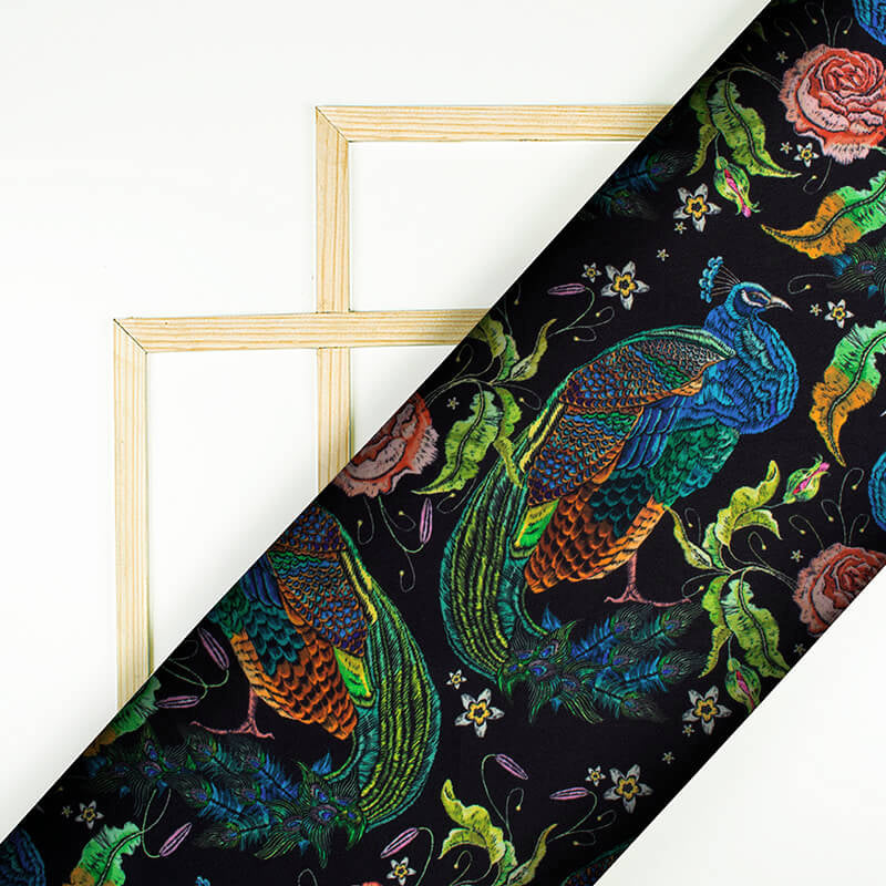 Black And Green Peacock Pattern Digital Print Japan Satin Fabric
