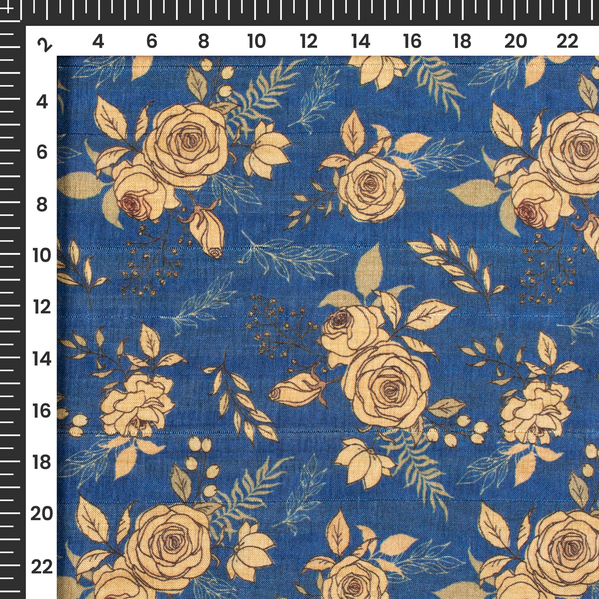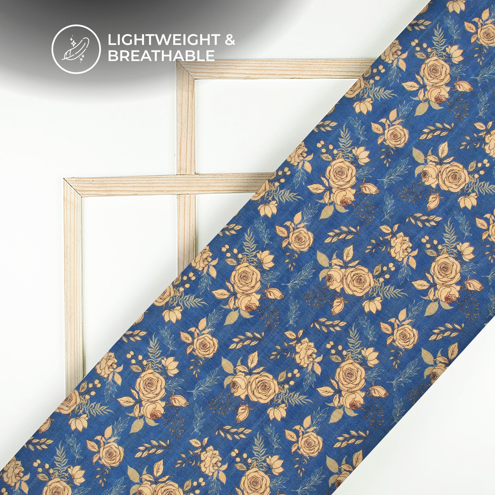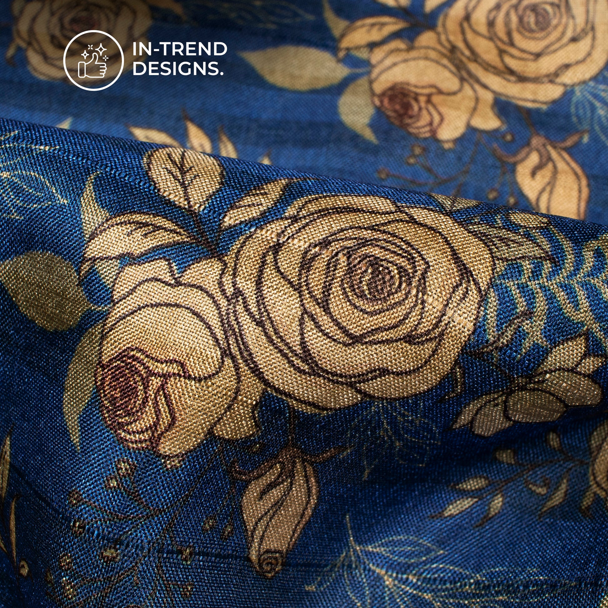 Cobalt Blue Floral Digital Print Art Tusser Silk Fabric