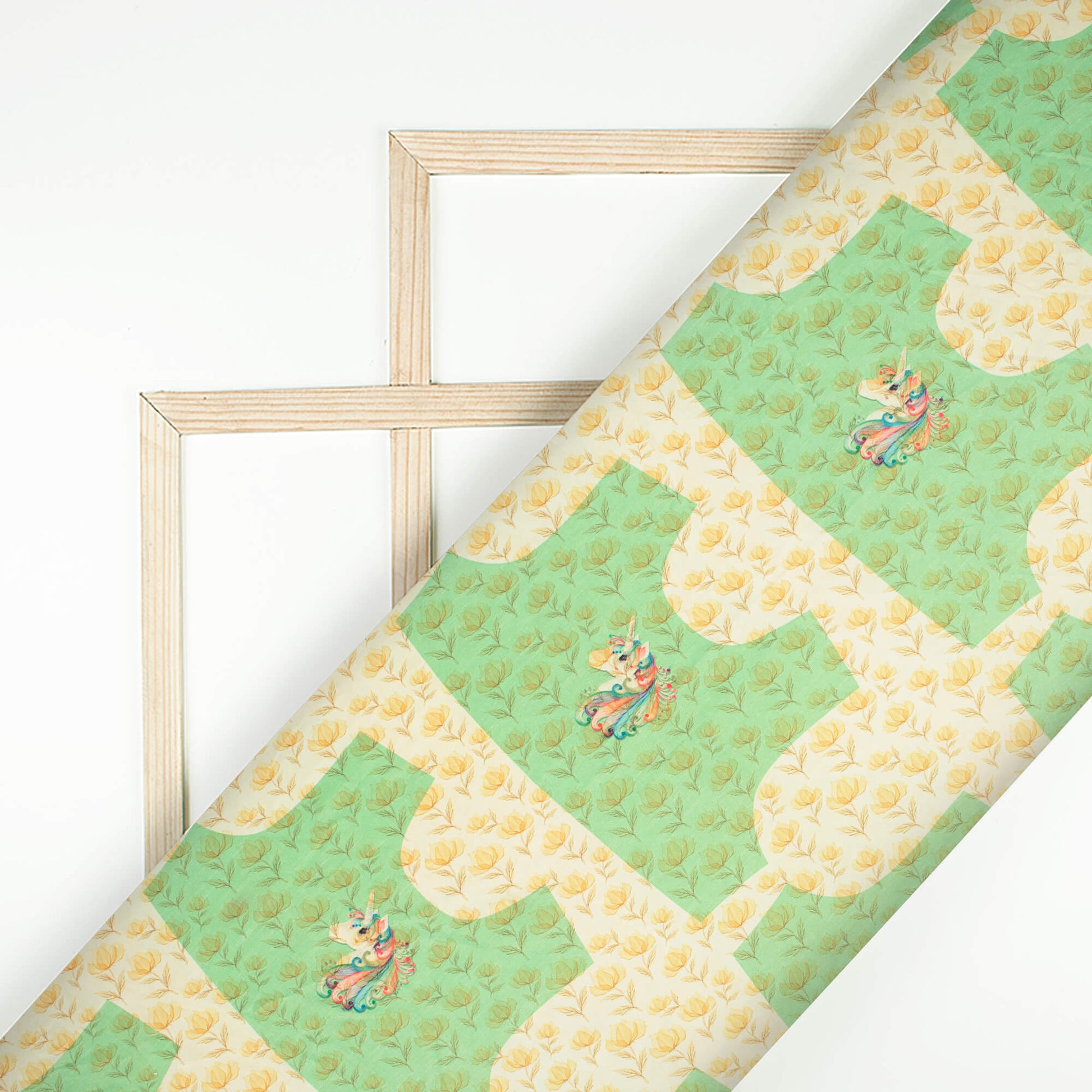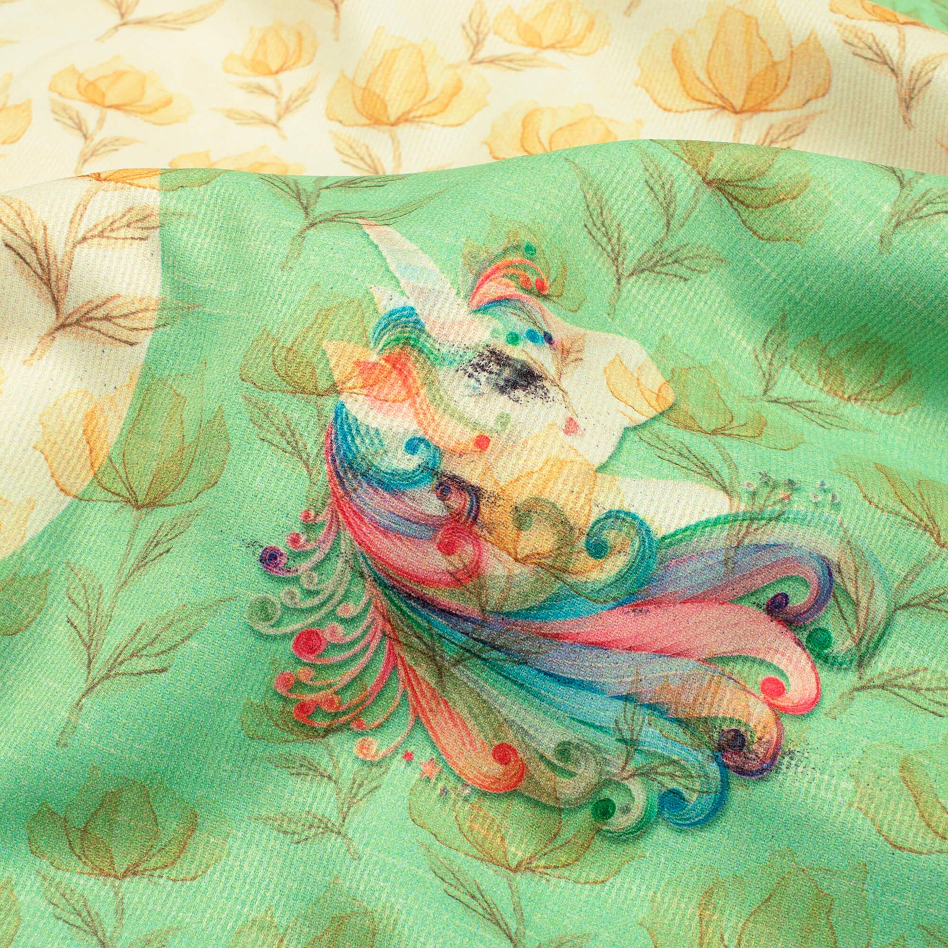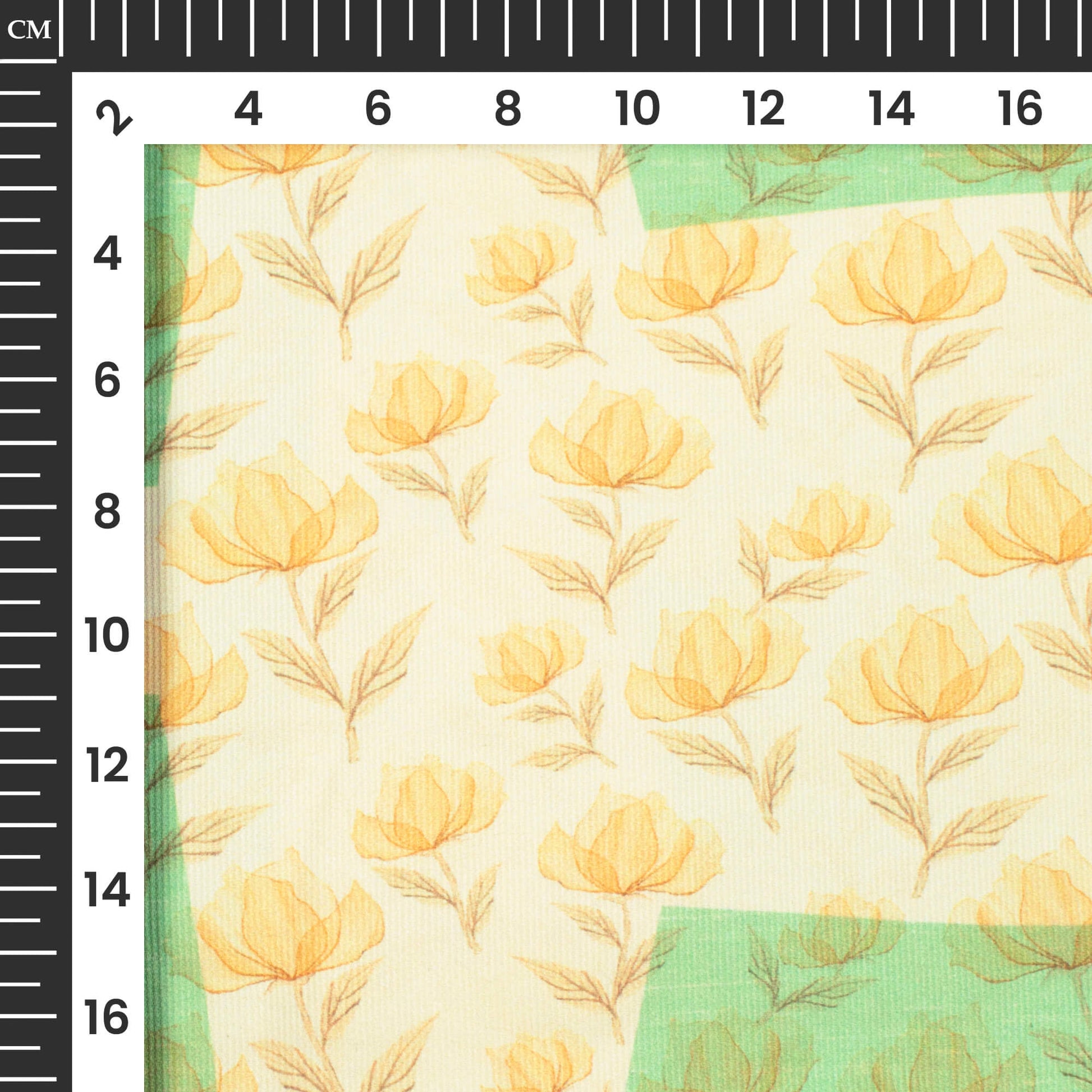 Cream And Fern Green Floral Pattern Digital Print Twill Fabric (Width 56 Inches)