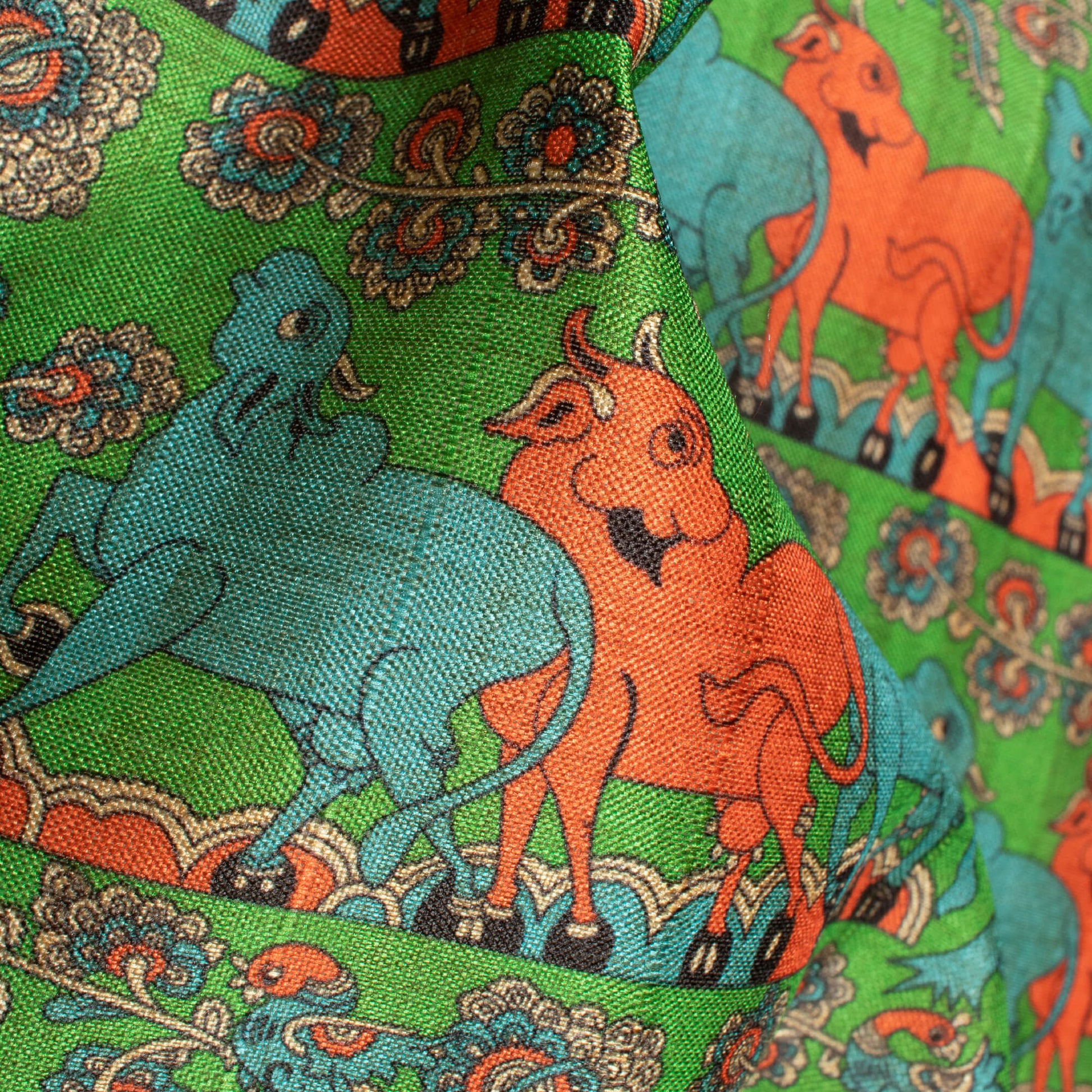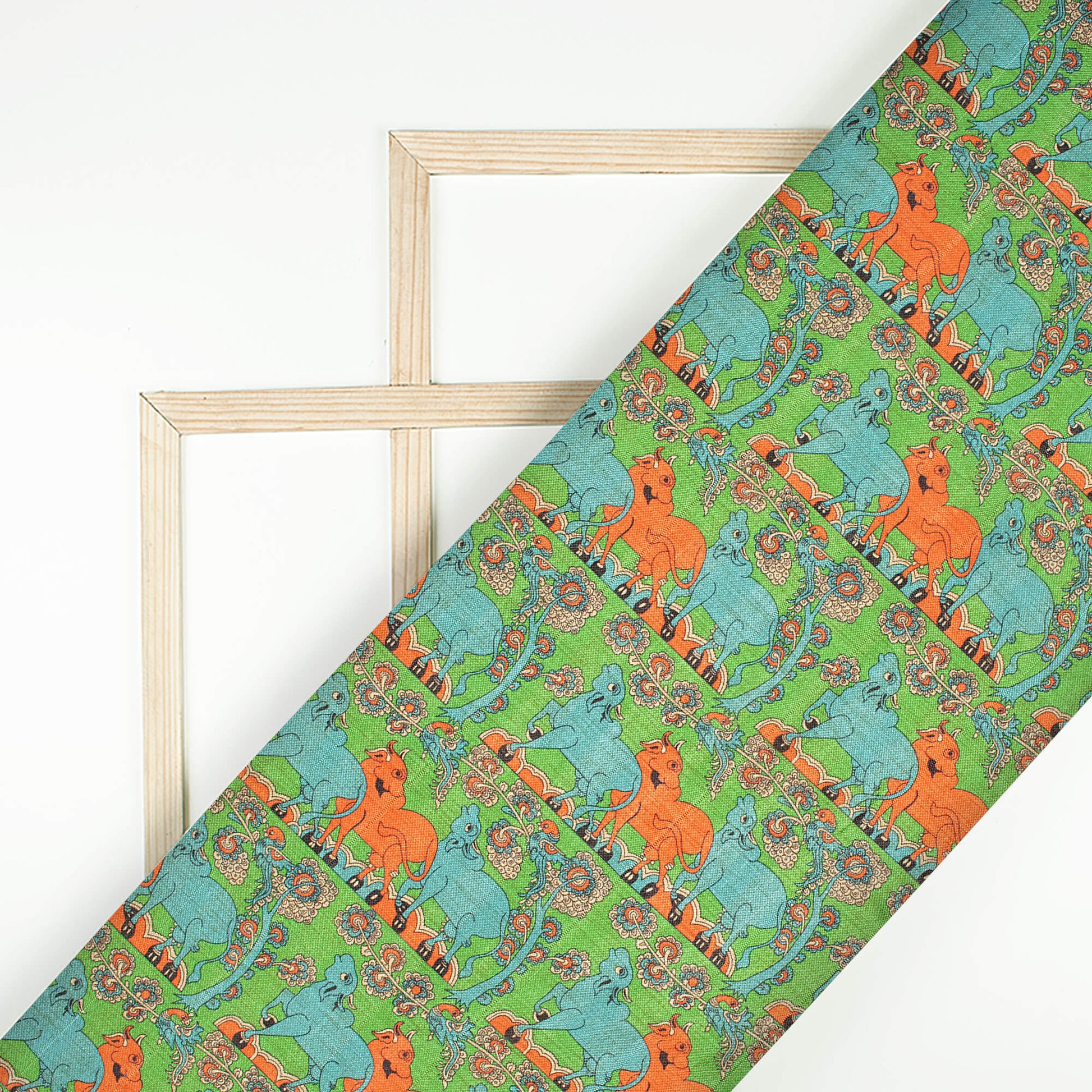 Emerald Green And Slate Blue Animal Pattern Digital Print Art Tusser Silk Fabric