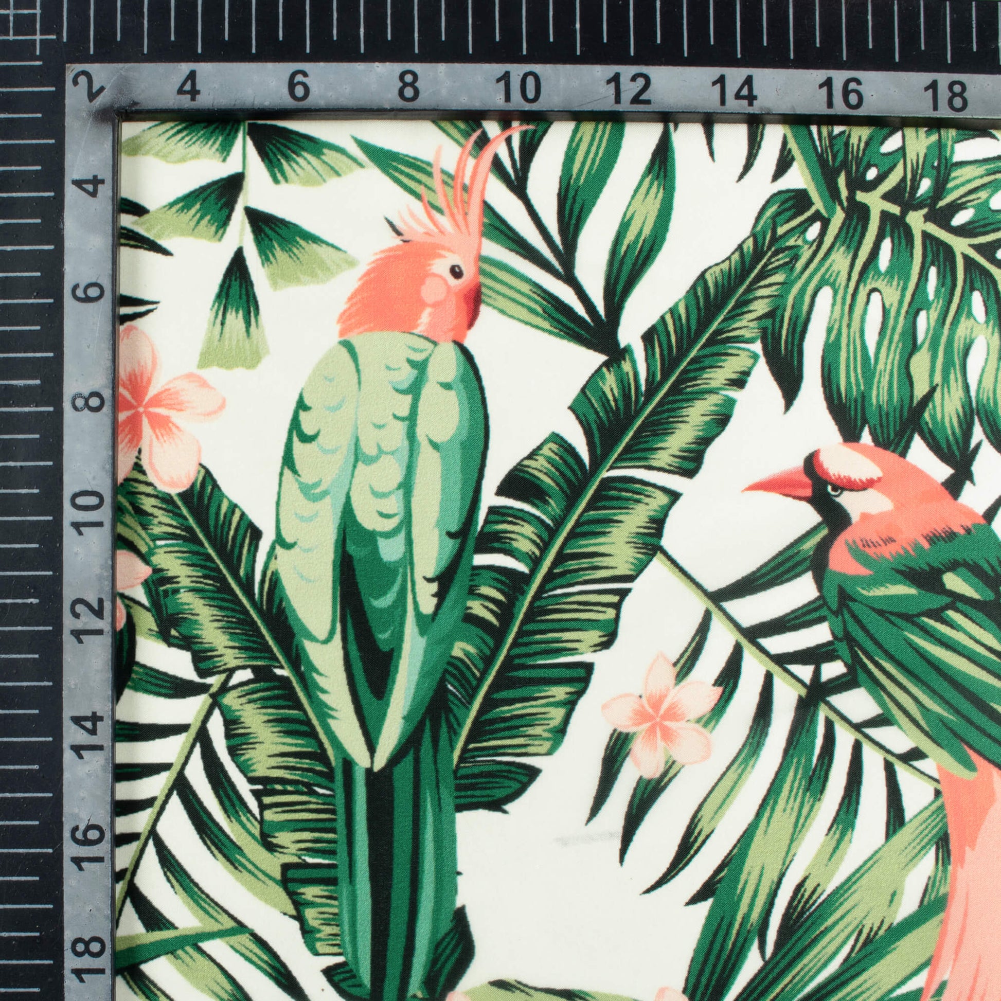 Forest Green And Coral Pink Bird Pattern Digital Print Organza Satin Fabric