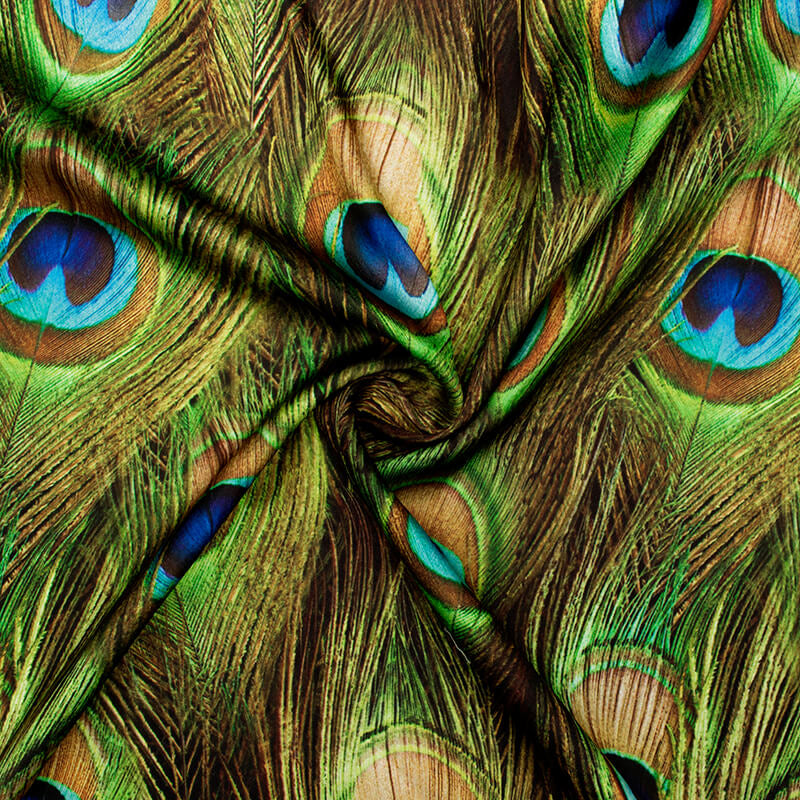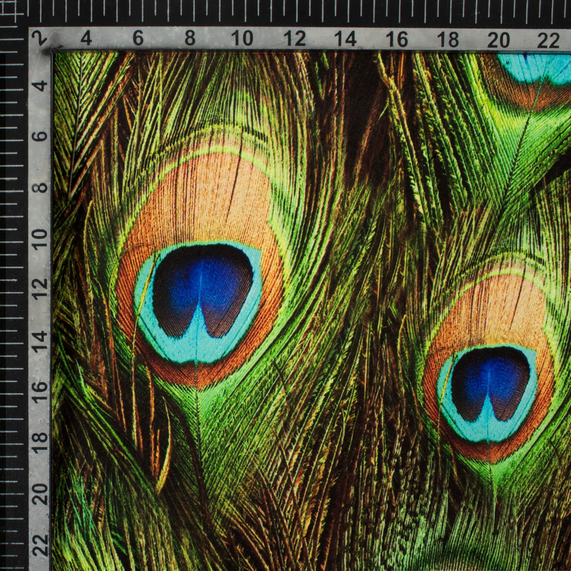 Green And Navy Blue Peacock Feather Pattern Digital Print Japan Satin Fabric
