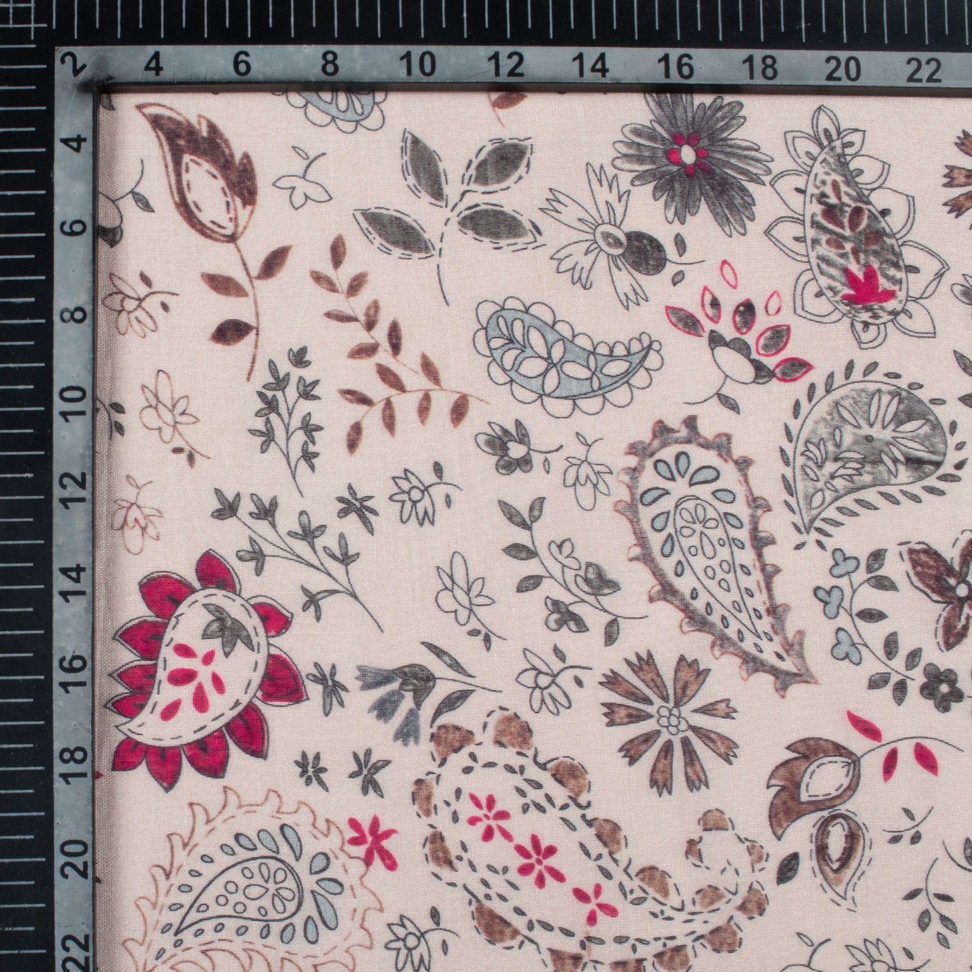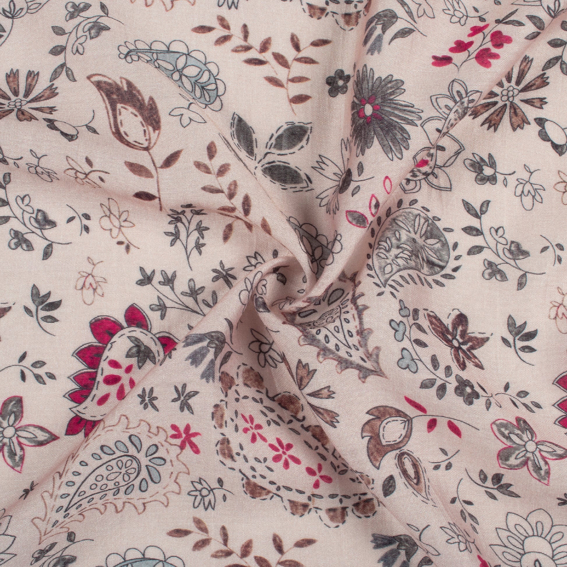 Ivory Beige And Sage Grey Leaf Pattern Digital Print Viscose Chanderi Fabric