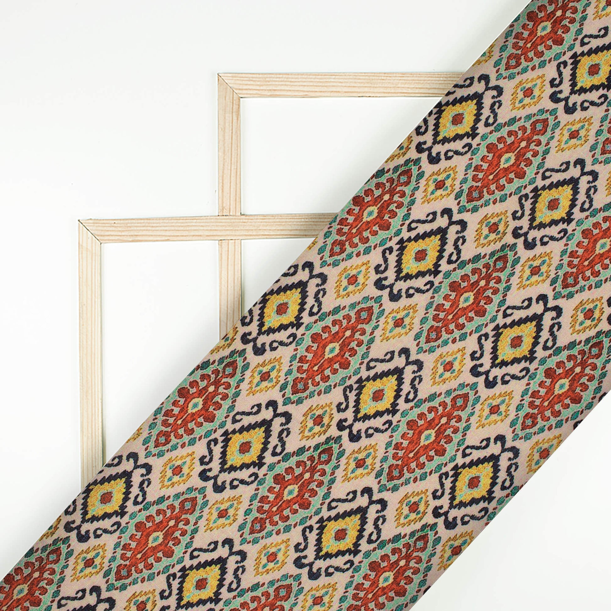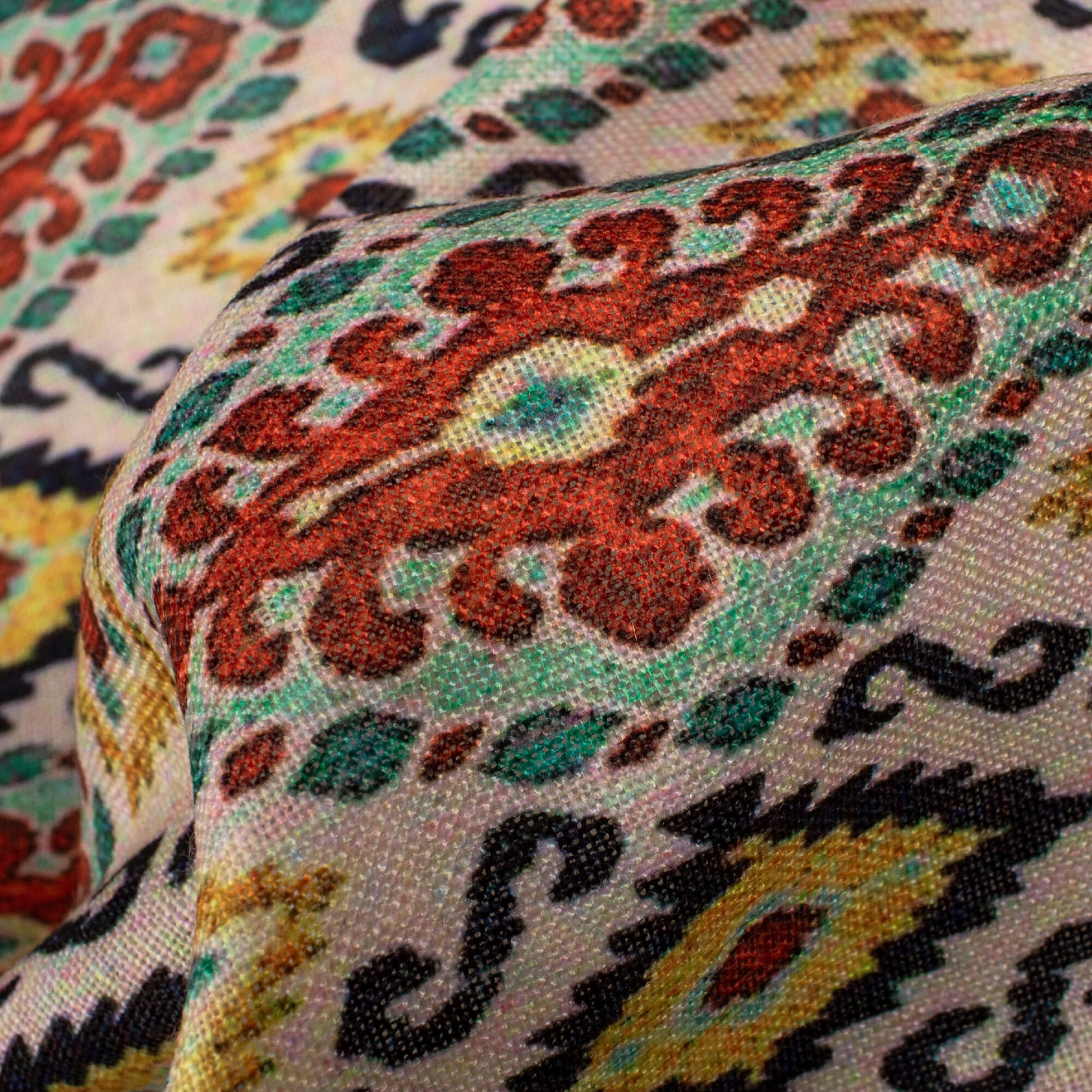 Ivory Cream And Blood Red Ethnic Pattern Digital Print Linen Textured Fabric (Width 56 Inches)