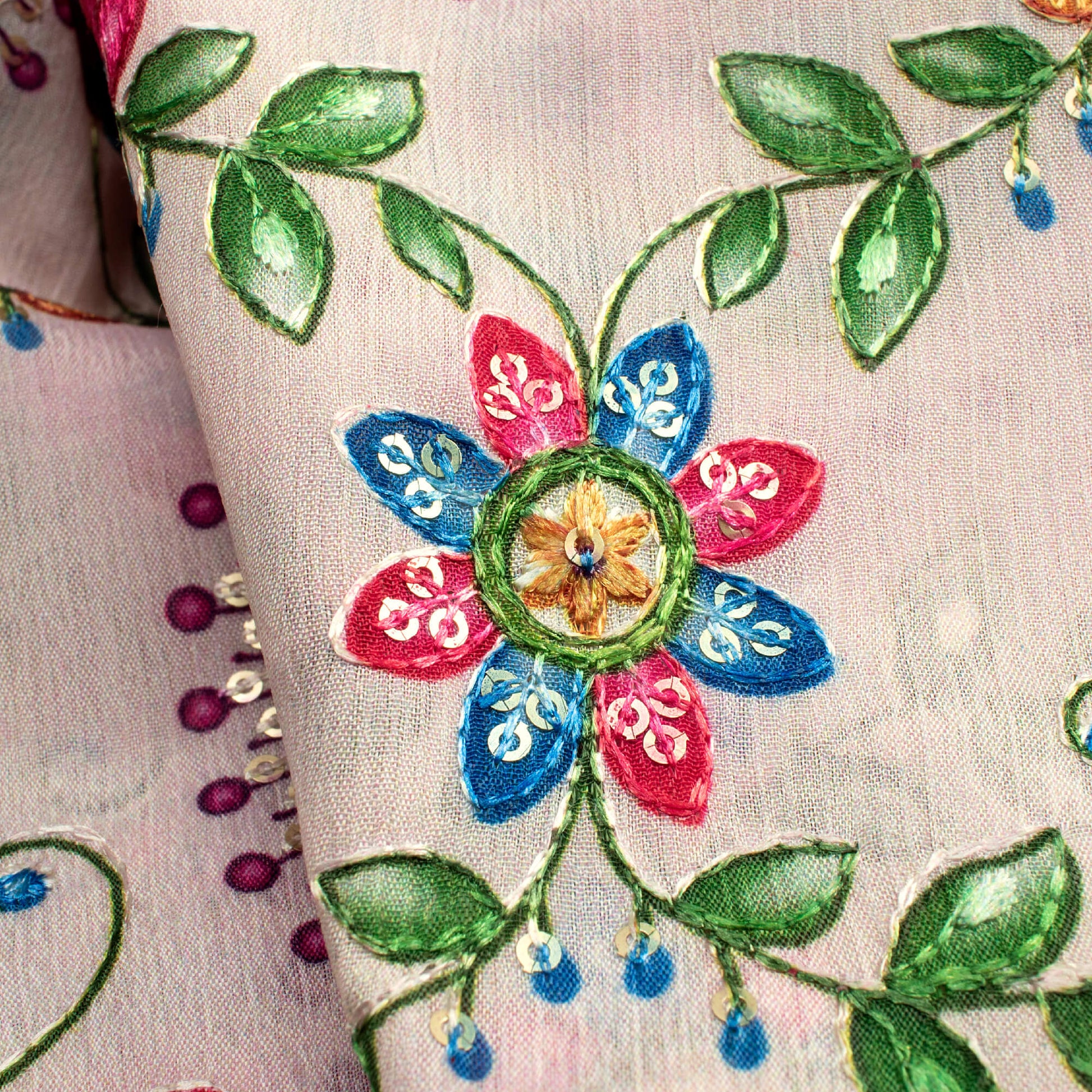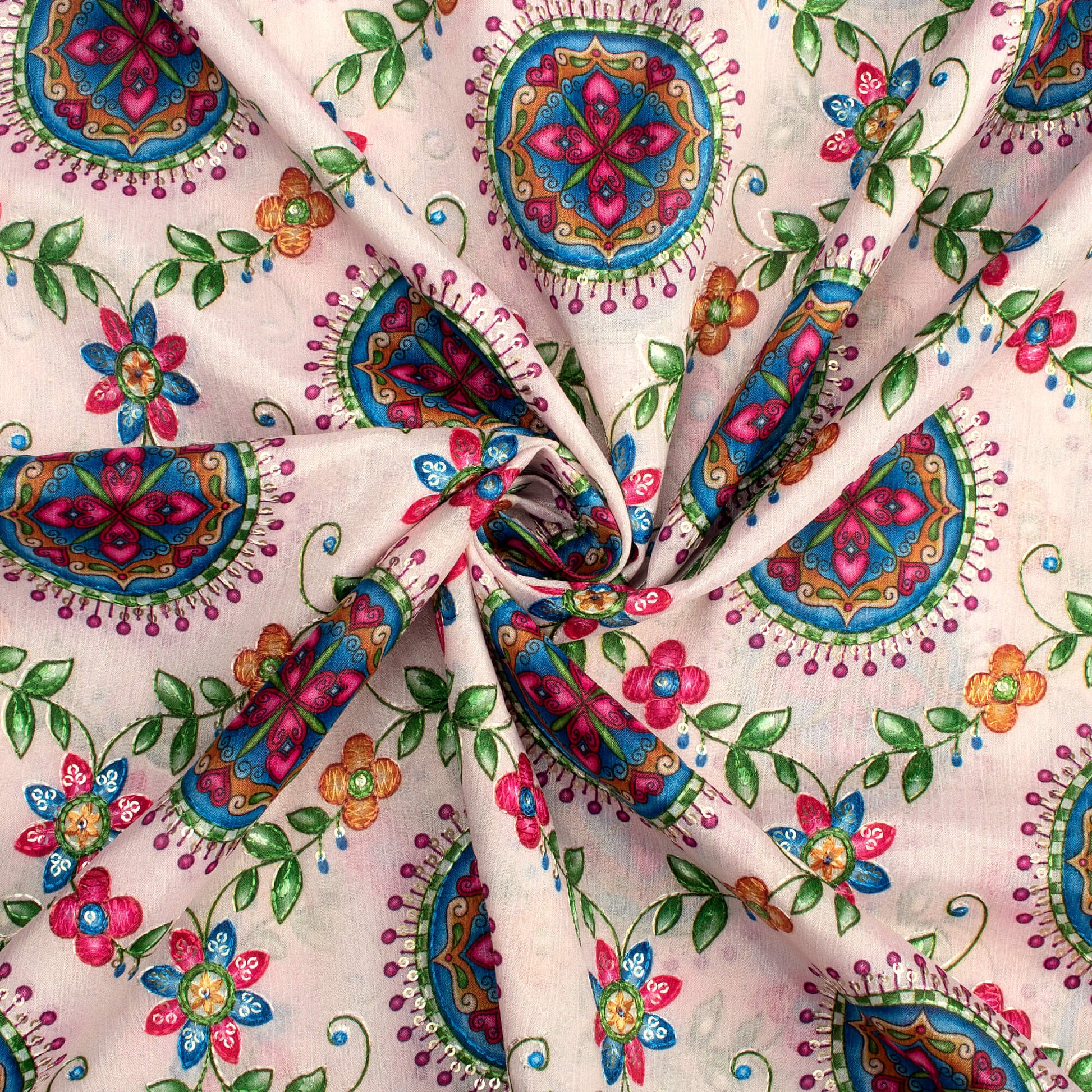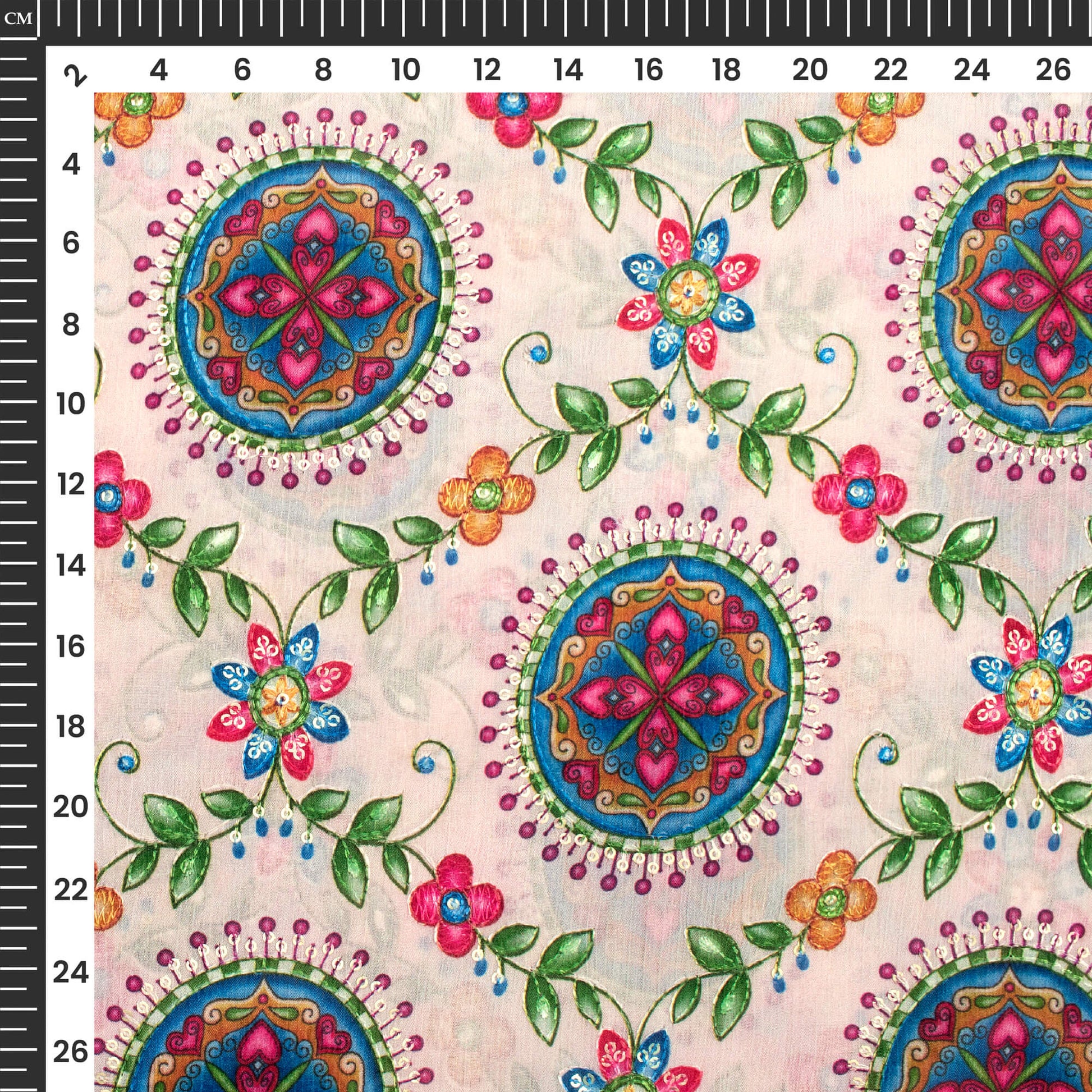 Magenta Pink Floral Position Print On Sequins Embroidery Chinnon Chiffon Fabric