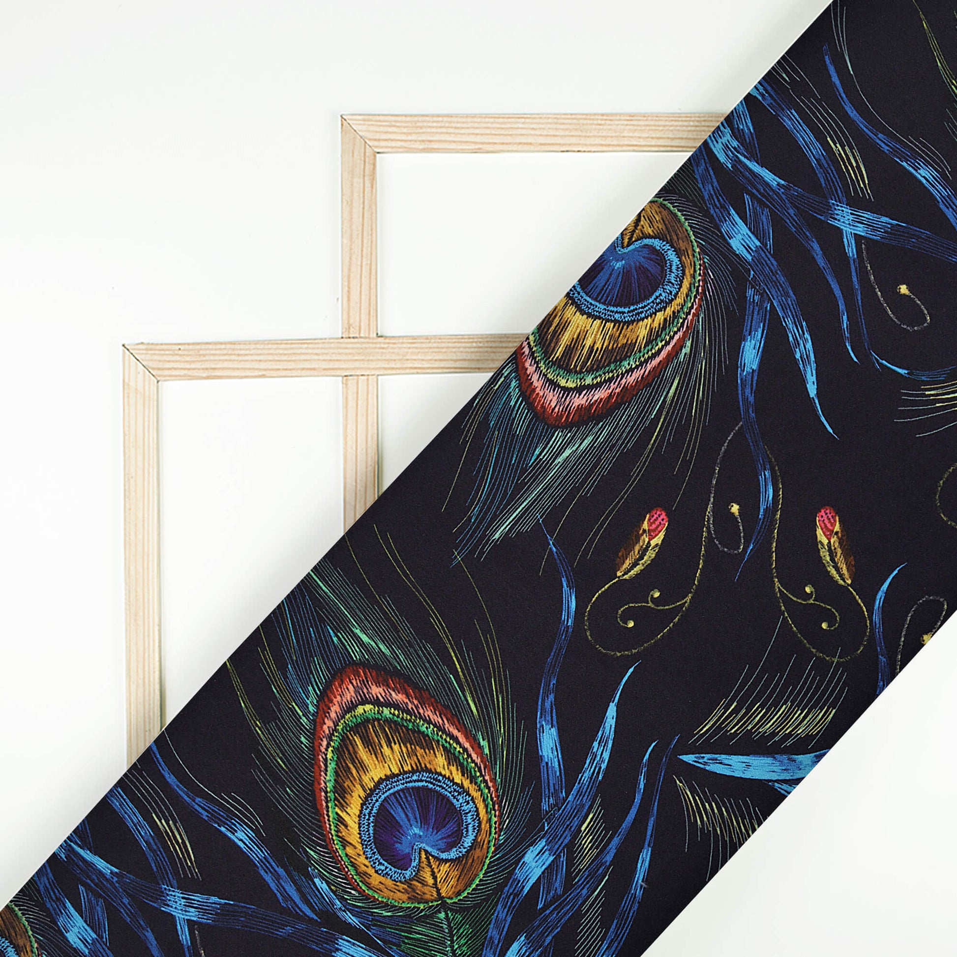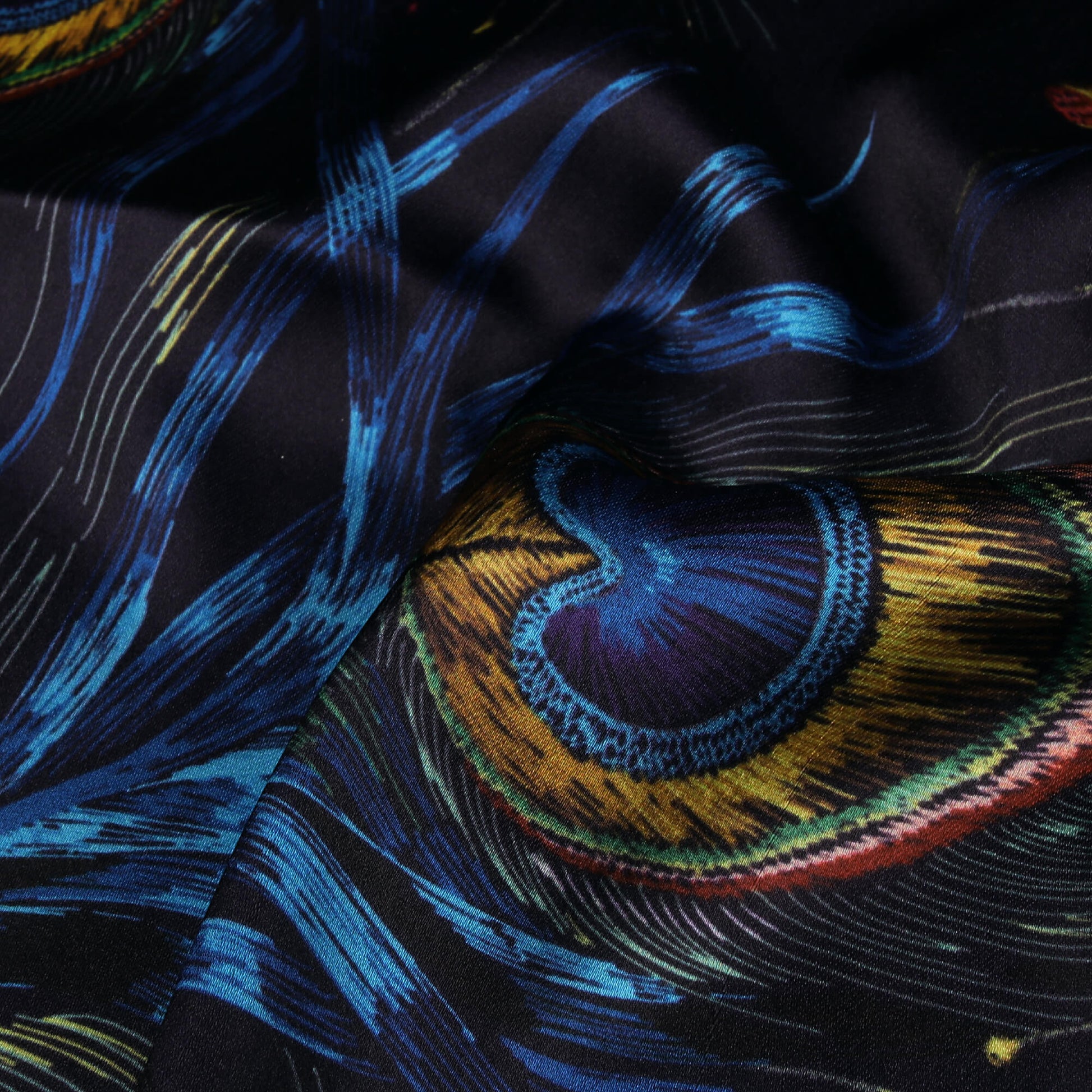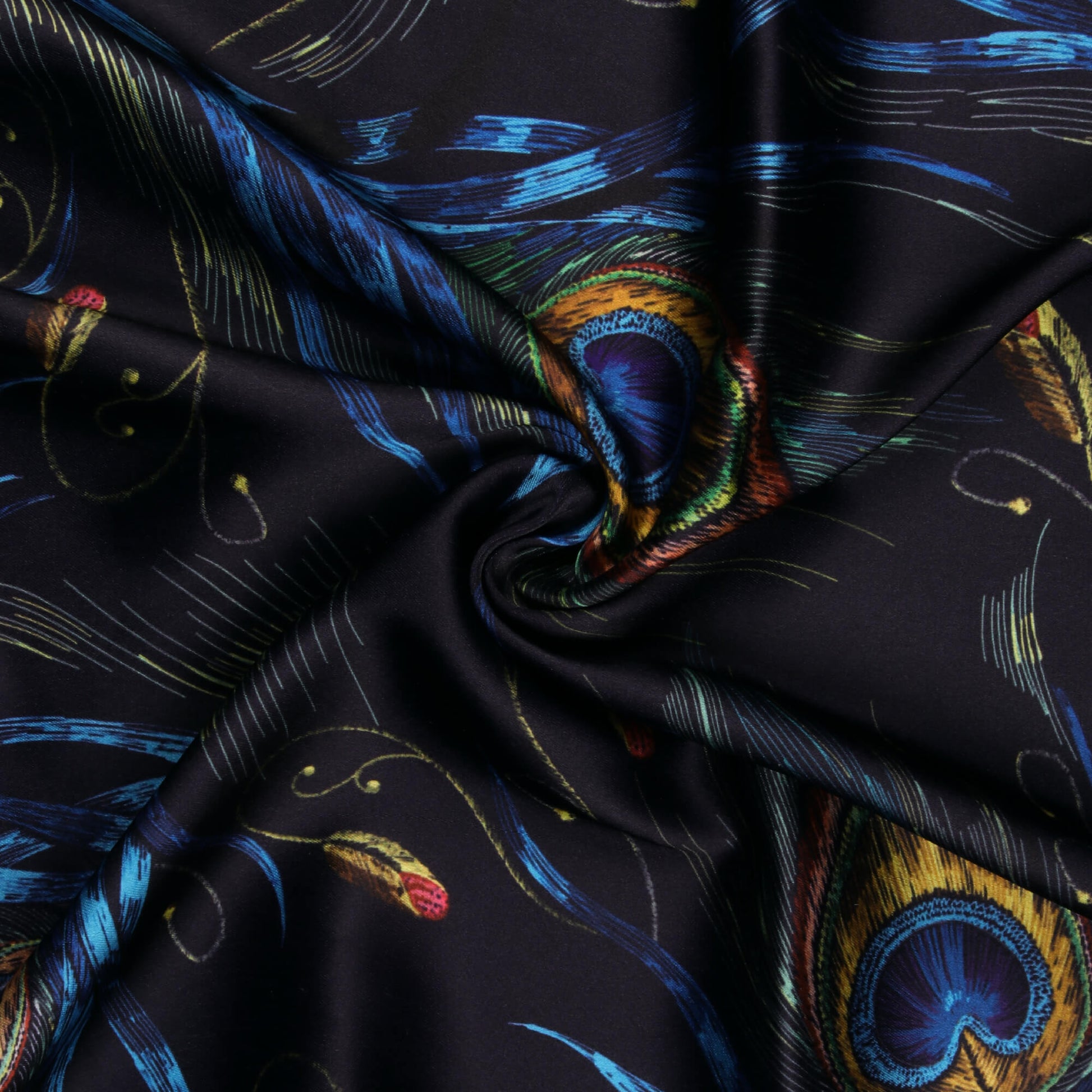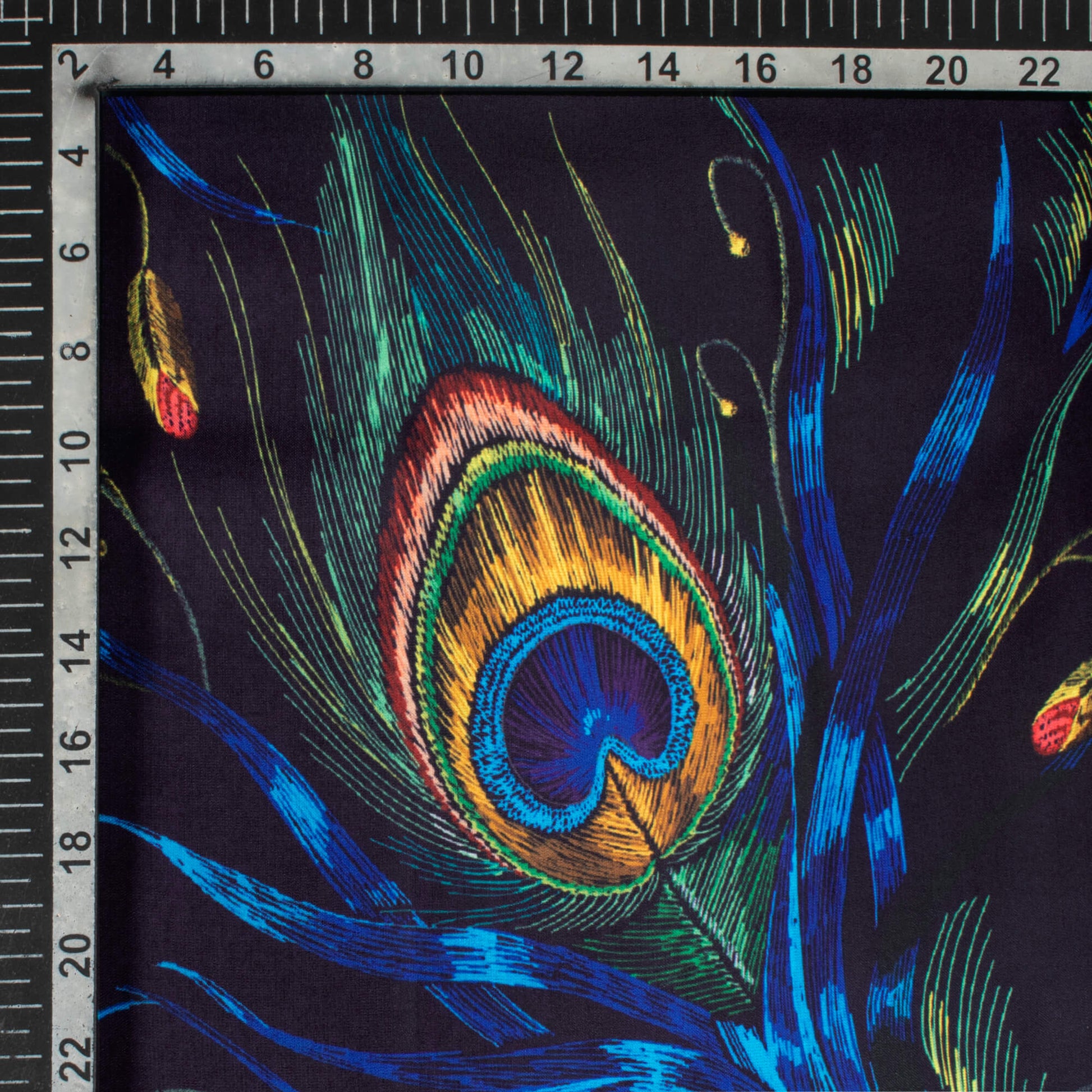 Navy Blue And Mustard Yellow Peacock Feather Digital Print Modal Satin Fabric