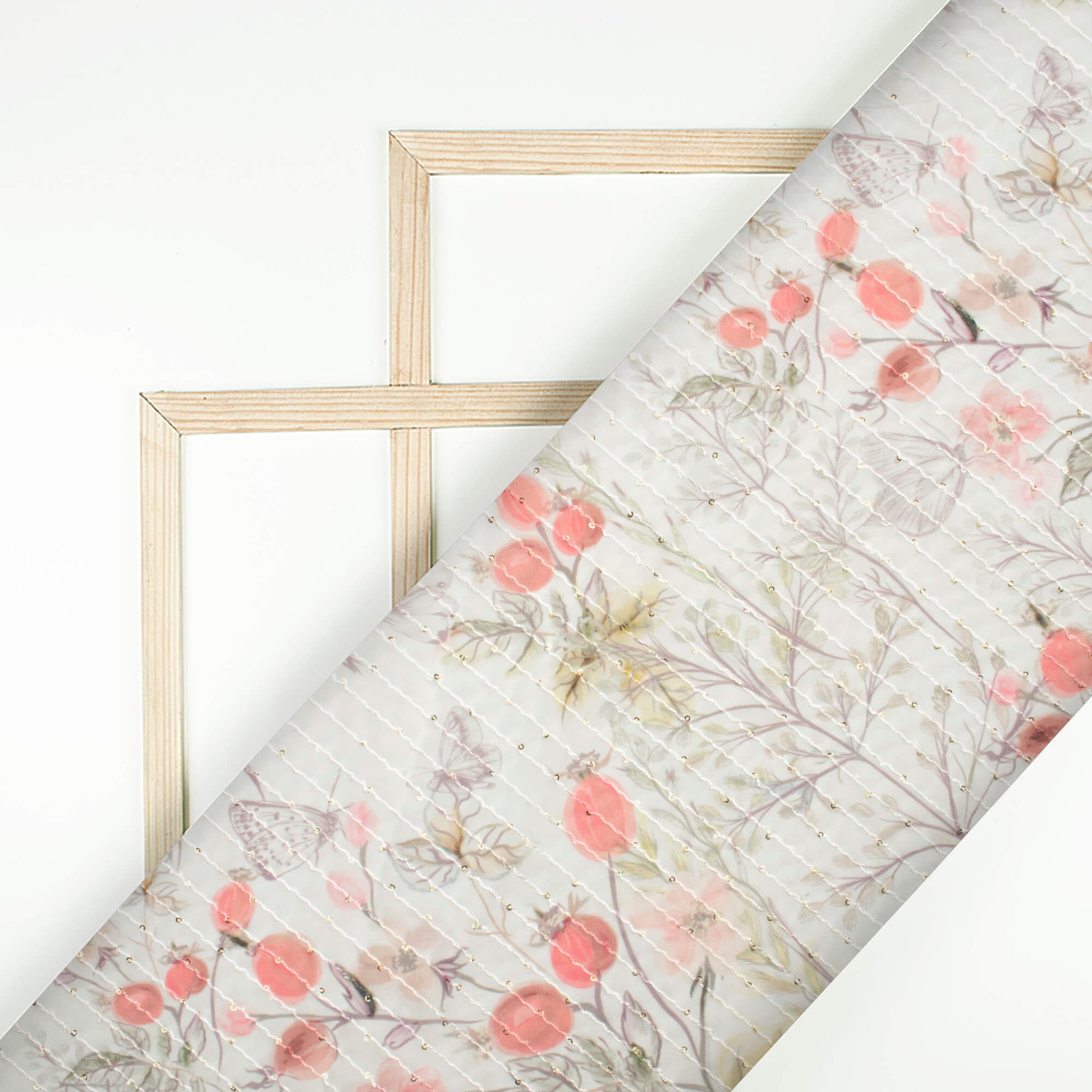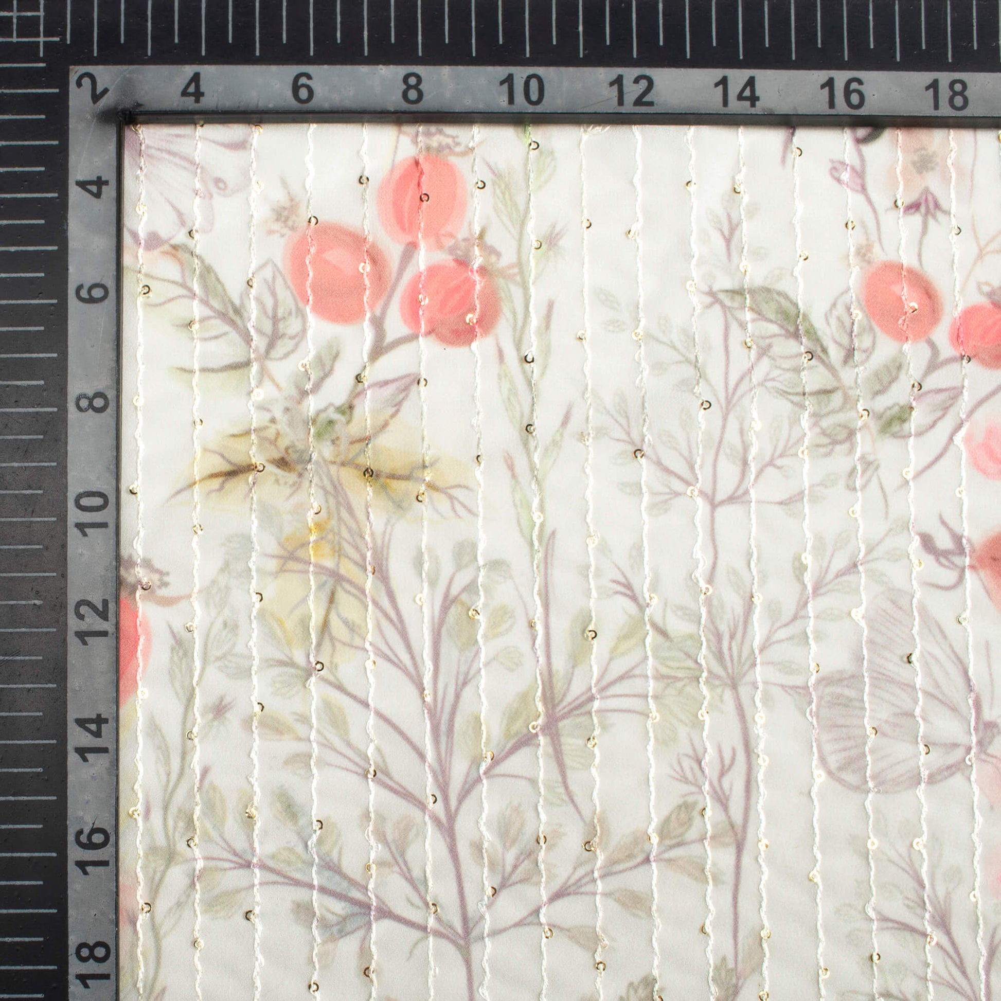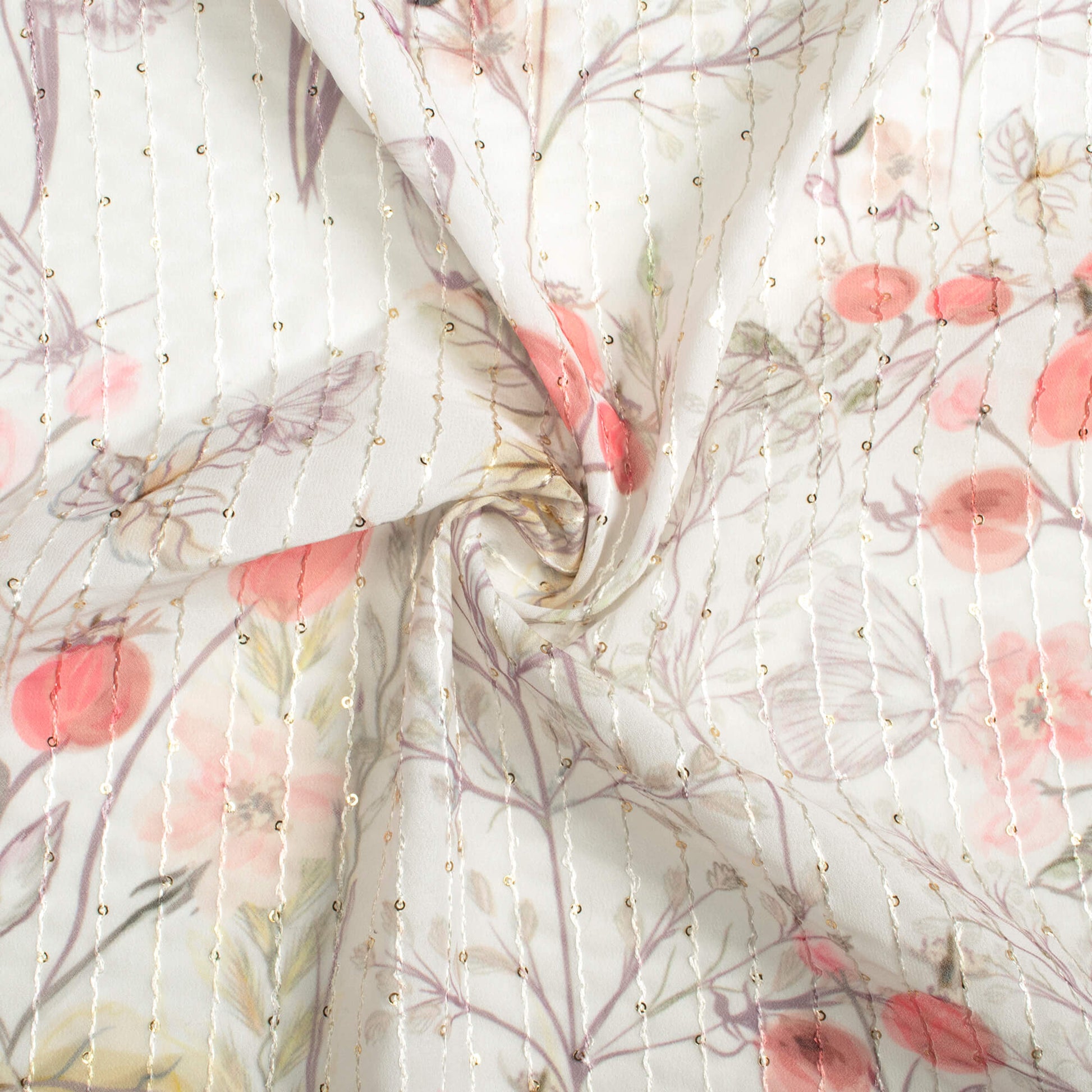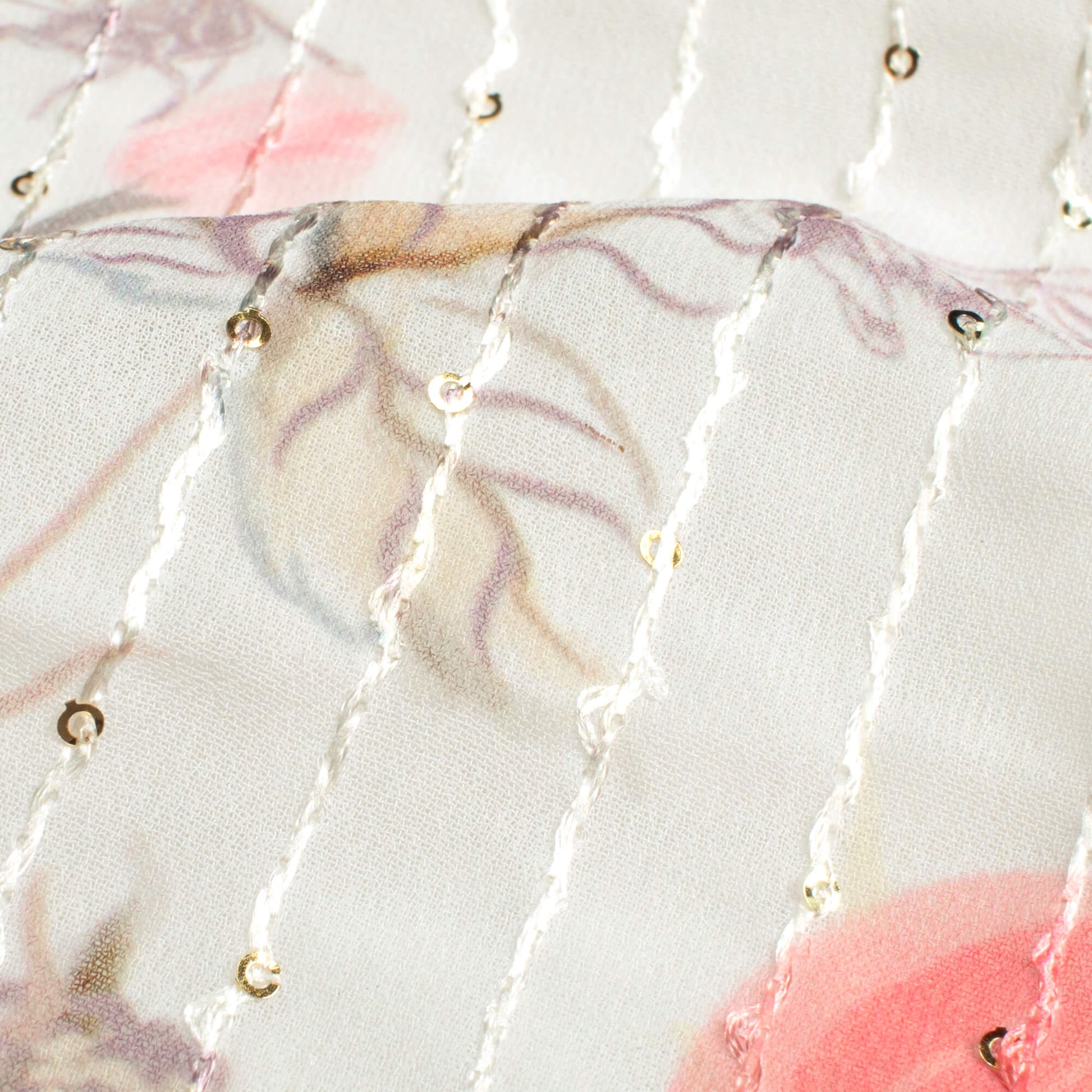 Off White And Pink Floral Pattern Digital Print Premium Sequins Georgette Fabric
