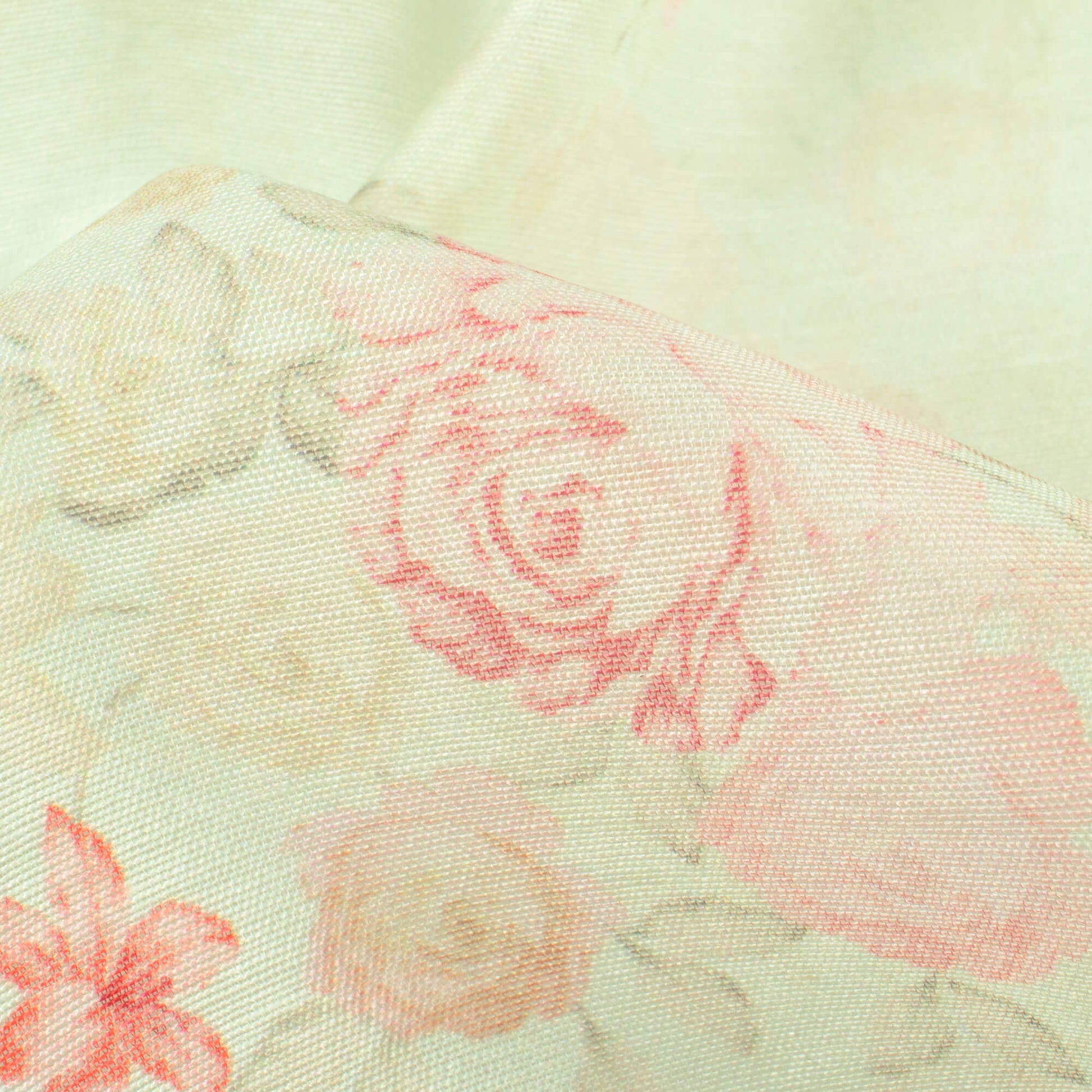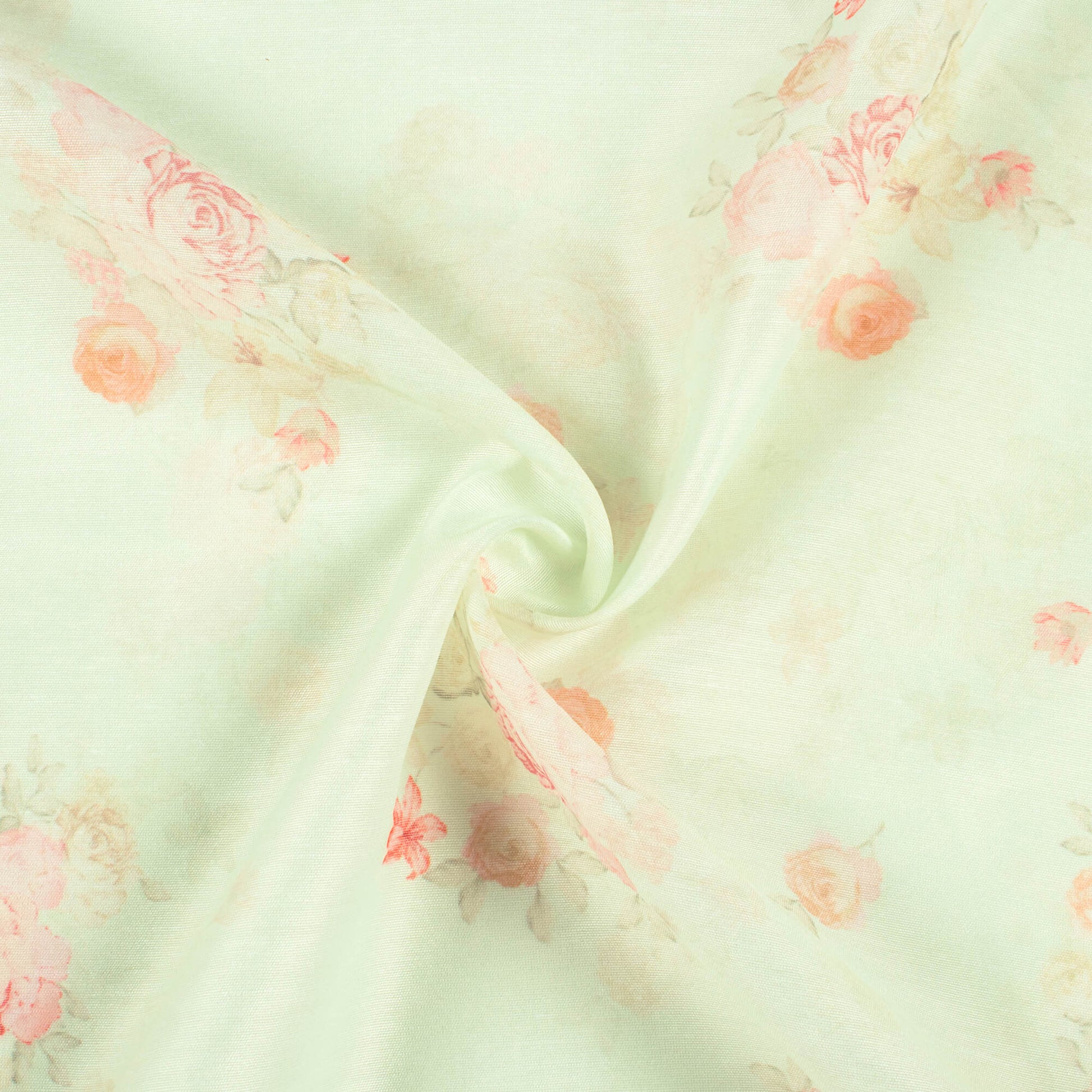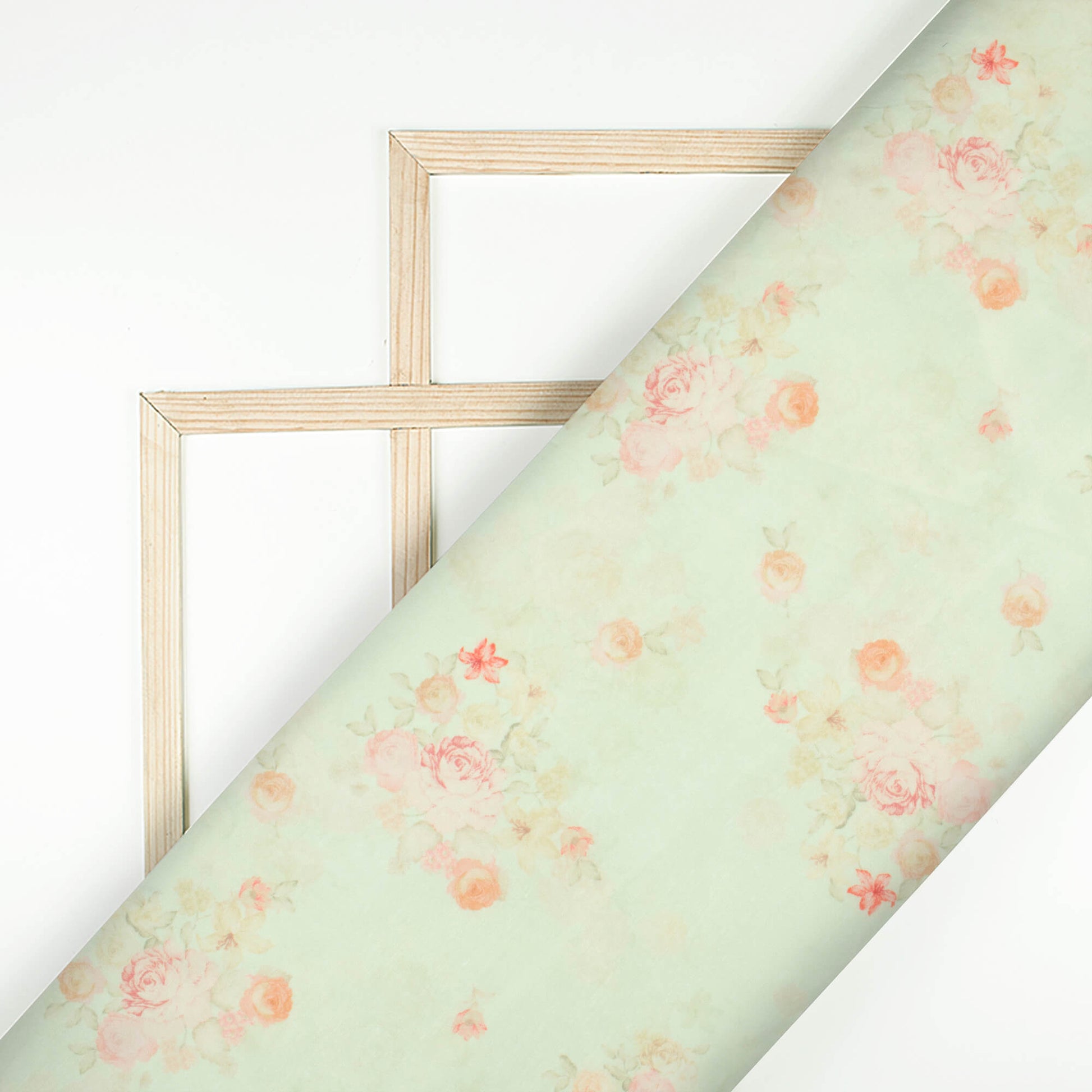 Pistachio Green And Pale Pink Floral Pattern Digital Print Chanderi Fabric