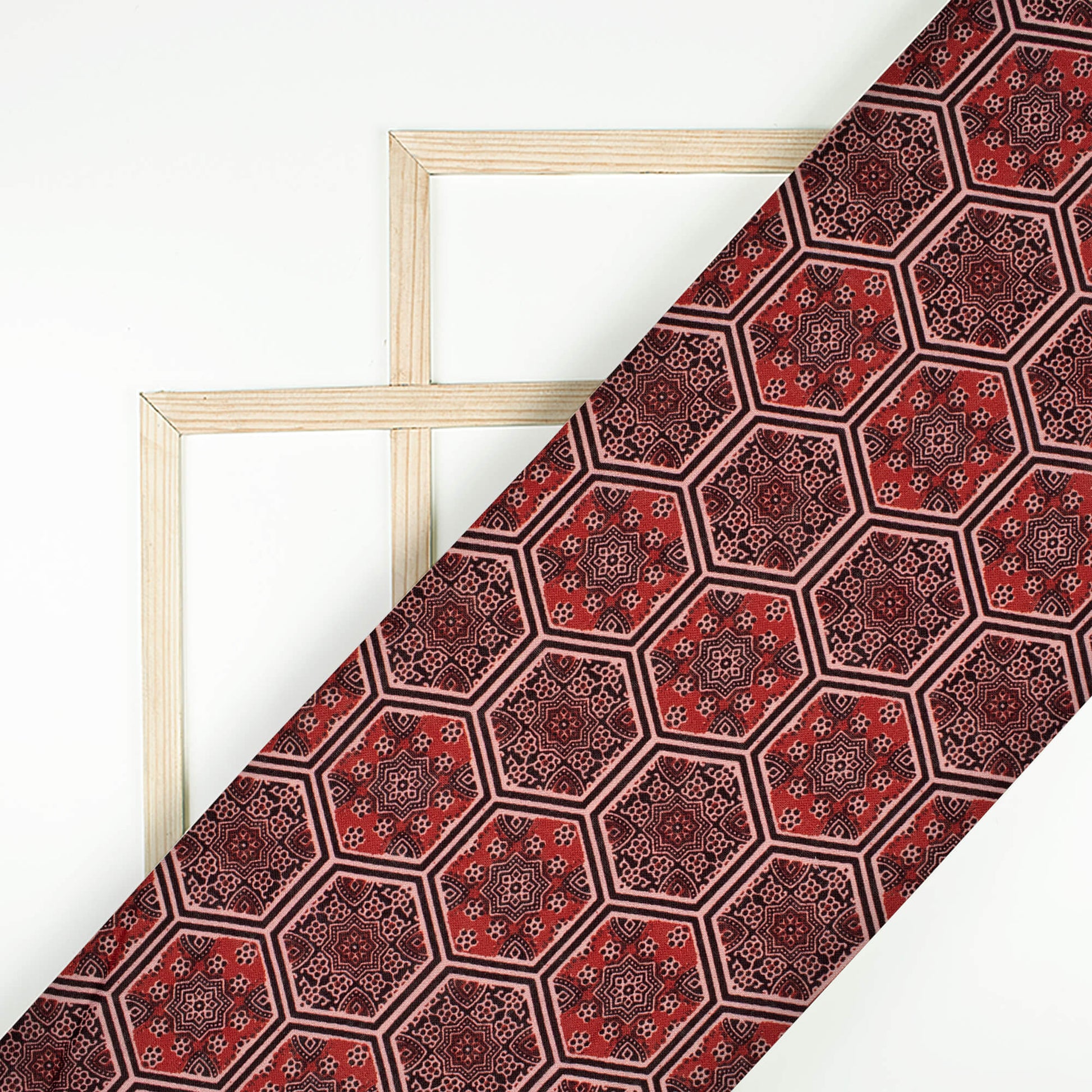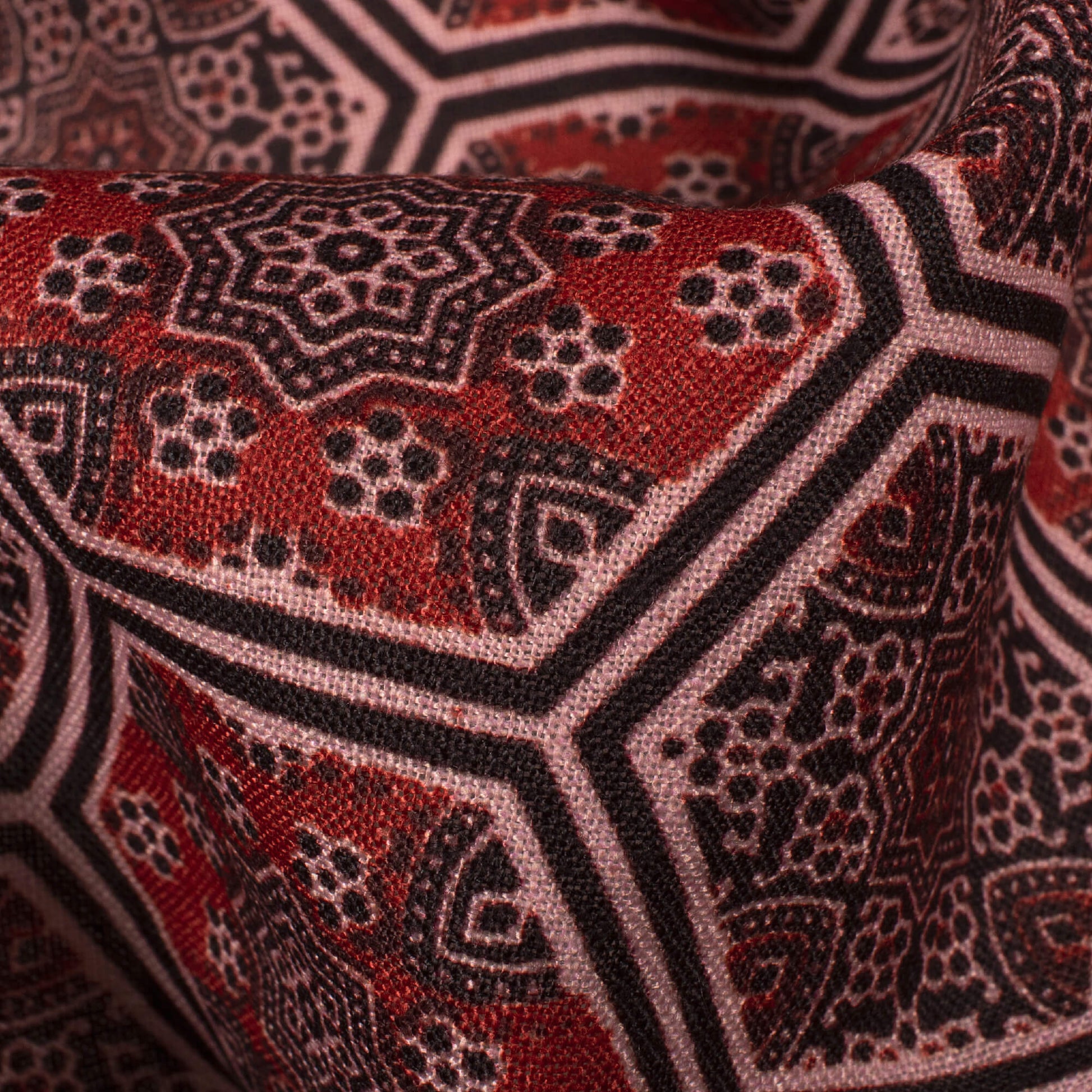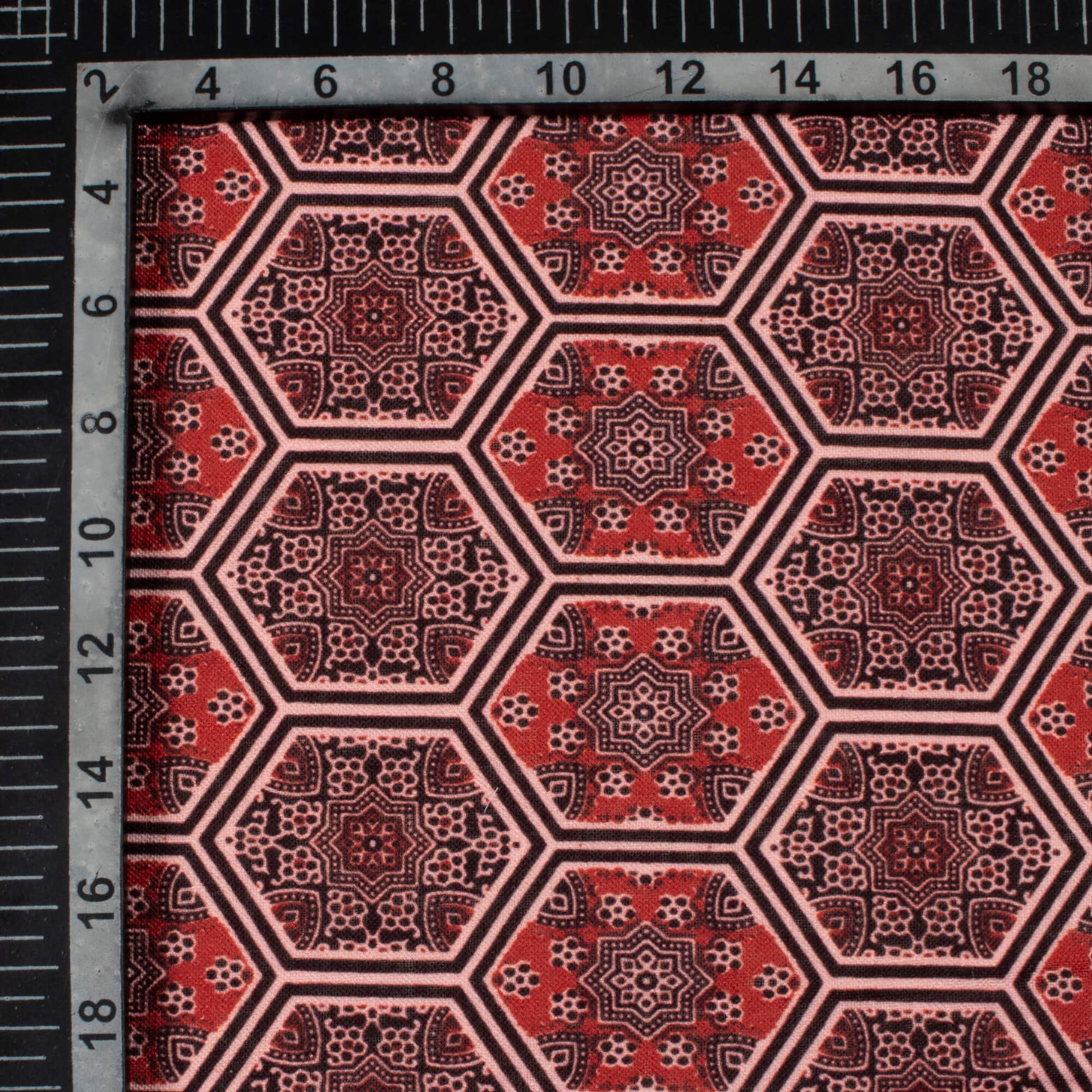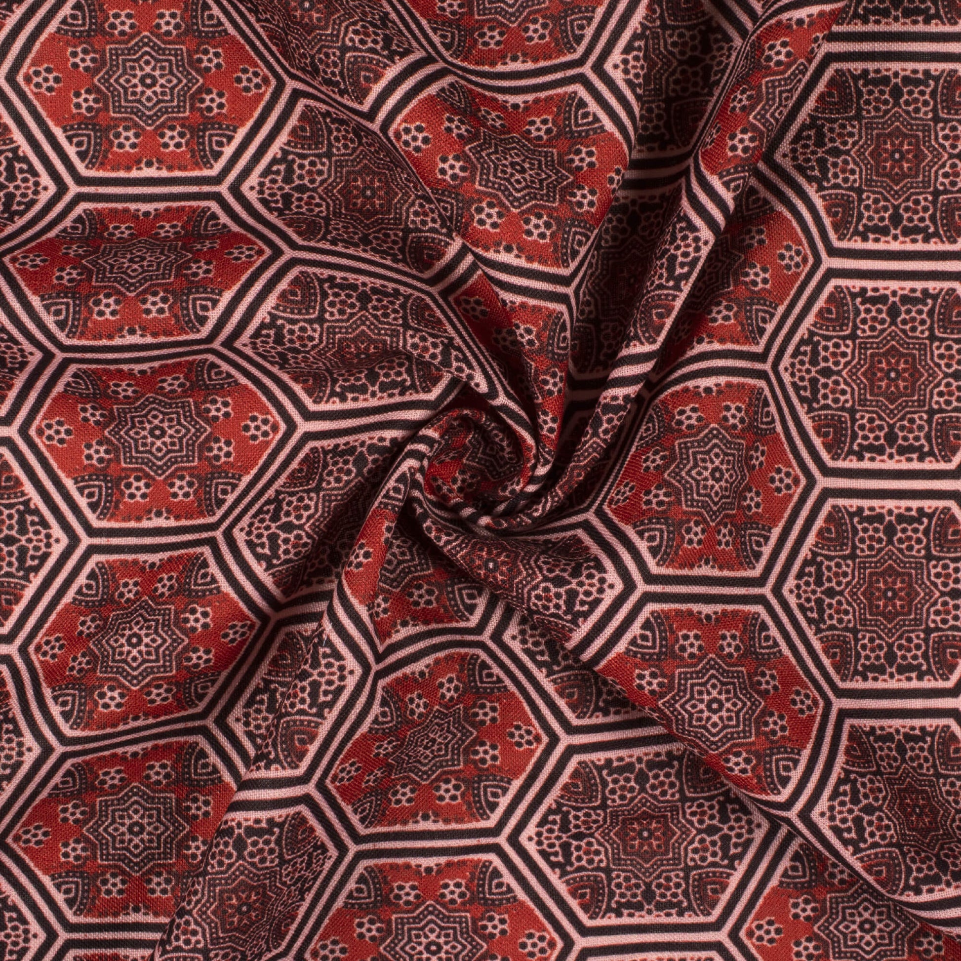Sangria Red And Black Ajrakh Pattern Digital Print Linen Textured Fabric (Width 56 Inches)