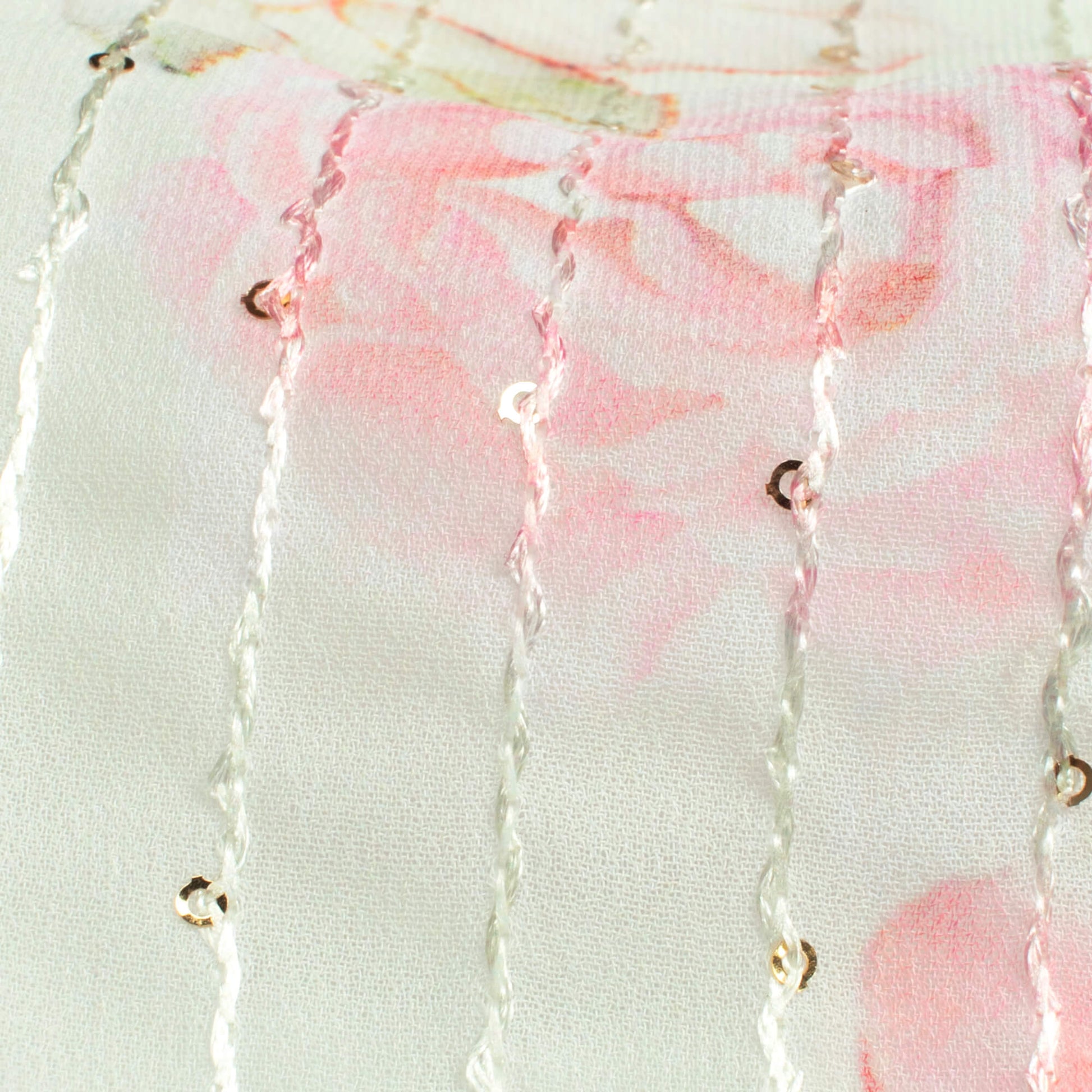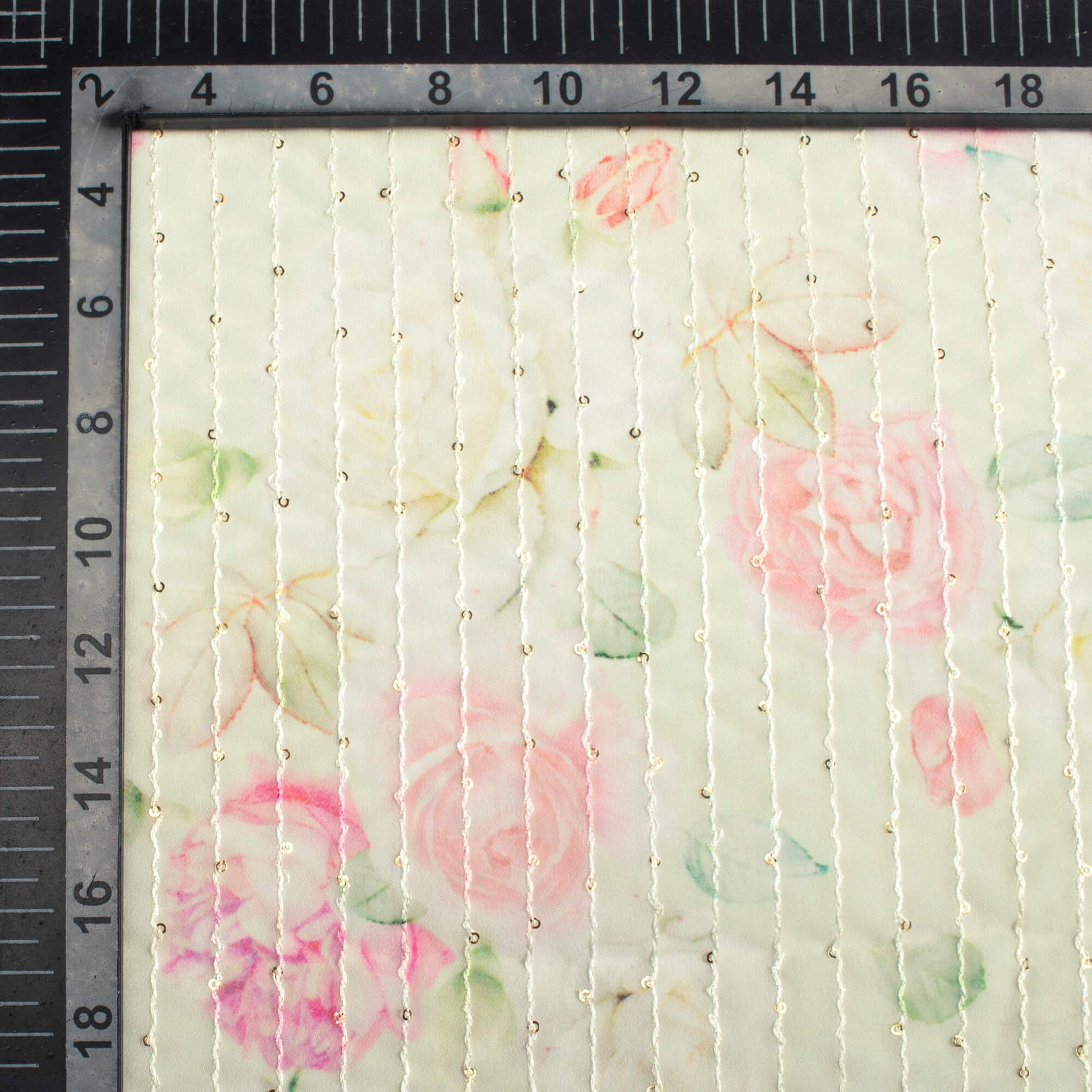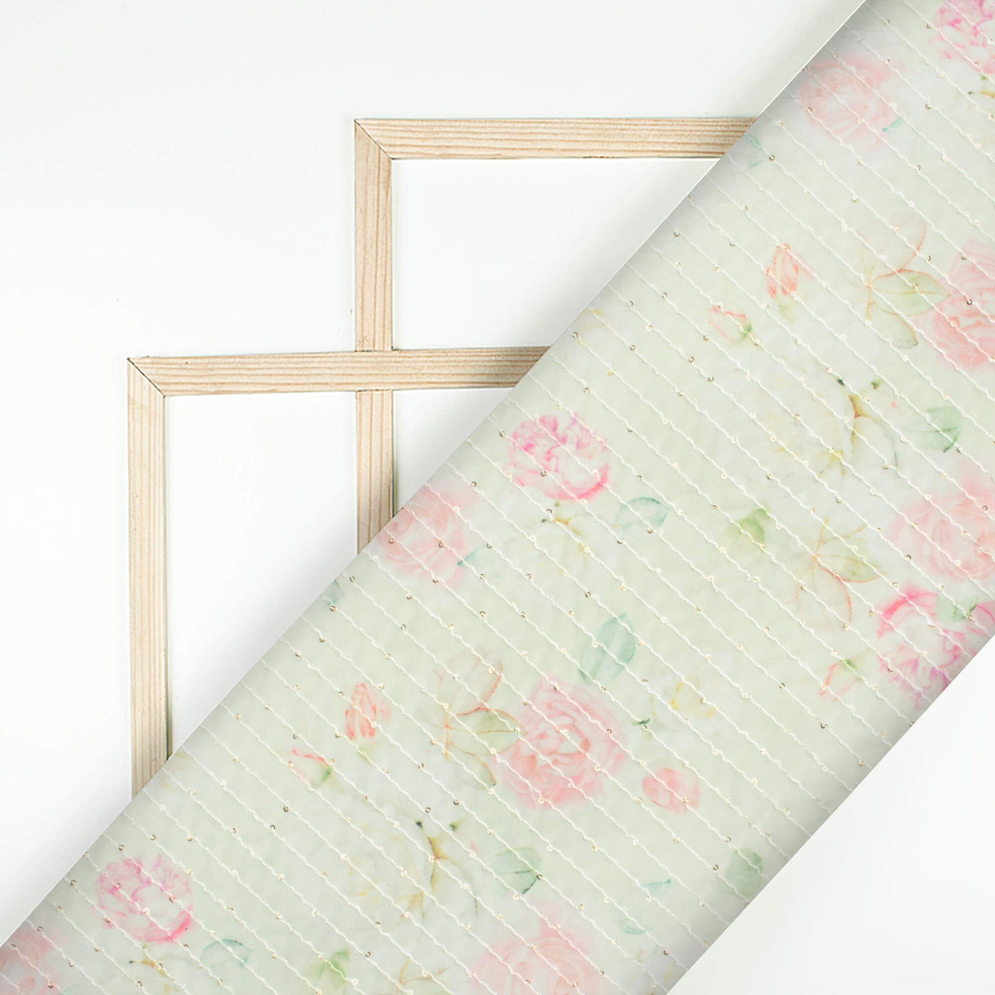 Tea Green And Carnation Pink Floral Pattern Digital Print Premium Sequins Georgette Fabric