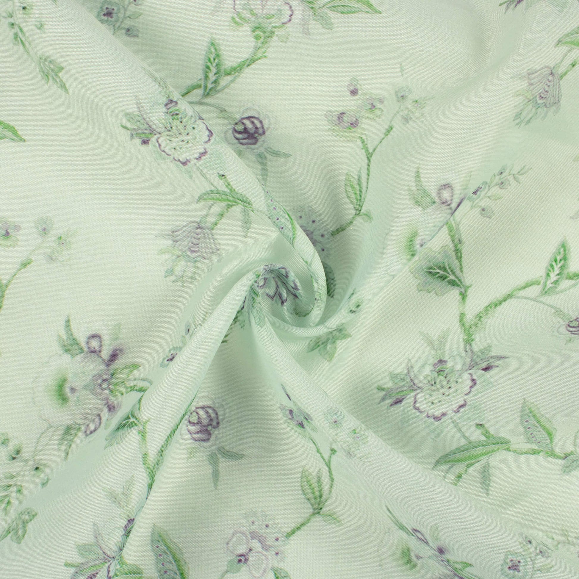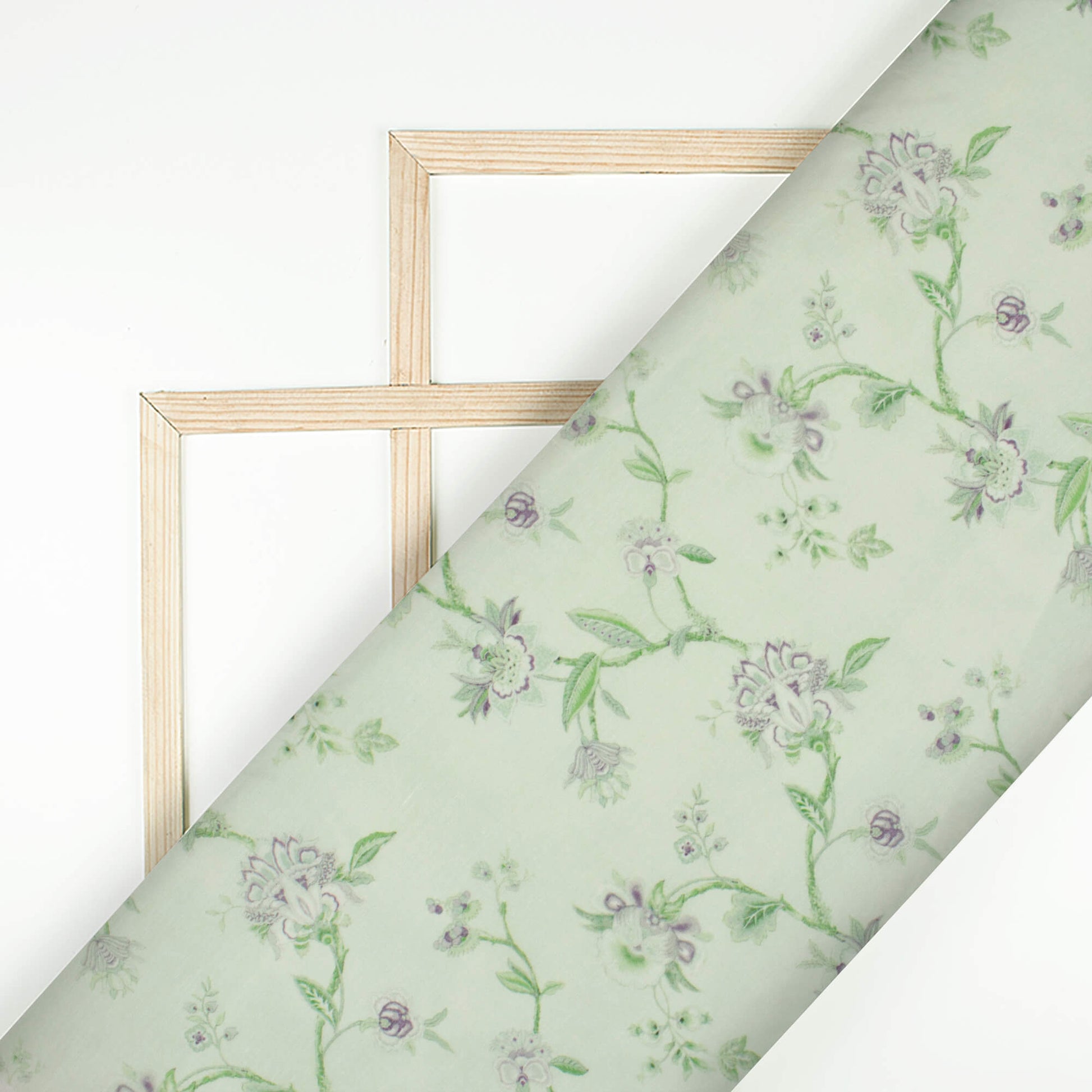 Tea Green And Eggplant Purple Floral Pattern Digital Print Chanderi Fabric