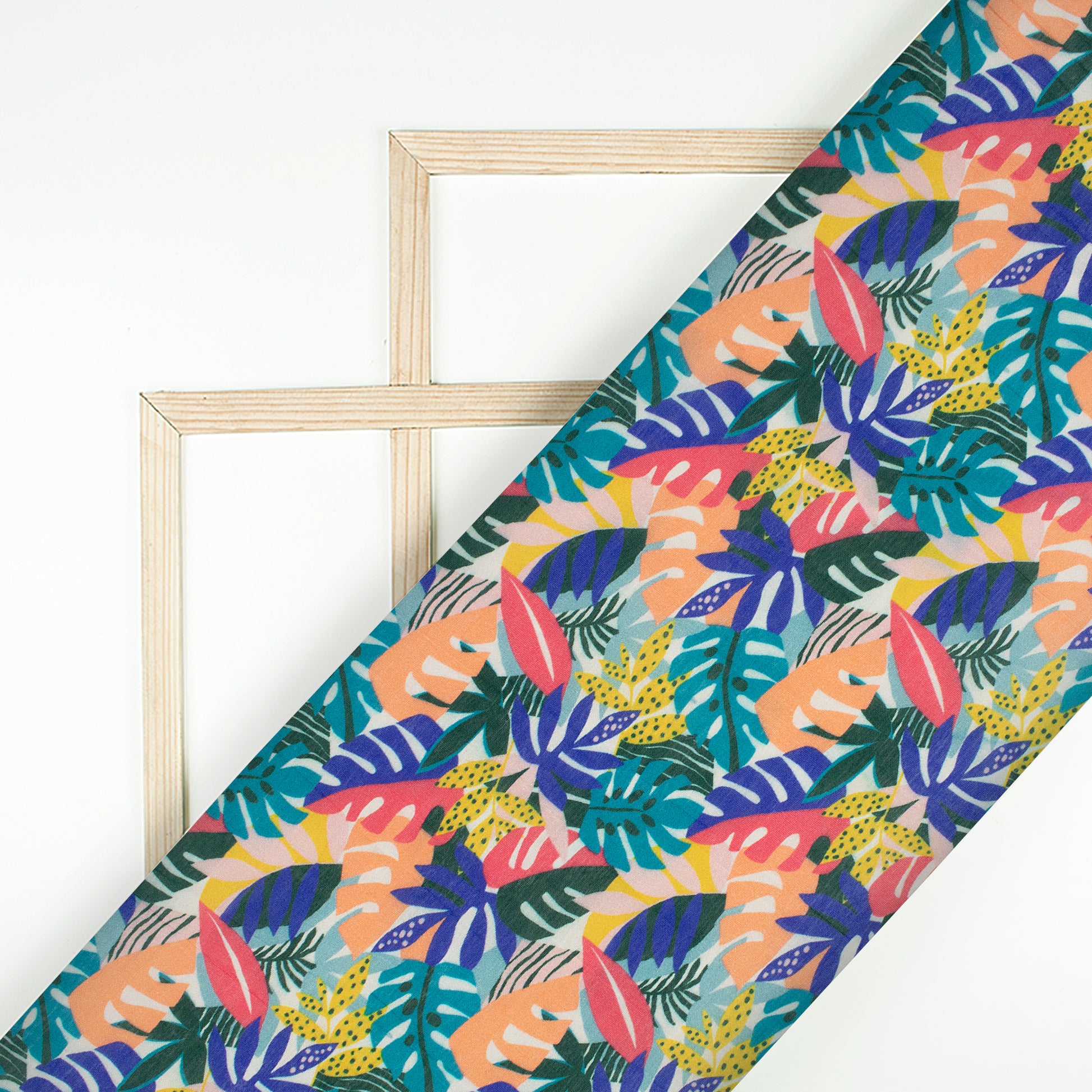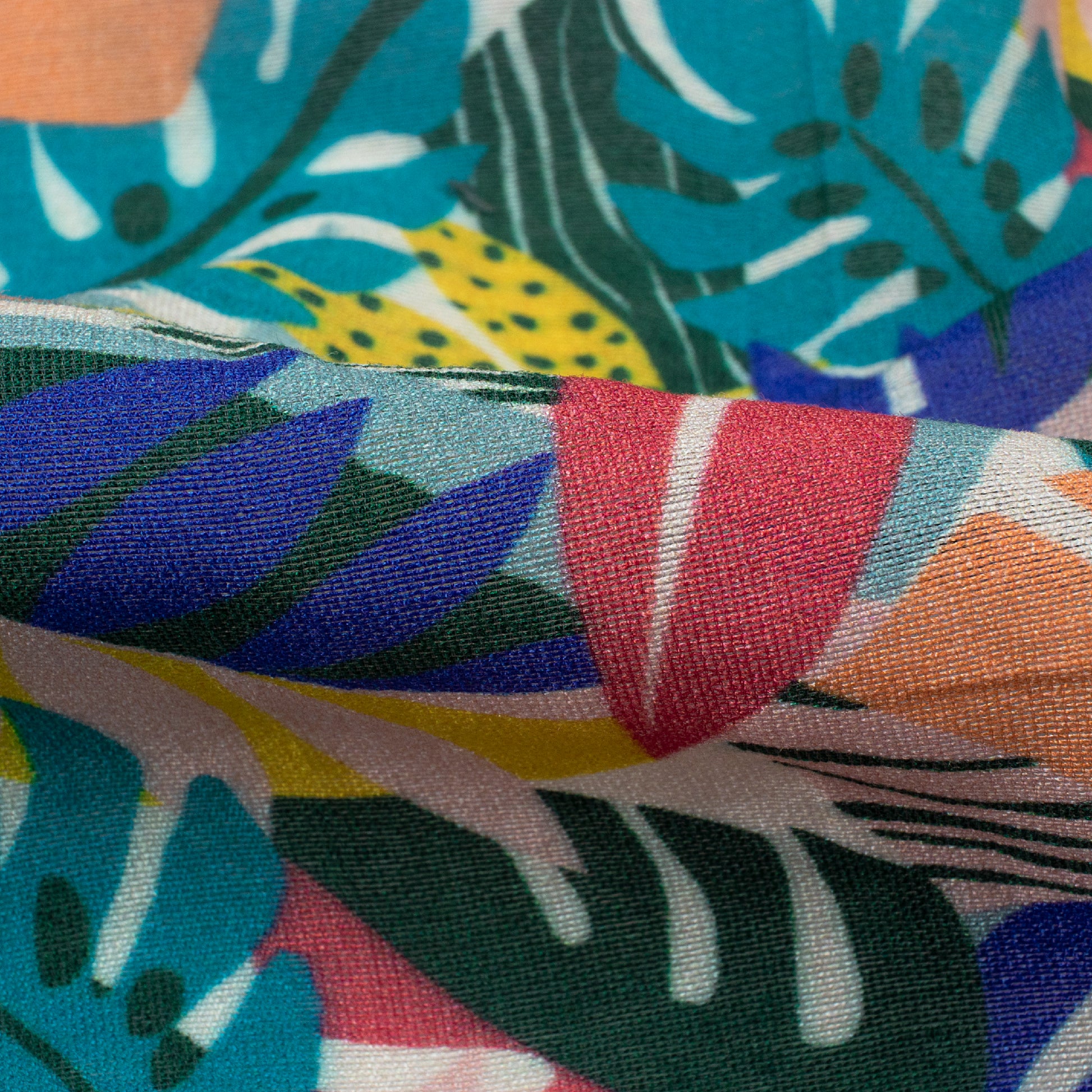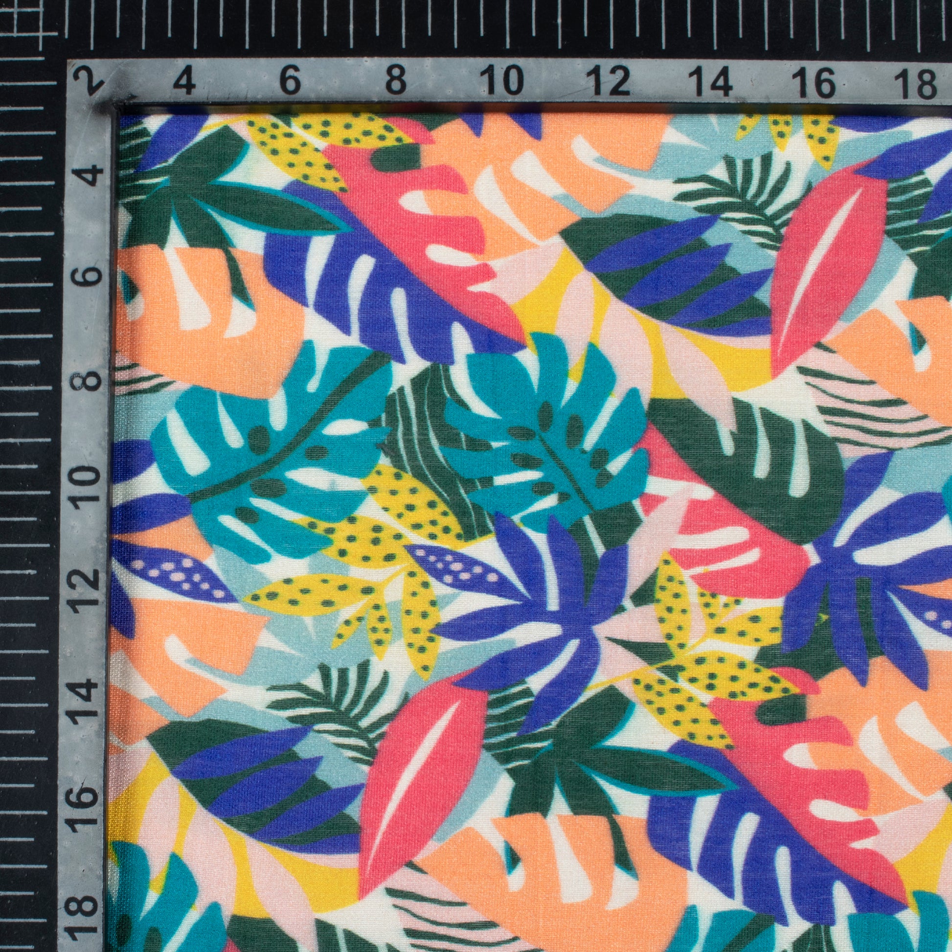 Teal Green And Peach Leaf Pattern Digital Print Viscose Chanderi Fabric