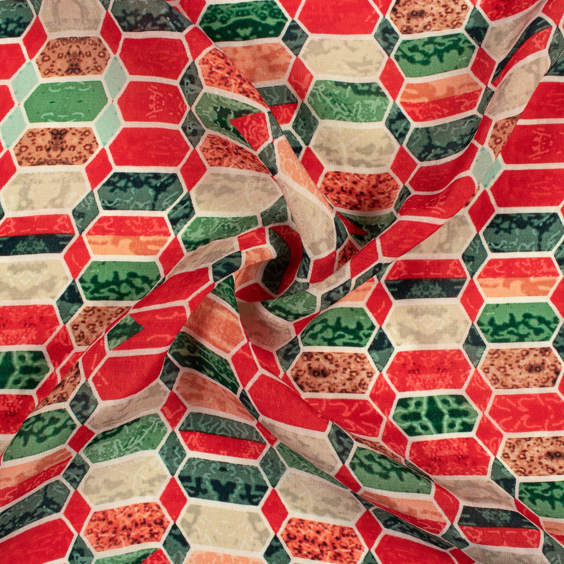 Vermilion Red And Sacramento Green Geometric Pattern Digital Print Viscose Natural Crepe Fabric
