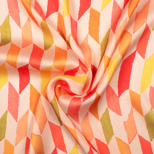 Oyster Beige And Red Geometric Pattern Digital Print Chiffon Satin Fabric Oyster Beige And Red Geometric Pattern Digital Print Chiffon Satin Fabric
