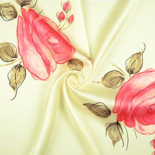 Pale Yellow And Punch Pink Floral Pattern Hand Paint Effect Digital Print Chiffon Satin Fabric Pale Yellow And Punch Pink Floral Pattern Hand Paint Effect Digital Print Chiffon Satin Fabric