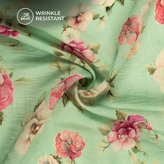 Mint Green And Pink Floral Digital Print Viscose Chanderi Fabric Mint Green And Pink Floral Digital Print Viscose Chanderi Fabric