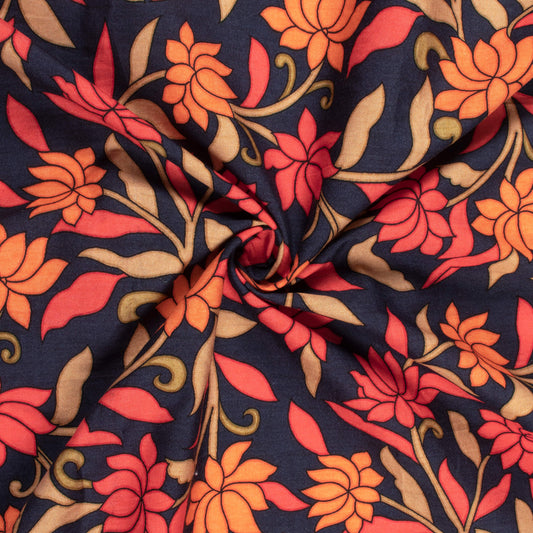 Oxford Blue And Peach Floral Digital Print Poplin Fabric (Width 58 Inches) Oxford Blue And Peach Floral Digital Print Poplin Fabric (Width 58 Inches)