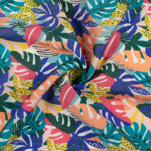 Teal Green And Peach Leaf Pattern Digital Print Viscose Chanderi Fabric Teal Green And Peach Leaf Pattern Digital Print Viscose Chanderi Fabric