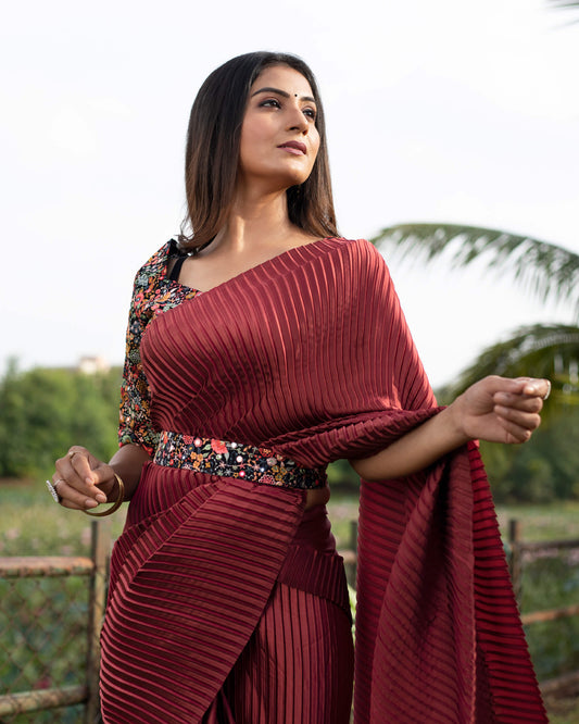 Maroon Plain Half Pleated Japan Satin Saree