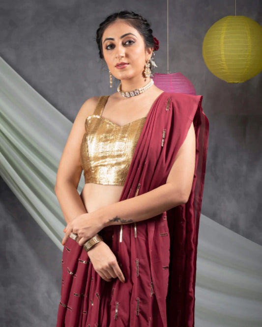 Mehogany Red Golden Zari Gotta Patti Work Liquid Organza Saree With Tubular Beads Sequins Lace Border. Mehogany Red Golden Zari Gotta Patti Work Liquid Organza Saree With Tubular Beads Sequins Lace Border.