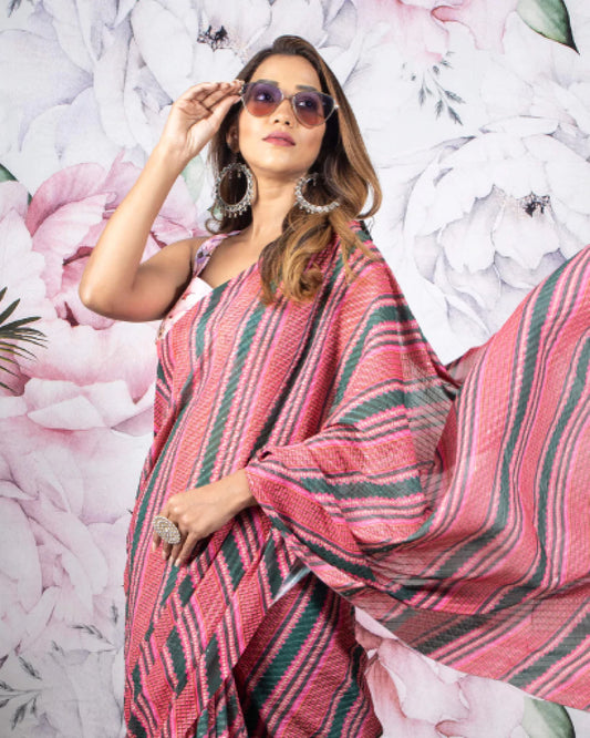 Hot Pink And White Stripes Pattern Digital Print Georgette Saree With Zari Sequins Lace Border Hot Pink And White Stripes Pattern Digital Print Georgette Saree With Zari Sequins Lace Border