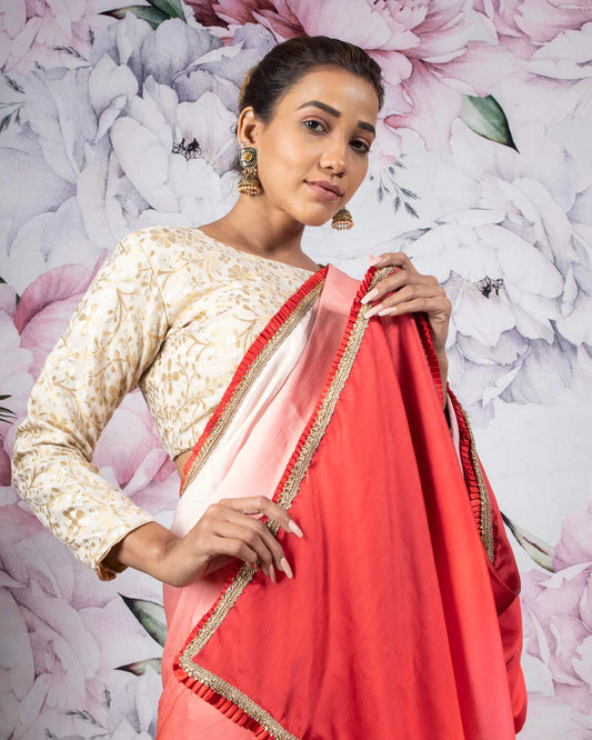 Red And Pink Ombre Pattern Digital Print Chiffon Satin Saree With Stone Work Lace Border Red And Pink Ombre Pattern Digital Print Chiffon Satin Saree With Stone Work Lace Border