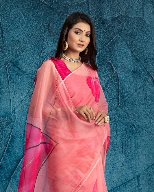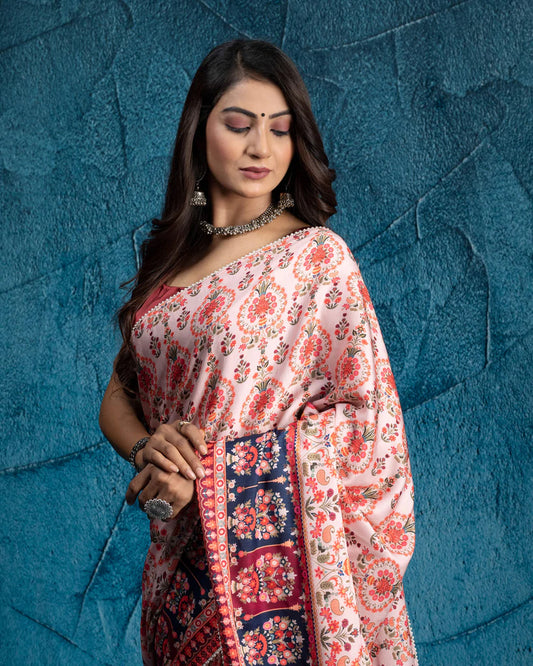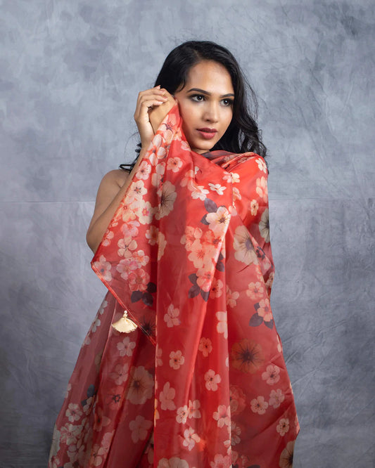 Red And Salmon Peach Floral Pattern Digital Print Muslin Saree With Pearl Work Lace Border Red And Salmon Peach Floral Pattern Digital Print Muslin Saree With Pearl Work Lace Border