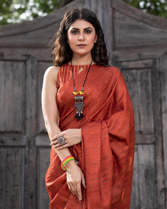 Brick Red And Umber Brown Ombre Pattern Digital Print Art Tusser Silk Saree With Tassels Brick Red And Umber Brown Ombre Pattern Digital Print Art Tusser Silk Saree With Tassels