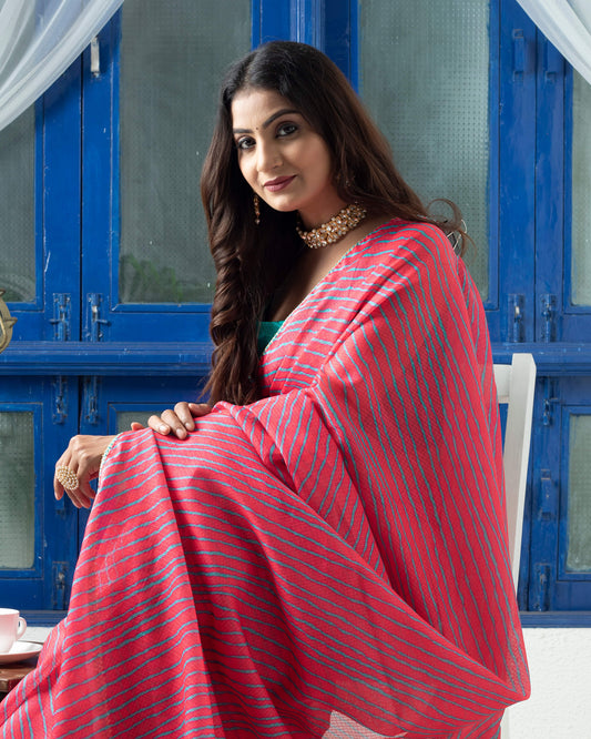 Deep Pink And Turquoise Leheriya Pattern Digital Print Kota Doria Saree With Zari Lace Border Deep Pink And Turquoise Leheriya Pattern Digital Print Kota Doria Saree With Zari Lace Border