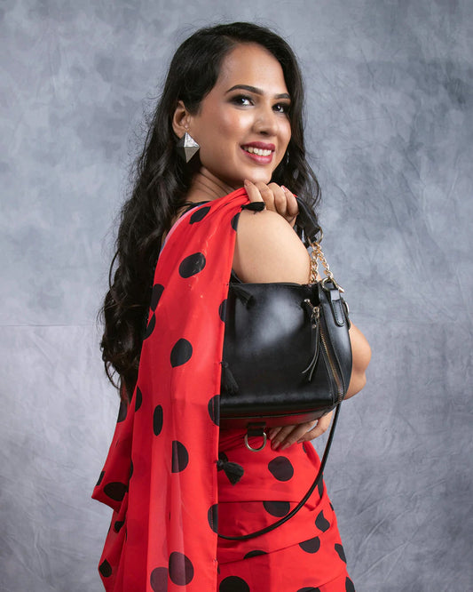 Red And Black Polka Dots Pattern Digital Print Georgette Saree With Tassels Red And Black Polka Dots Pattern Digital Print Georgette Saree With Tassels