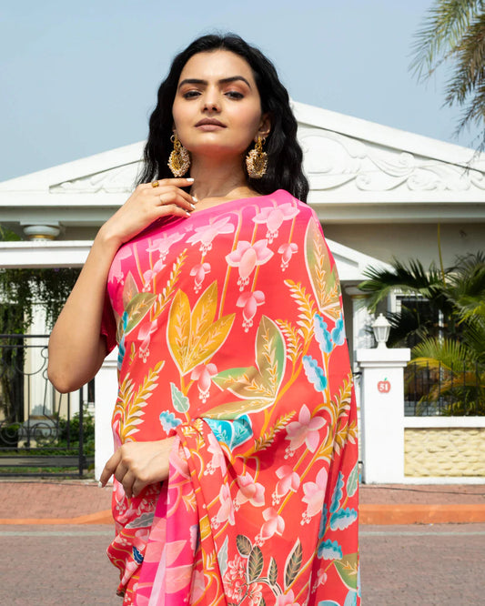 Coral Red And Olive Green Floral Pattern Digital Print Georgette Saree With Tassels Coral Red And Olive Green Floral Pattern Digital Print Georgette Saree With Tassels