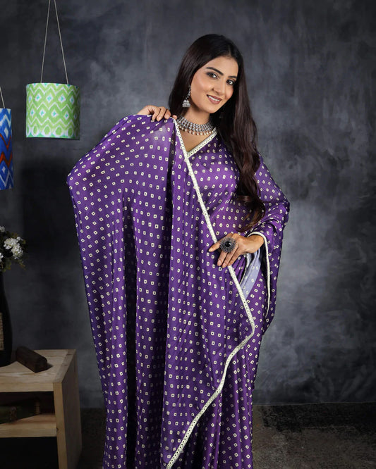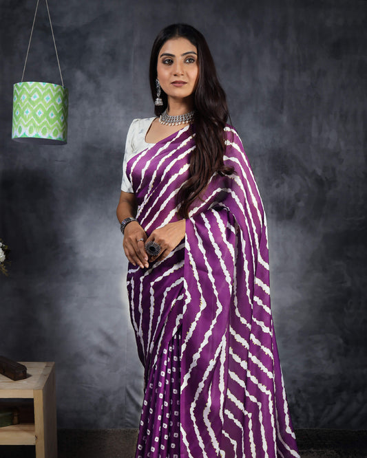 Grape Purple And White Bandhanii Pattern Digital Print Georgette Satin Saree With Foil Mirror Work Lace Border Grape Purple And White Bandhanii Pattern Digital Print Georgette Satin Saree With Foil Mirror Work Lace Border