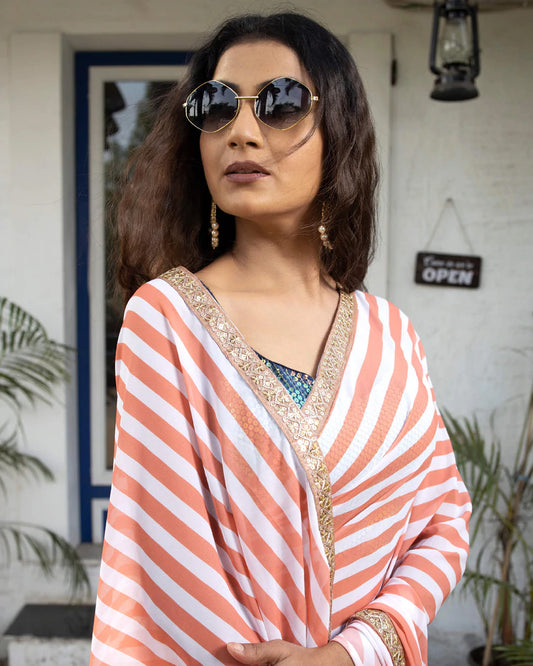 Peach And White Stripes Pattern Digital Print Georgette Saree With Zari Sequins Lace Border Peach And White Stripes Pattern Digital Print Georgette Saree With Zari Sequins Lace Border