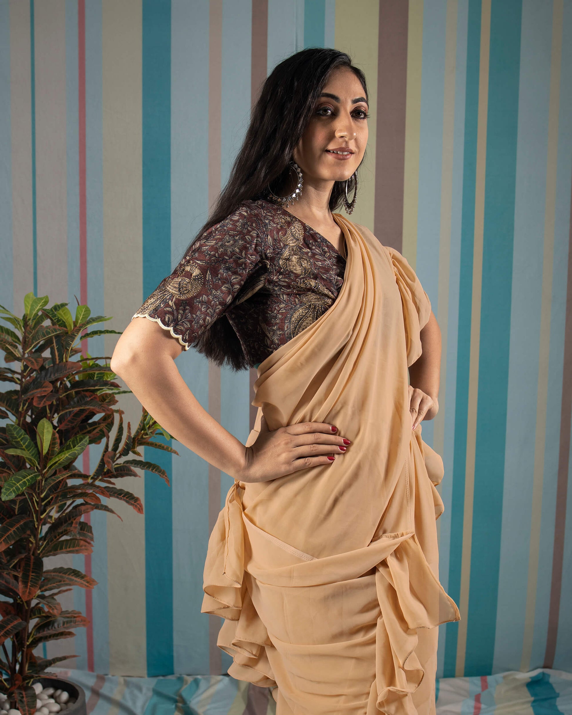 Beige Plain Georgette Ruffle Saree