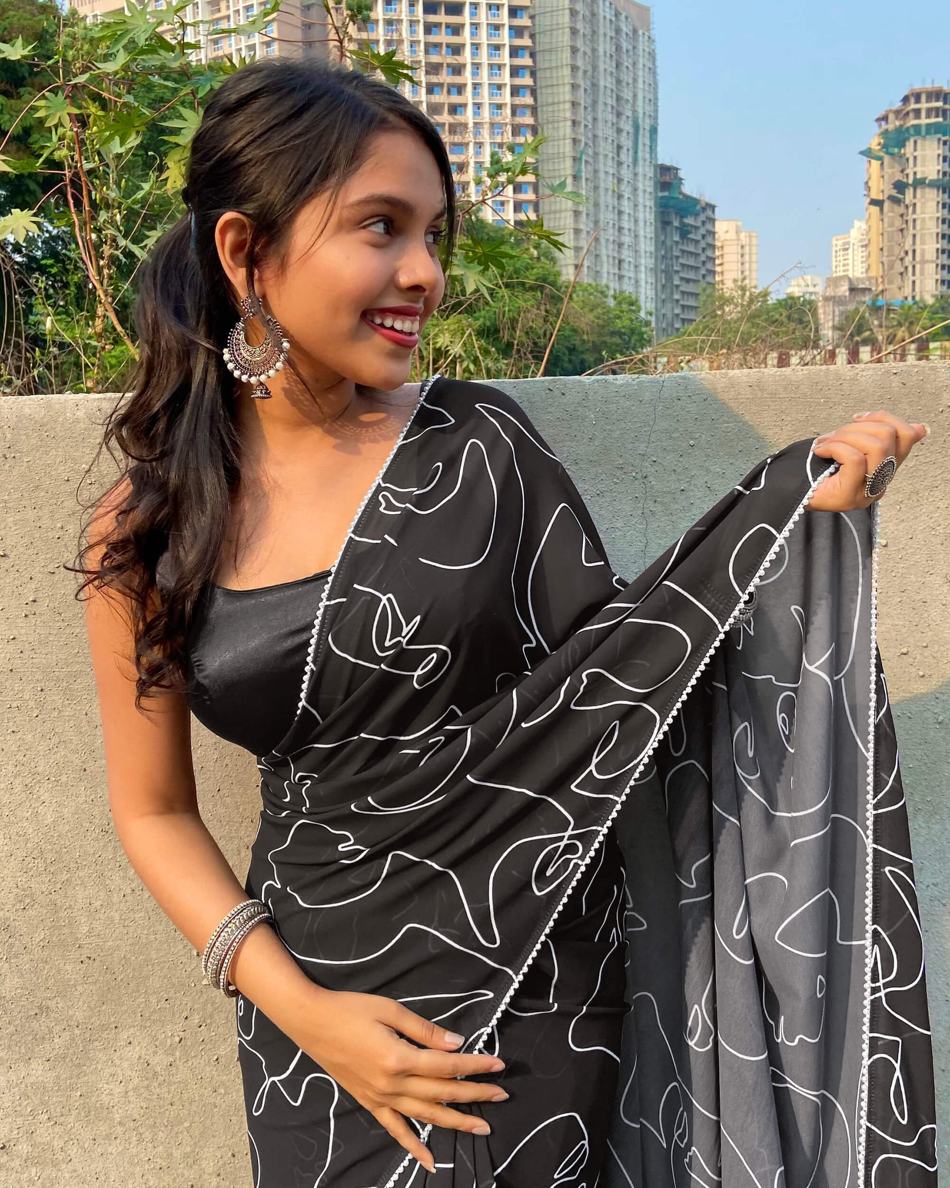 Black And White Abstract Pattern Digital Print Georgette Saree With Pearl Work Lace Border
