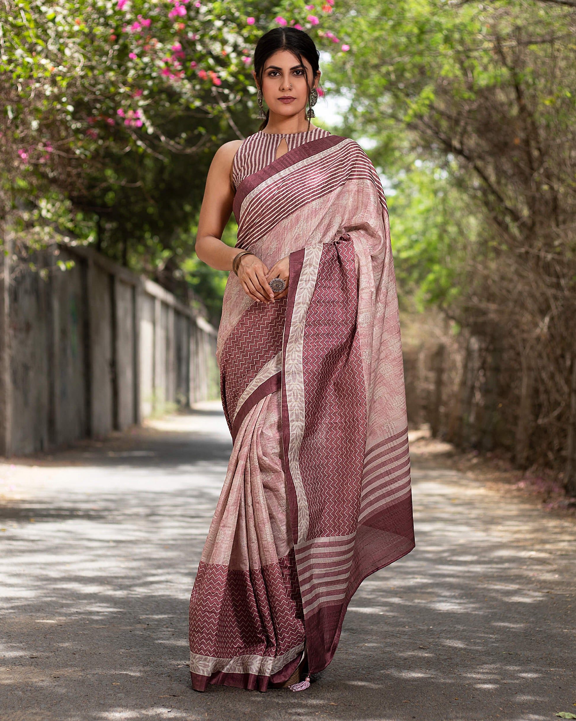 Cannon Pink And White Chevron Pattern Digital Print Art Tusser Silk Saree With Tassels