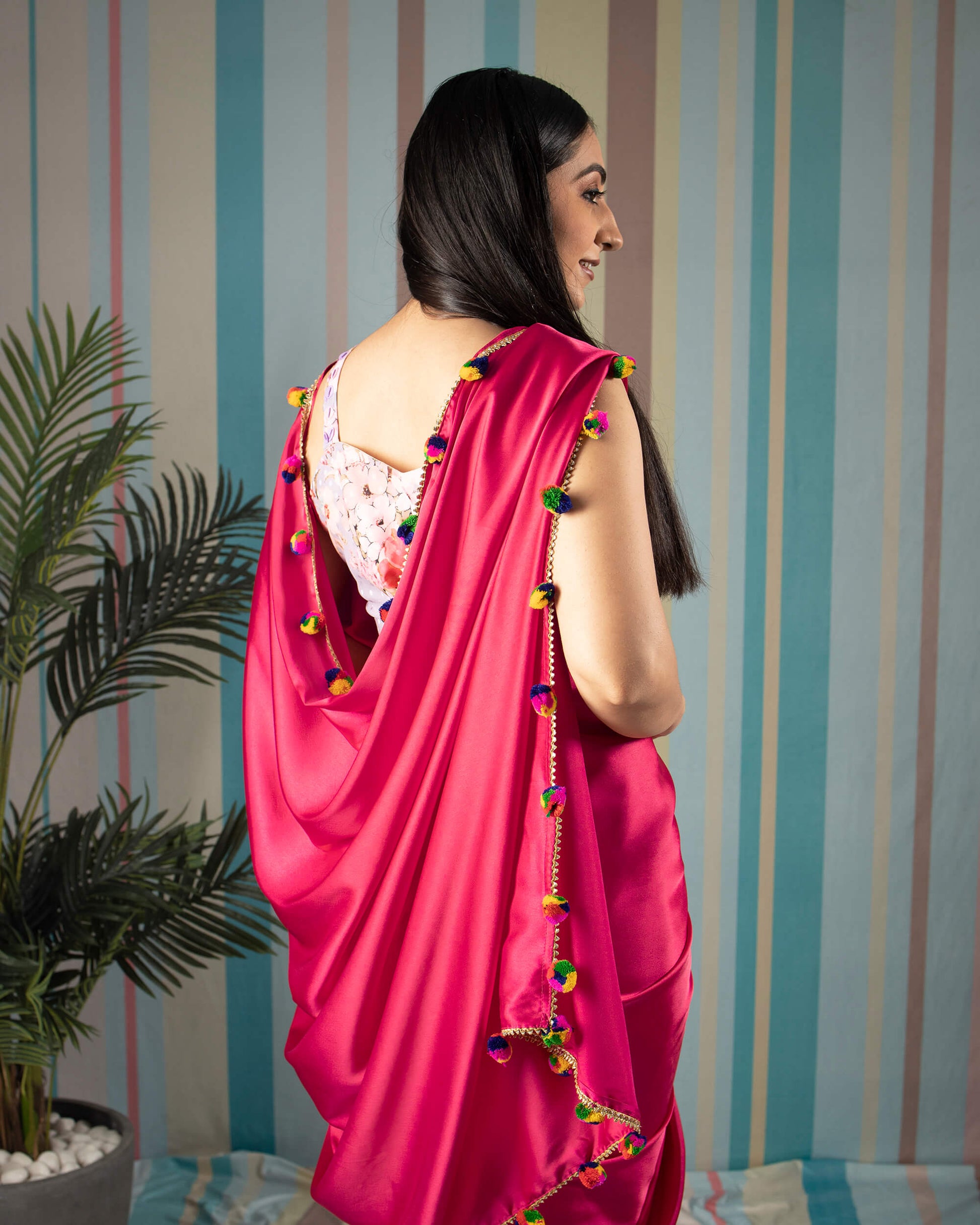 Cerise Pink Plain Japan Satin Saree With Pompom Lace Border