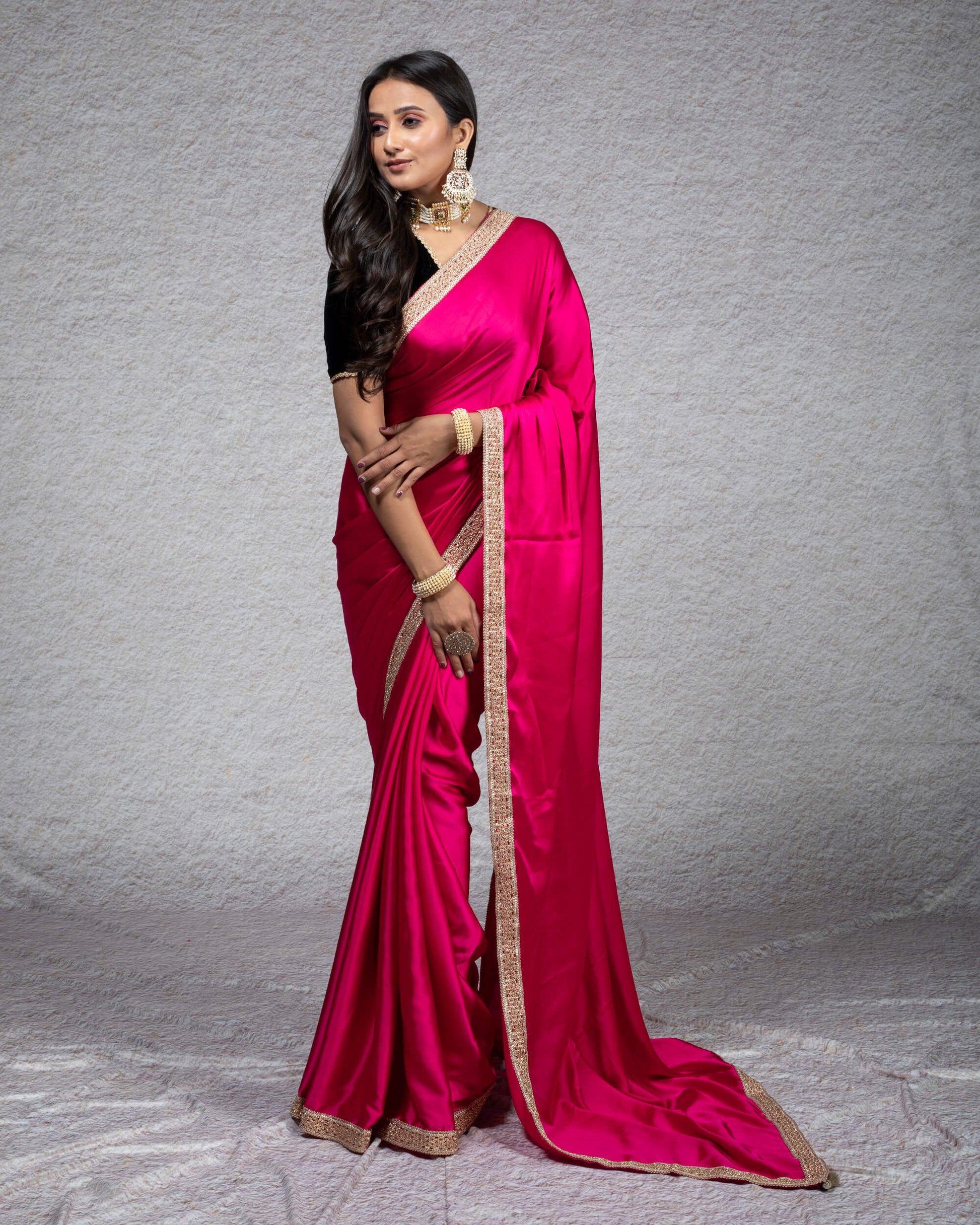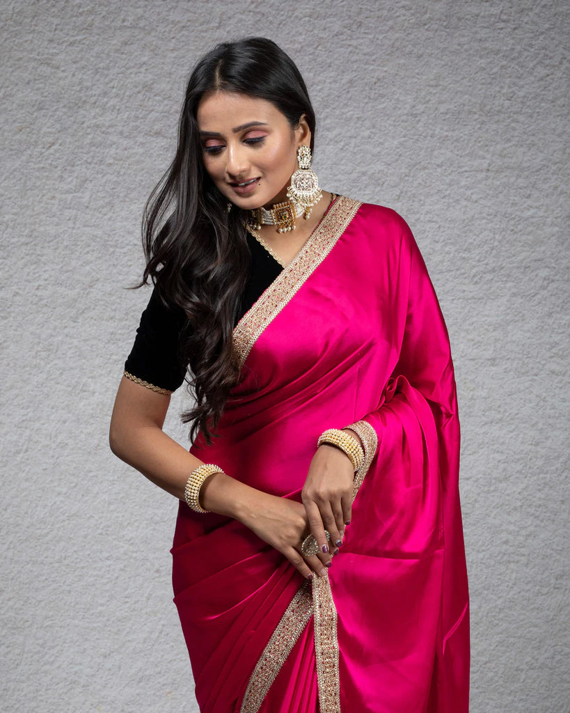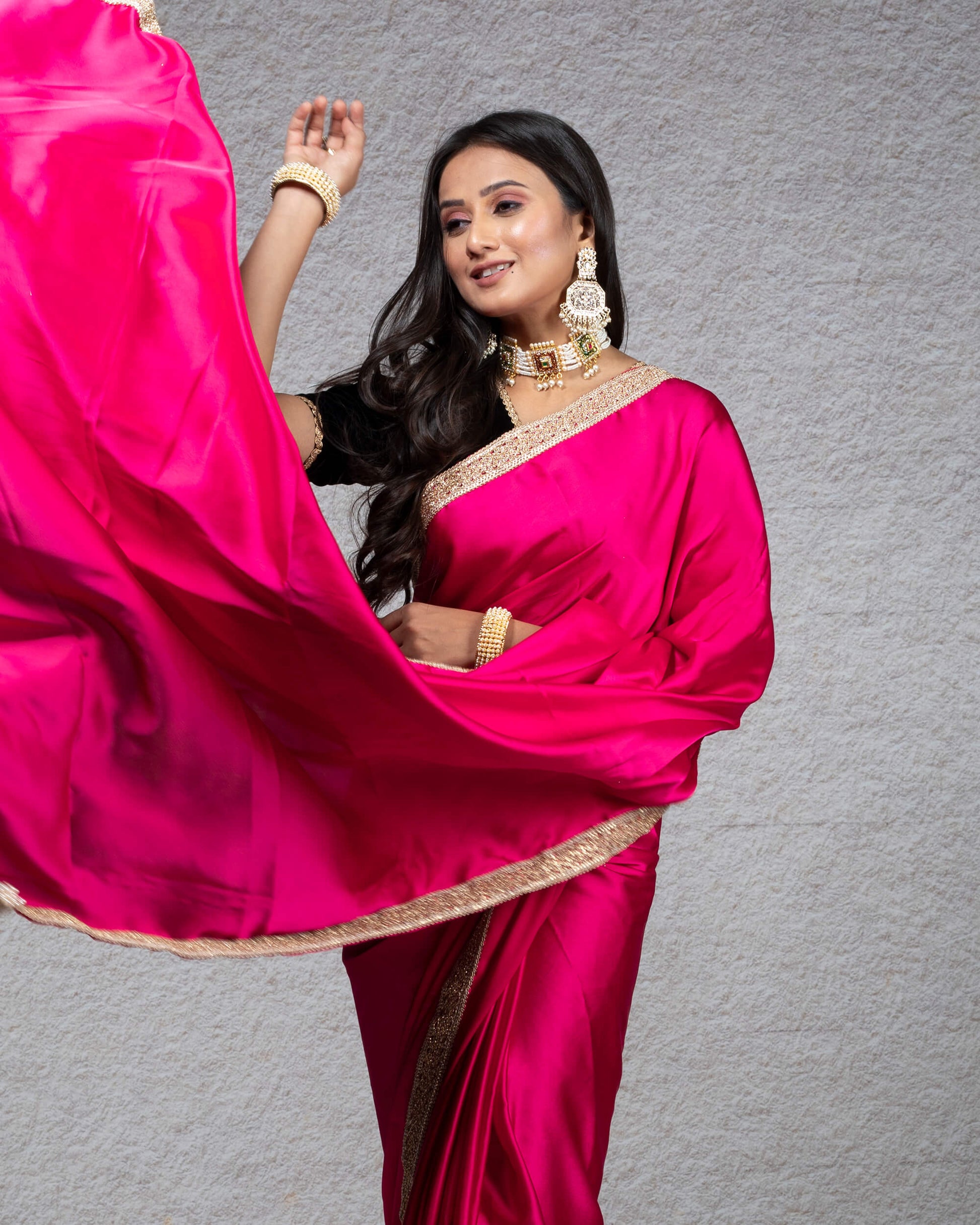 Cerise Pink Plain Japan Satin Saree With Zari Lace Border