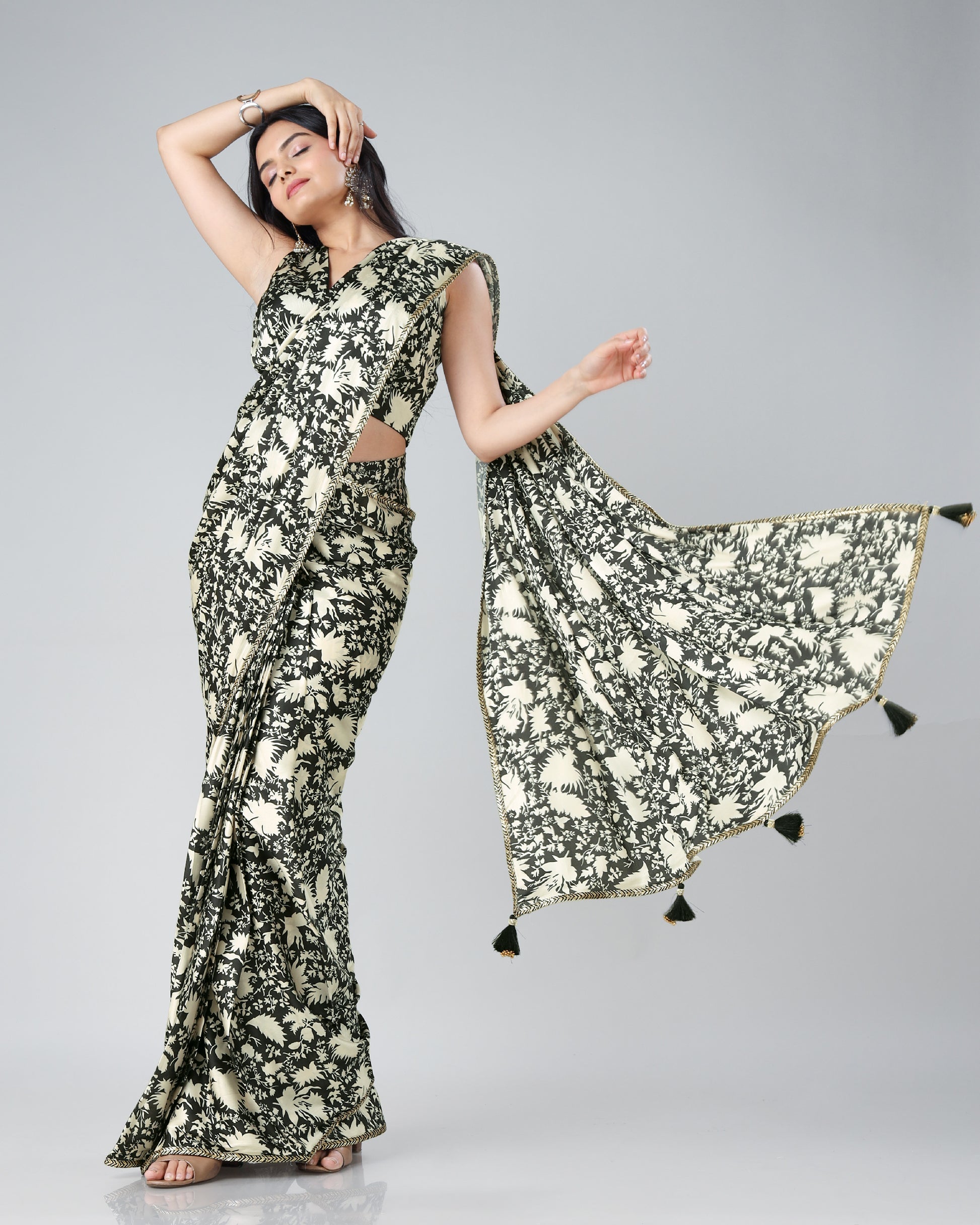 Introducing the perfect saree for the modern woman on the go - our stunning pre-draped chiffon satin sarees! Crafted from luxurious fabric that drapes beautifully, these sarees offer the timeless elegance of a saree with the ultimate convenience of effortless dressing. Don't let saree draping hold you back! Our pre-draped sarees are the perfect solution for busy women who want to embrace the saree's beauty without the hassle.