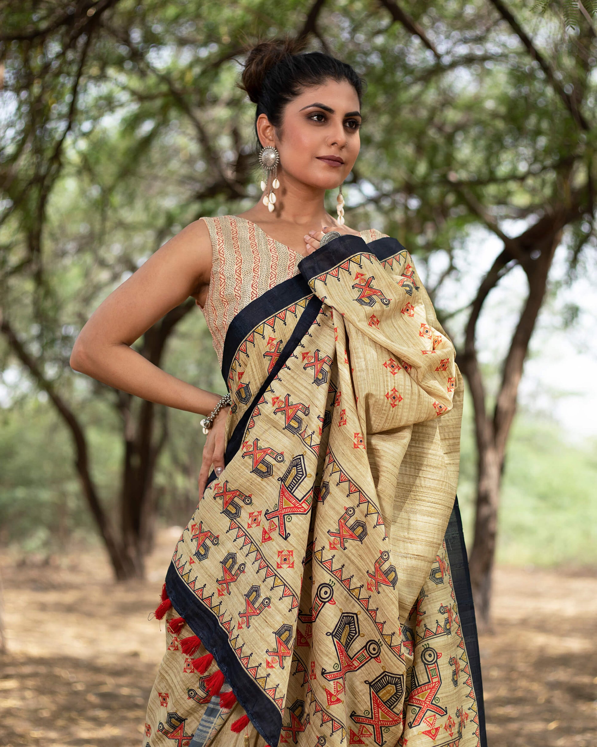 Ecru Beige And Red Madhuvanii Pattern Digital Print Art Tusser Silk Saree With Tassels