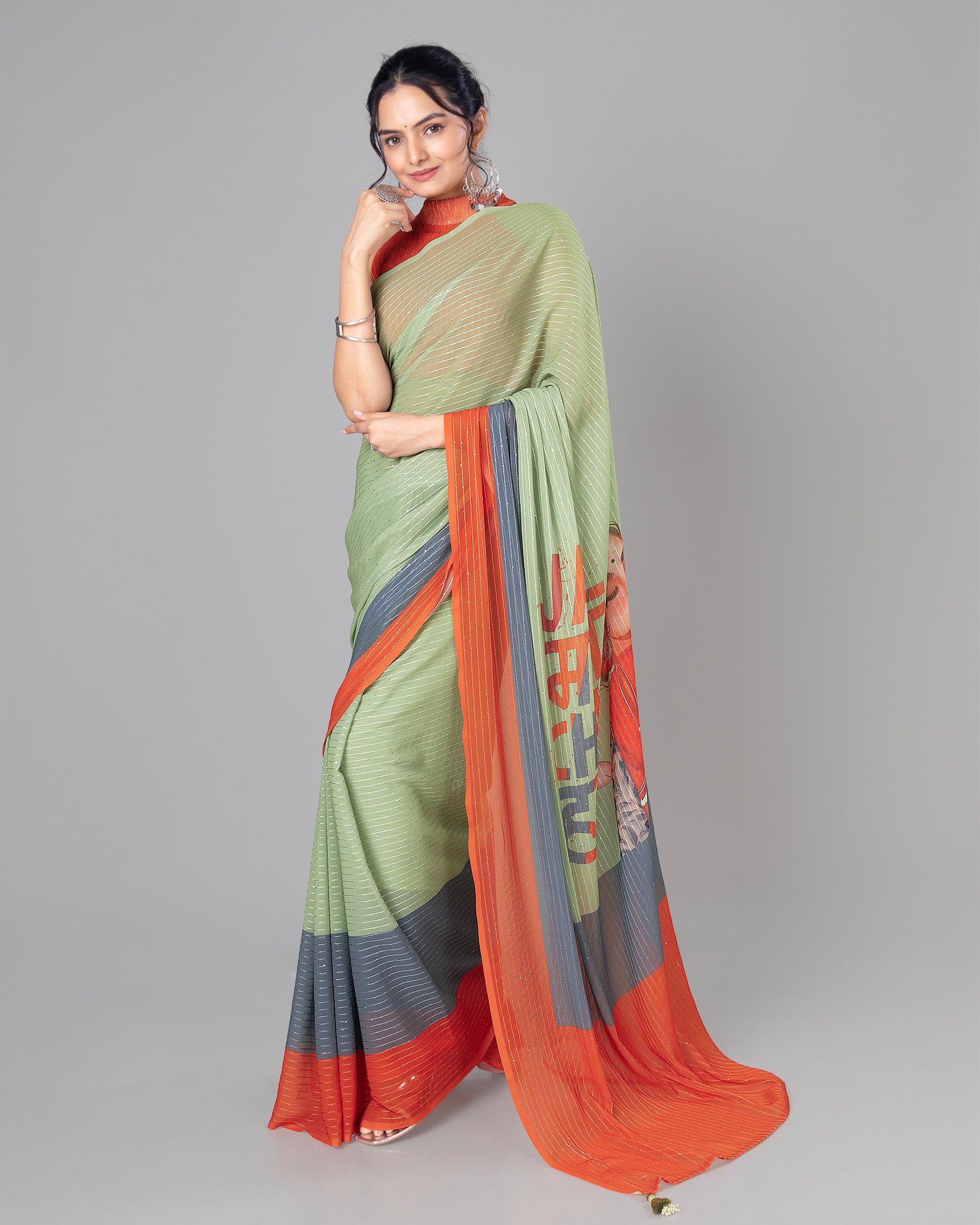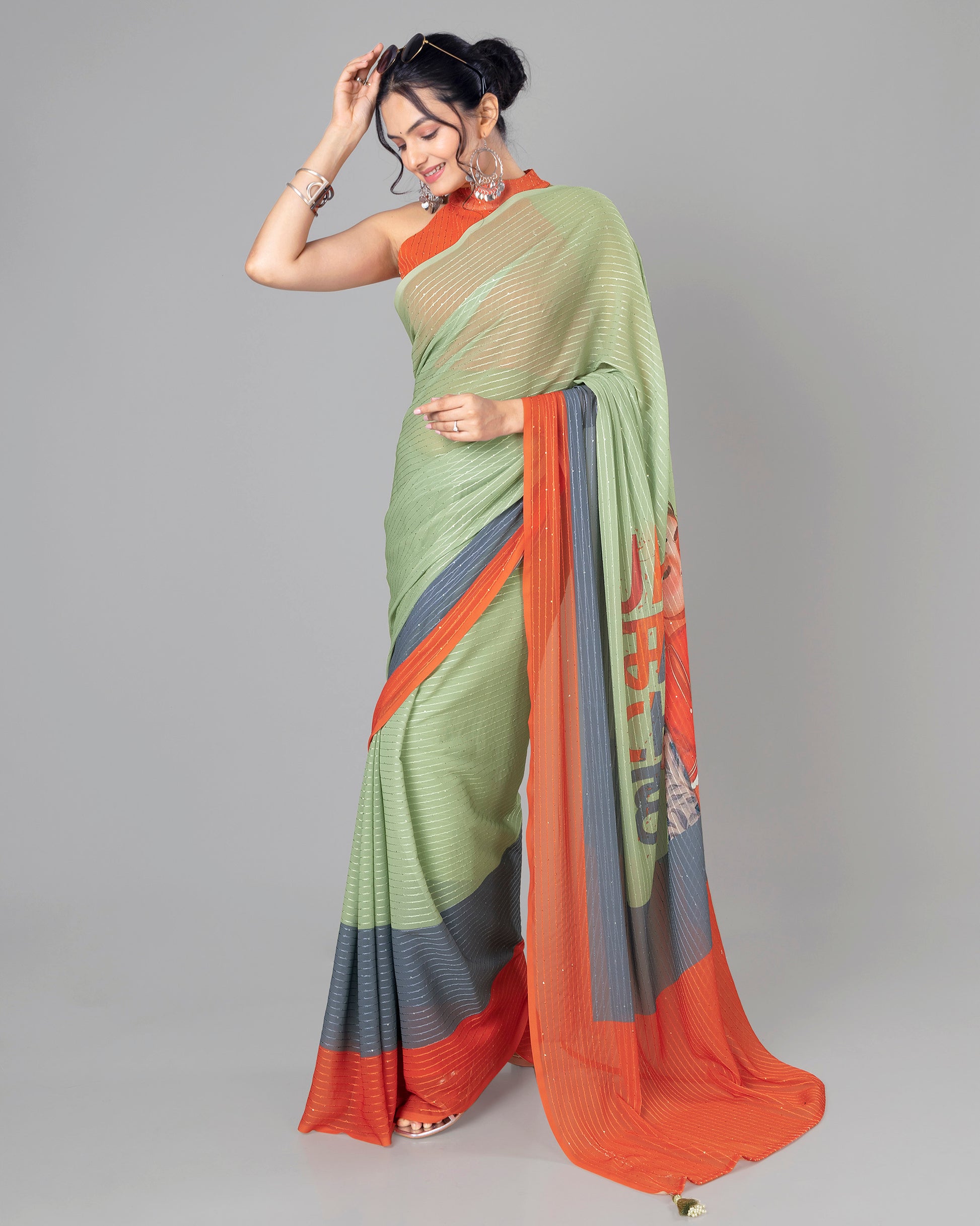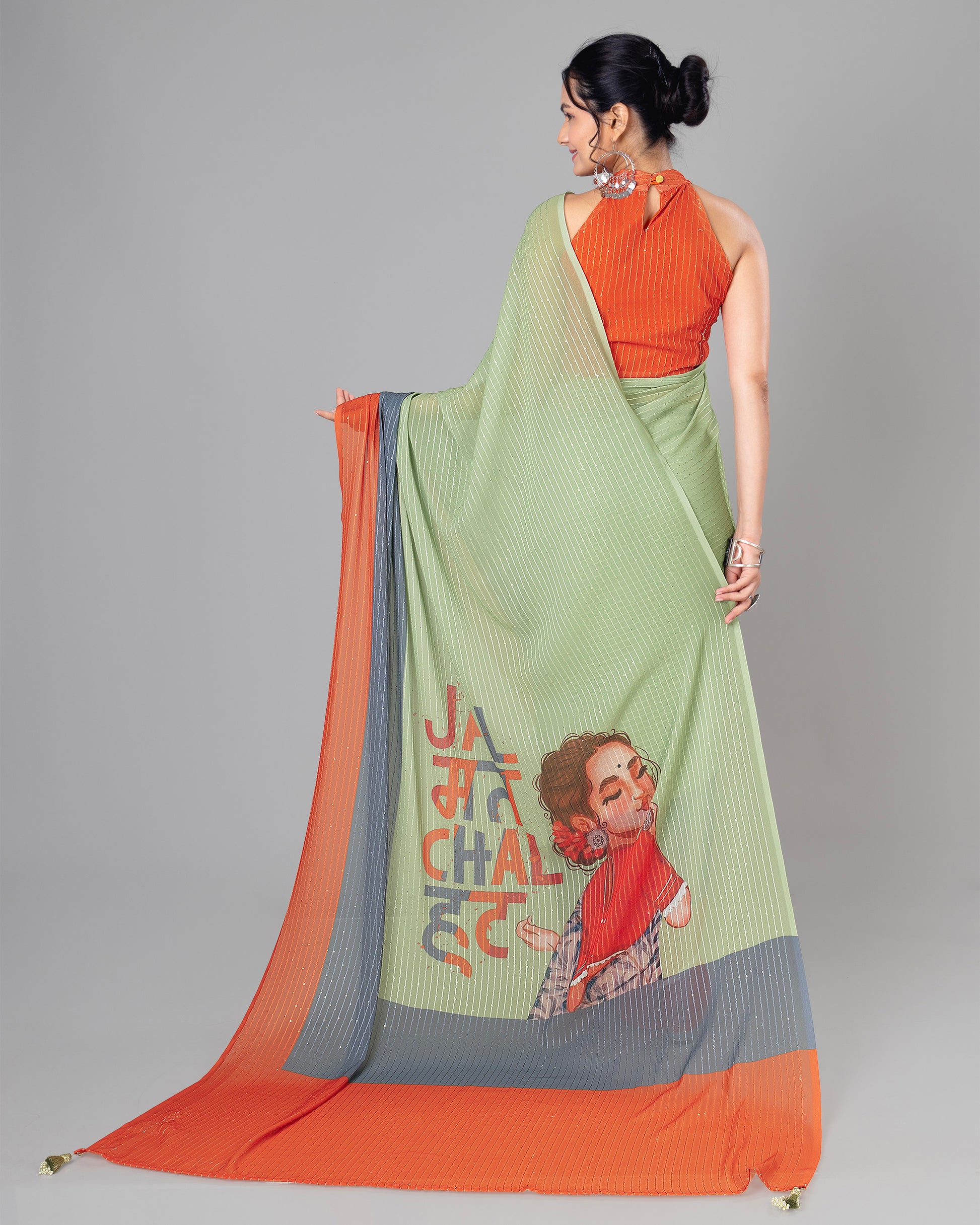 Up your style game with this exclusive designer saree! Made of gorgeous embroidery and featuring a stunning quirky design, you'll be ready to make a statement everywhere you go. Get ready to wow the crowd in this Bollywood-approved look!