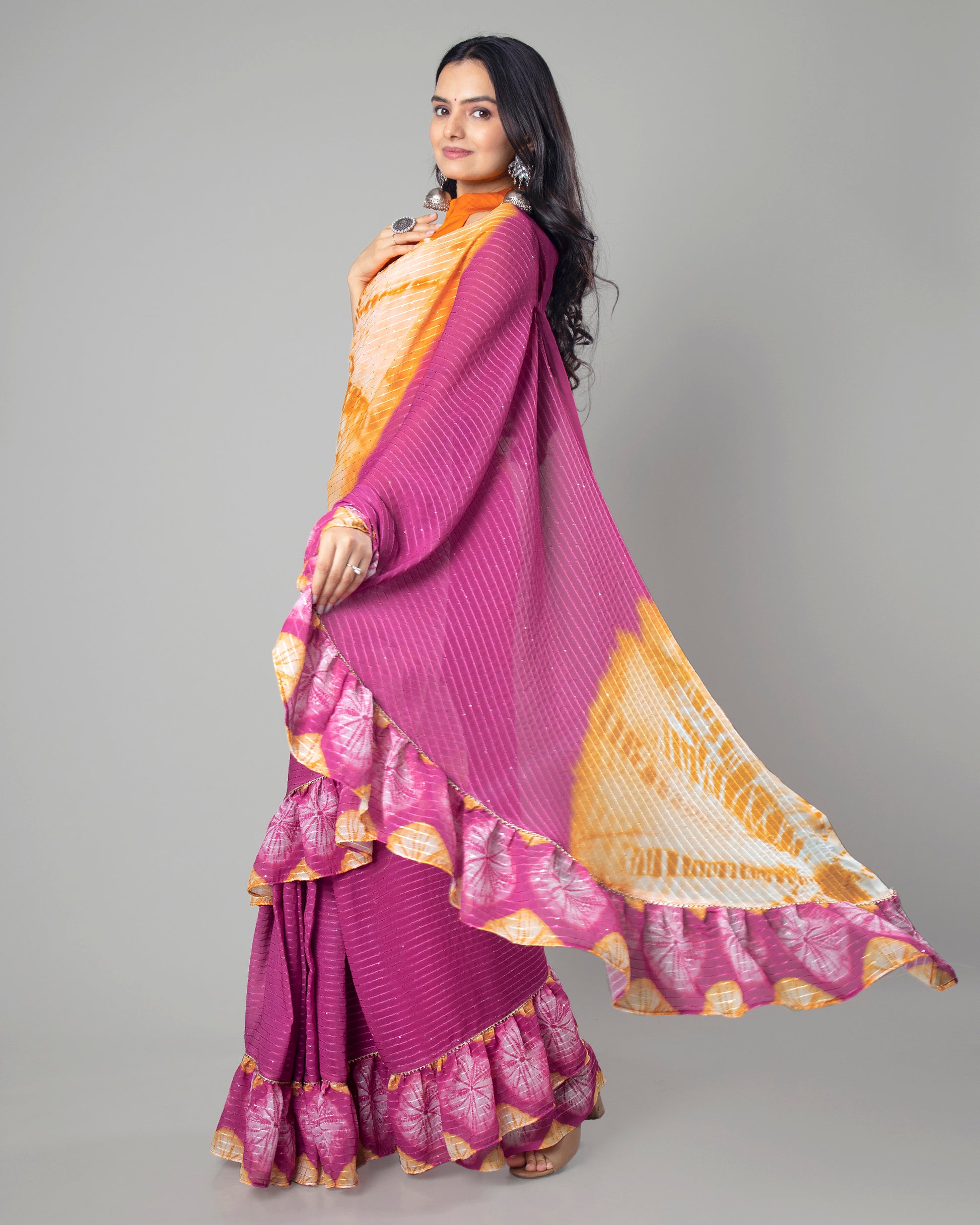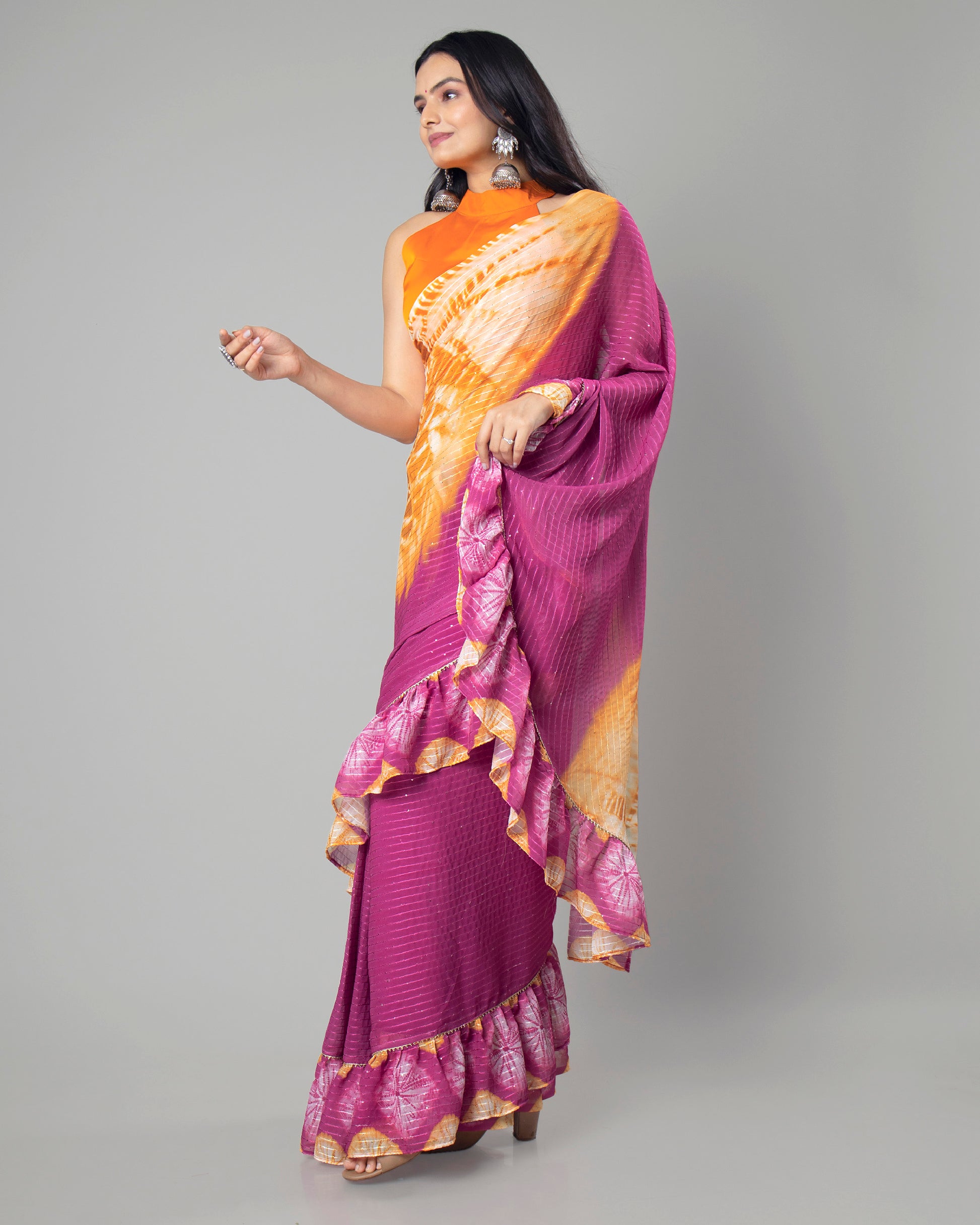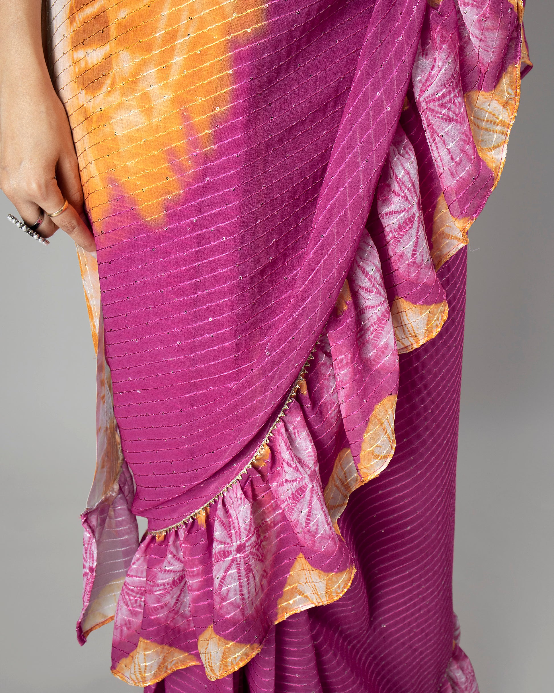 Ombre georgette squins Sarees are the best way to showcase your cultural looks on special occasions. It is a READY TO WEAR saree, making it easy for someone to drape even though they don't know how to wear a Saree and it is less time-consuming. Made with precision, these sarees when matched with your favorite blouses, will surely make your impression last forever. Make some space in your wardrobe for these sizzling sarees.
