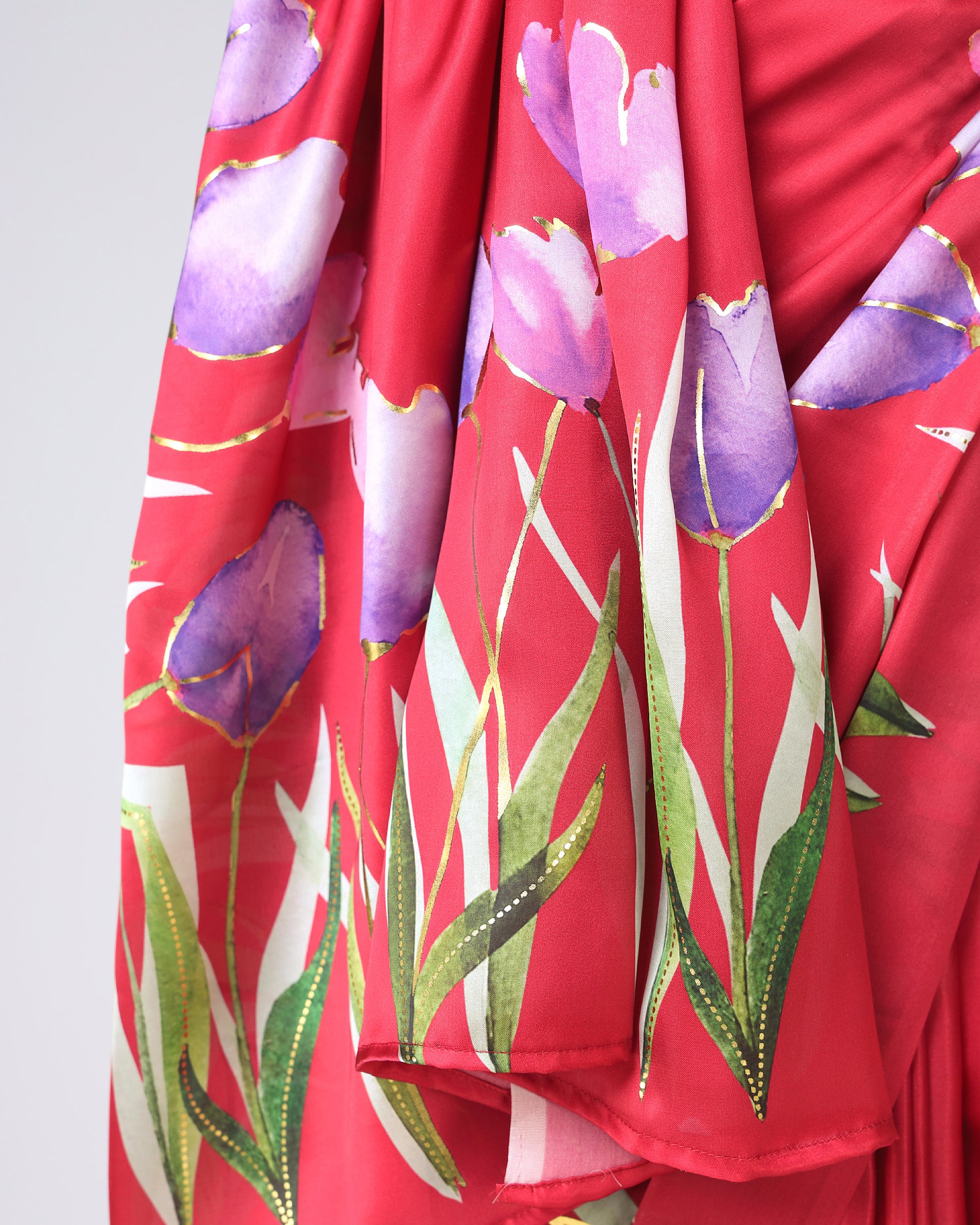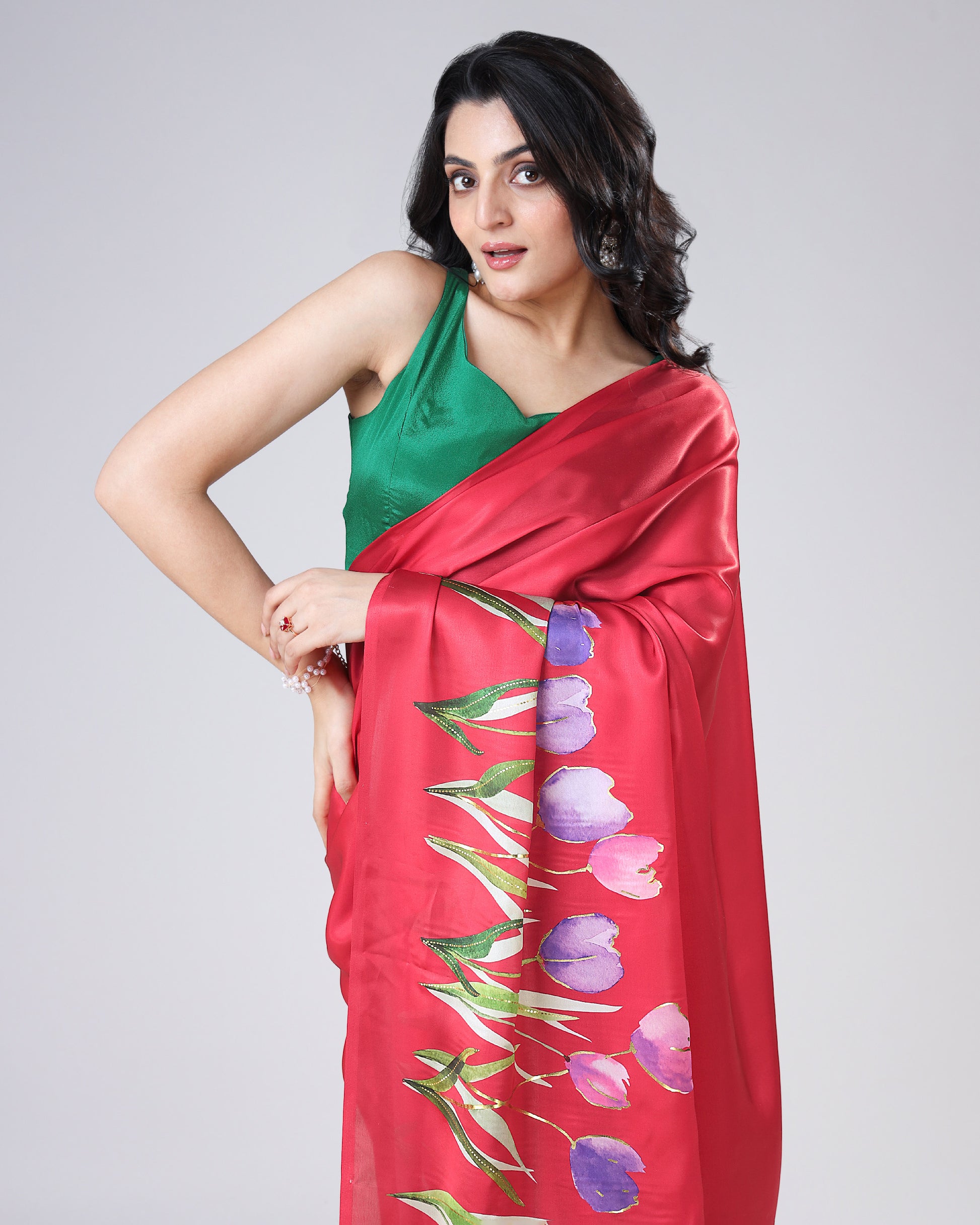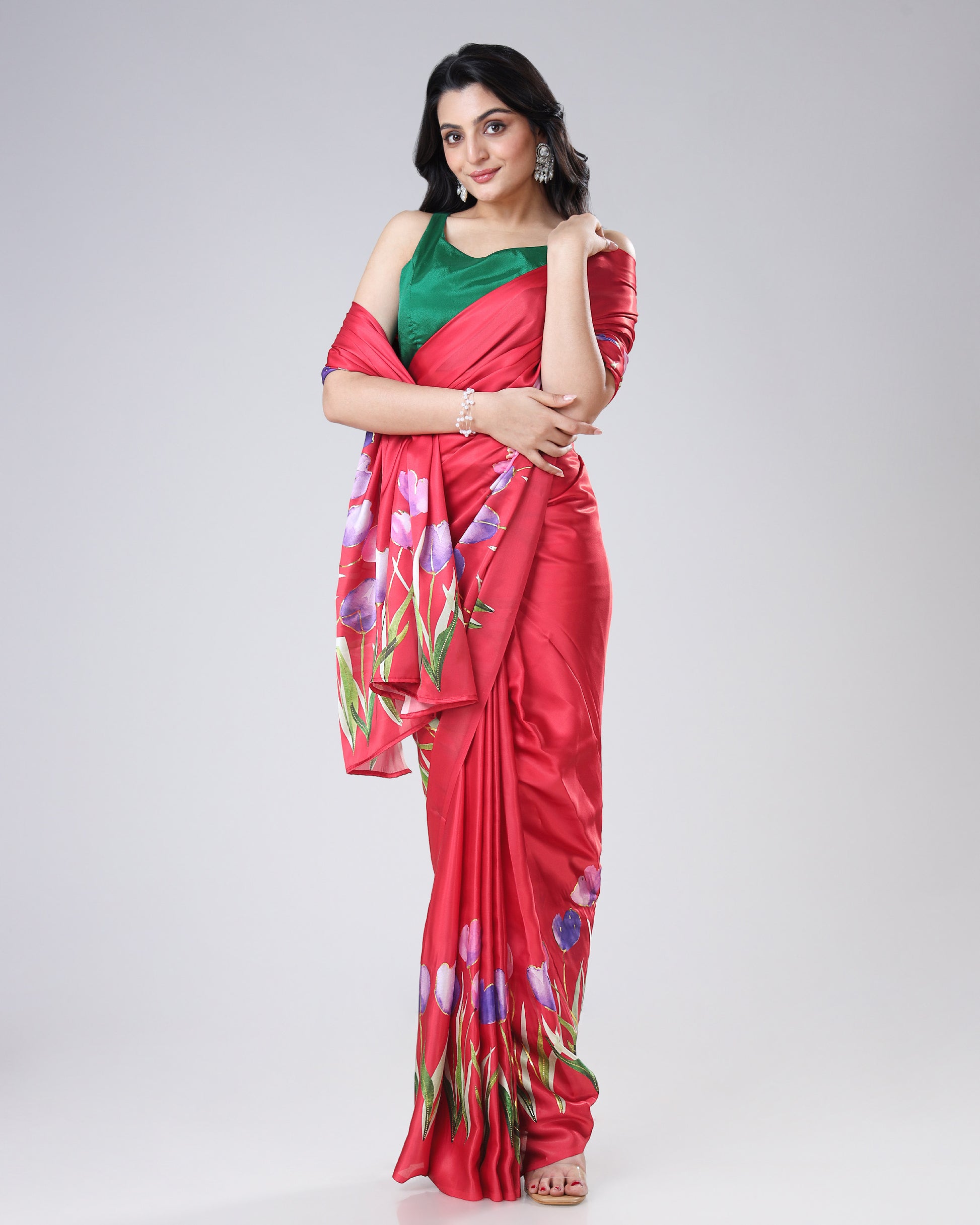 Indulge in luxury with this premium satin saree, crafted to drape you in elegance and comfort. The smooth satin fabric flows effortlessly, giving a radiant sheen with every move. Adorned with foil work on delicate prints, it brings a subtle shimmer that elevates your look for festive occasions, weddings, or evening soirees.