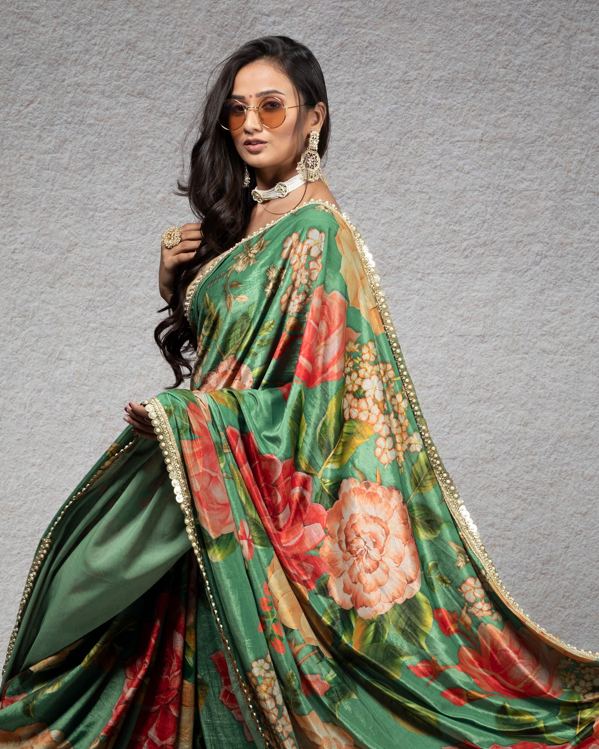 Fern Green And Pink Floral Pattern Digital Print Premium Velvet Saree With Zari Sequins Pearl Work Lace Border