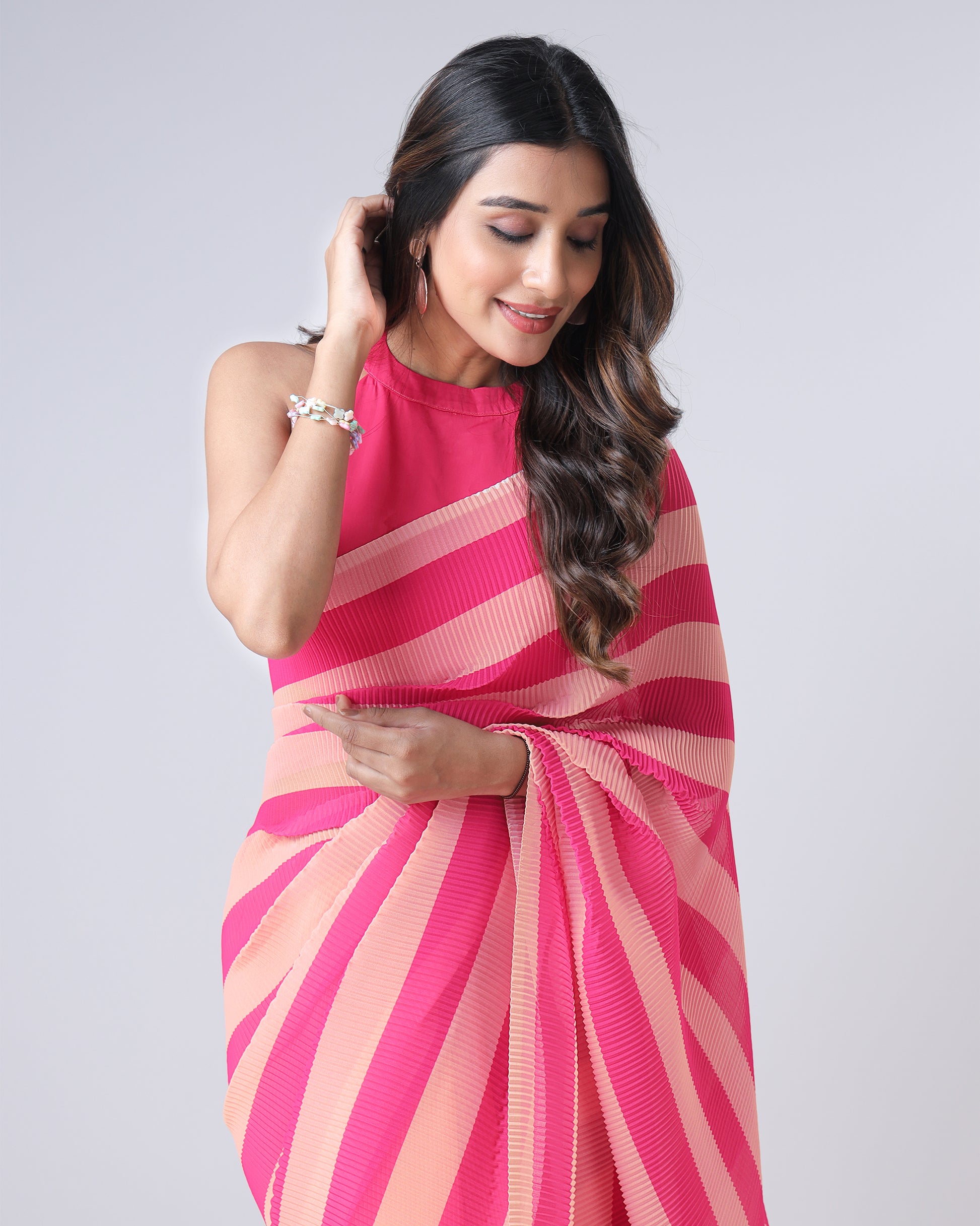 Discover versatility like never before with our Two-Way Wearable Pleated Saree. This innovative design allows you to switch up your look effortlessly, offering two stunning styles in one saree. The finely crafted pleats add structure and elegance, while the lightweight Georgette fabric ensures comfort all day long. For the woman who seeks versatility, the Two-Way Wearable Pleated Saree is your perfect match, transform your style with just a flip!